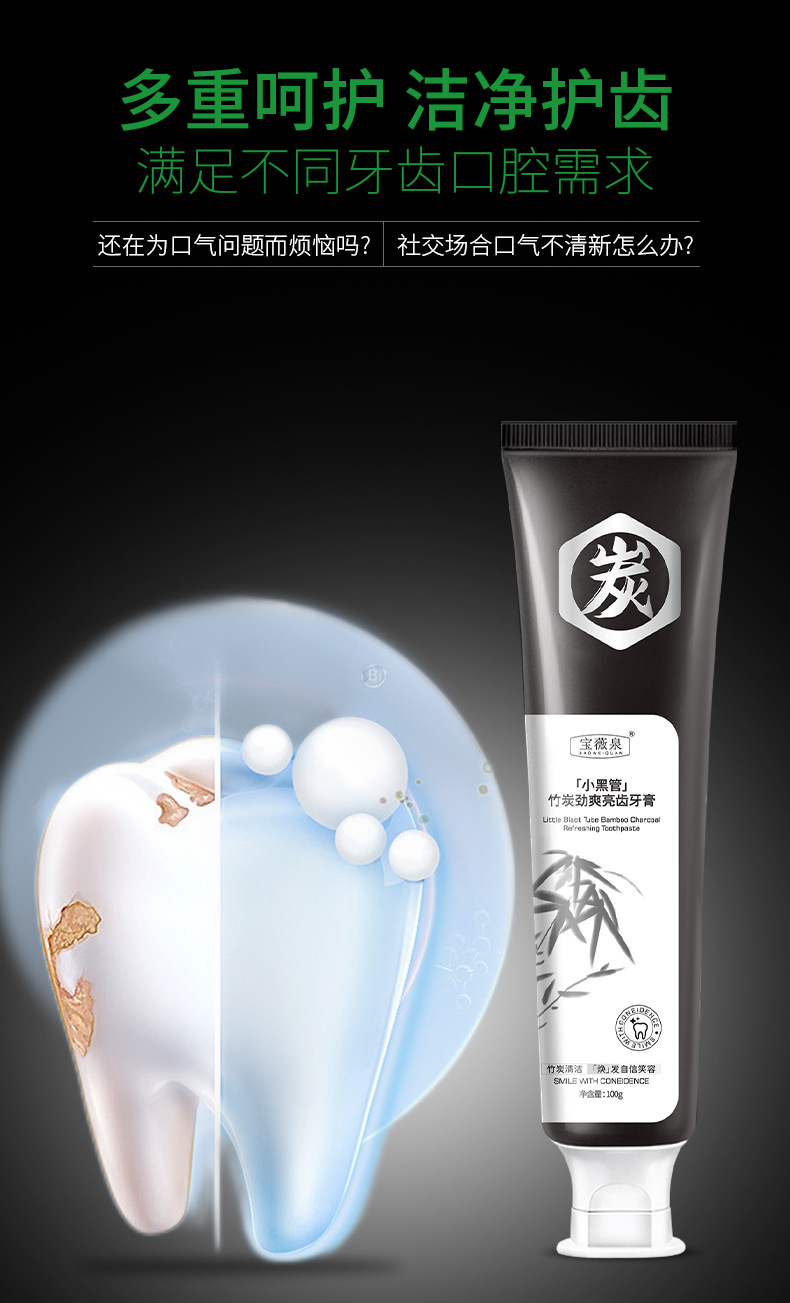 Bao Wei Quan 작은 검은 색 튜브 대나무 숯 치약은 노란색, 깨끗하고 흰색을 제거하여 연기 얼룩, 신선한 호흡 및 관리 구강 공장 재고 도매스토어 가기