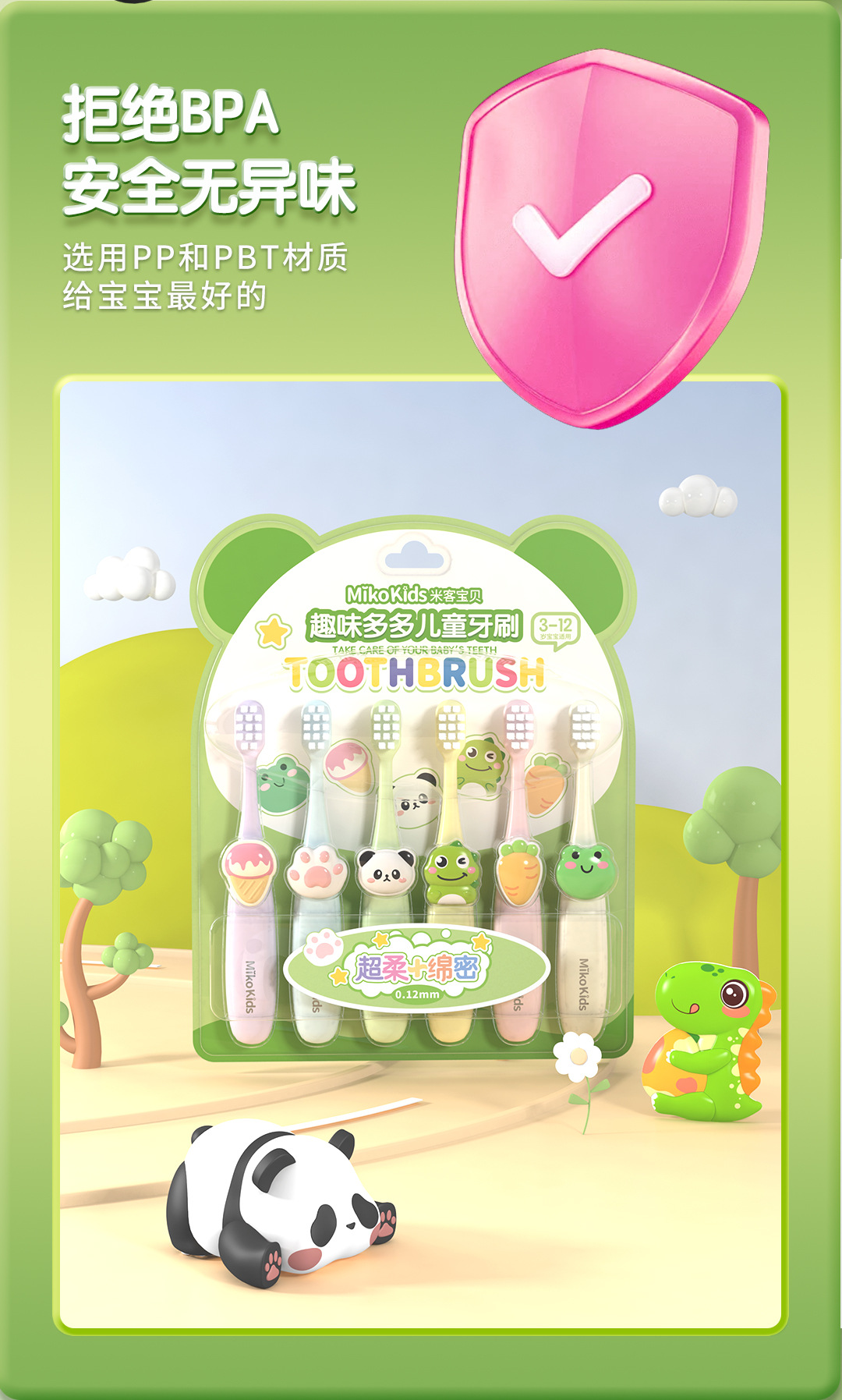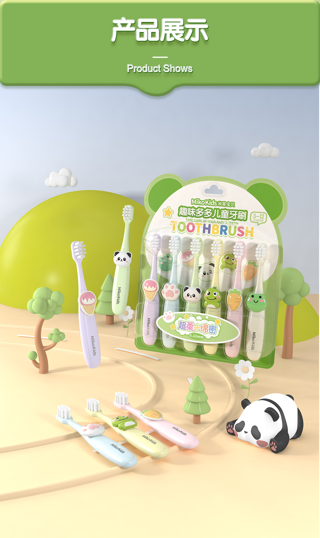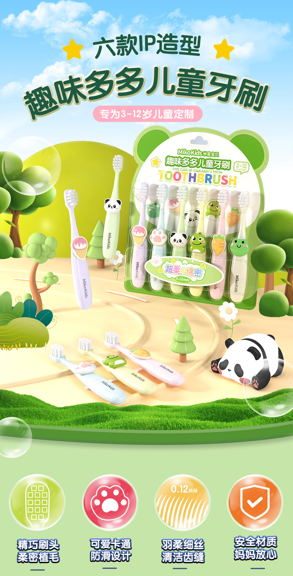 어린이 부드러운 강모 칫솔 제조 업체 도매 귀여운 만화 IP 모델링 사각형 구멍 머리 청소 치깅 보호 6 팩