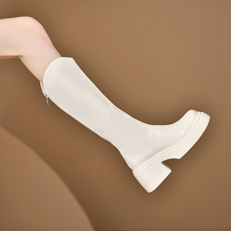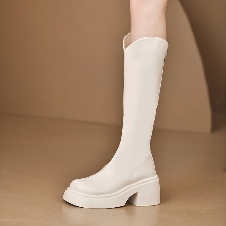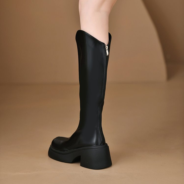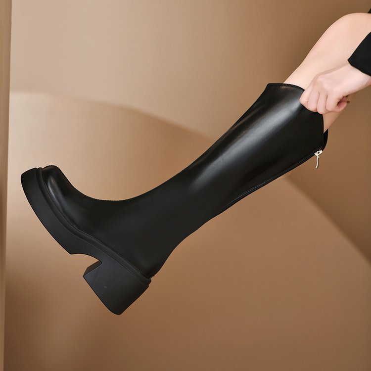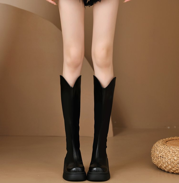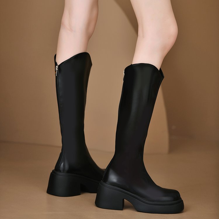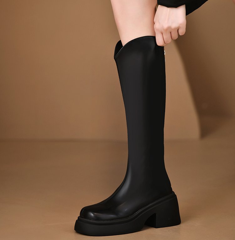 인터넷 축하 두꺼운 바닥 부츠 여성의 2024 가을 겨울 새로운 하이힐 V-입 리어 지퍼 소프트 가죽 유행 라이더 스모크 부츠