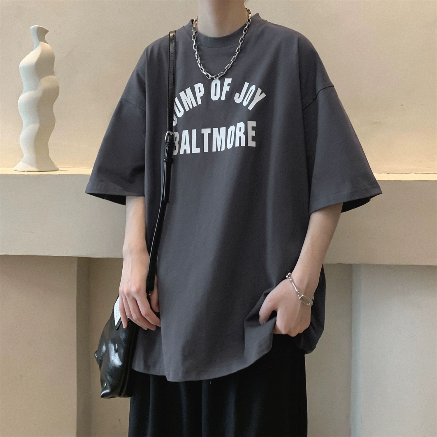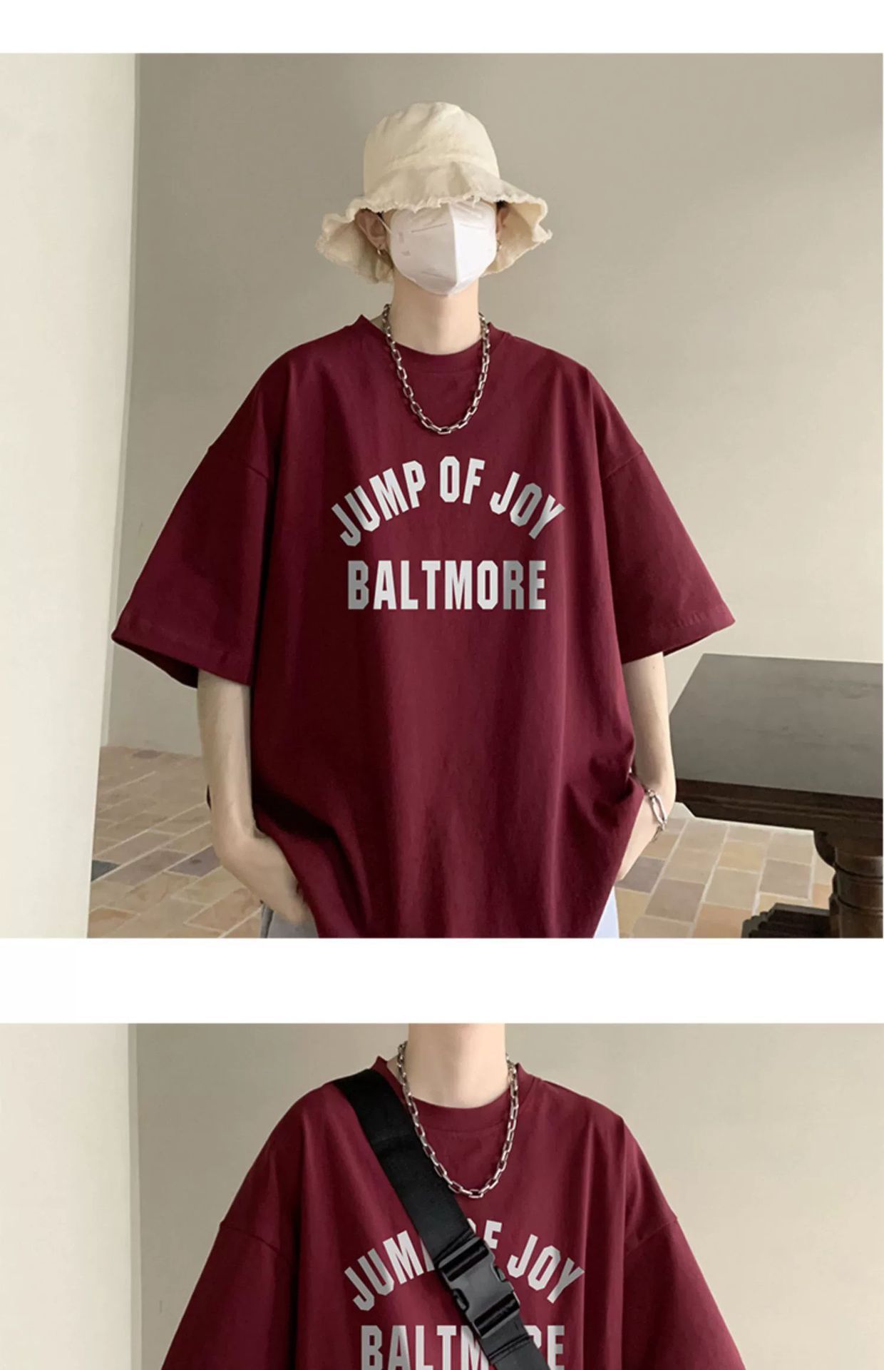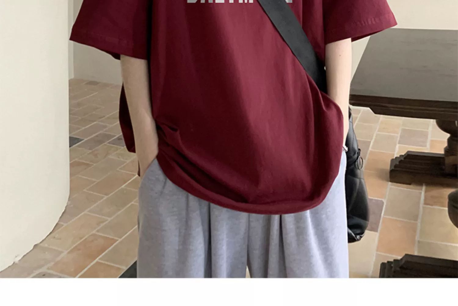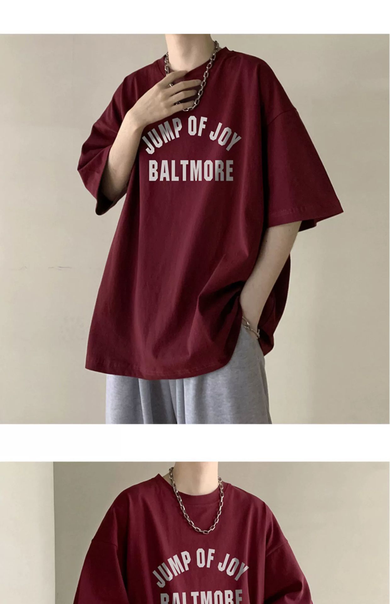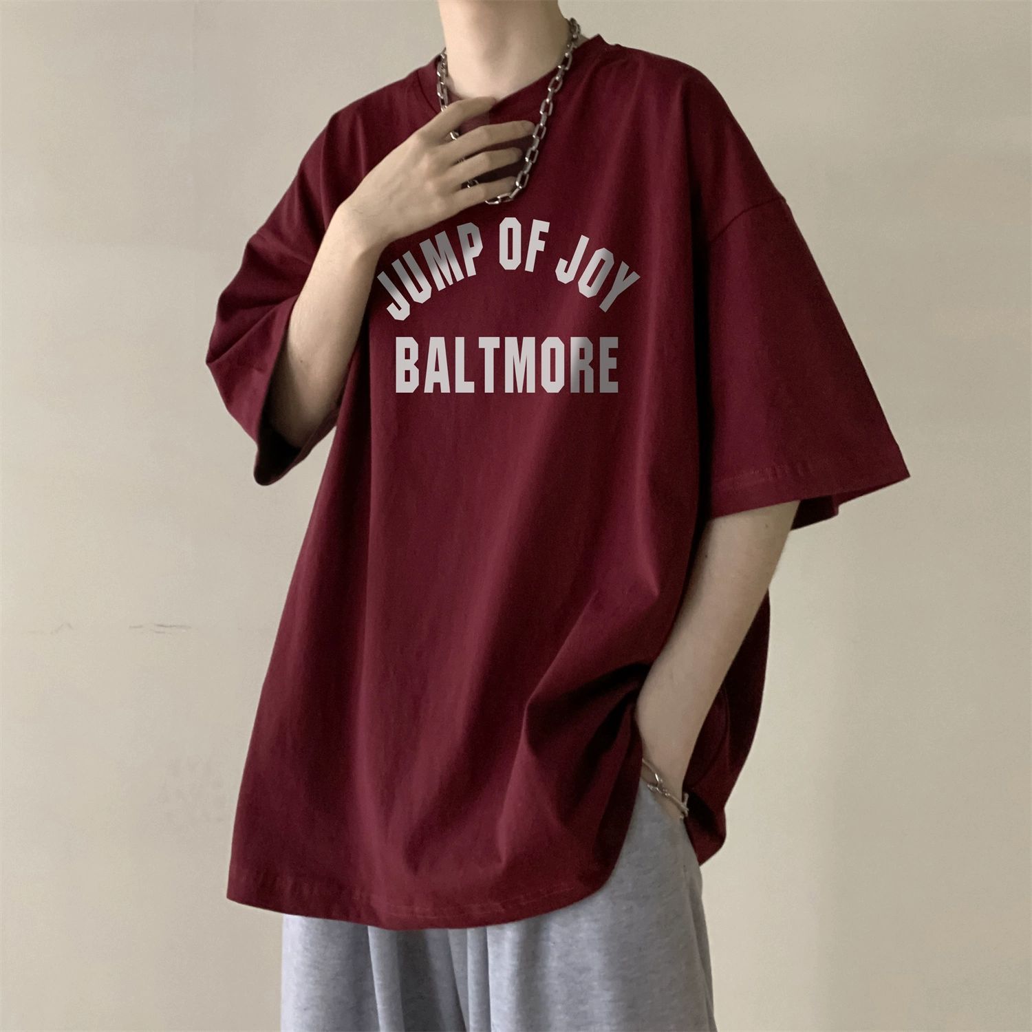 버건디 아메리칸 스타일 하이 스트리트 반팔 티셔츠 남성 패셔너블 브랜드 여름 세븐 슬리브 헤비 웨이트 의류 유행 퓨어 코튼 탑스토어 가기
