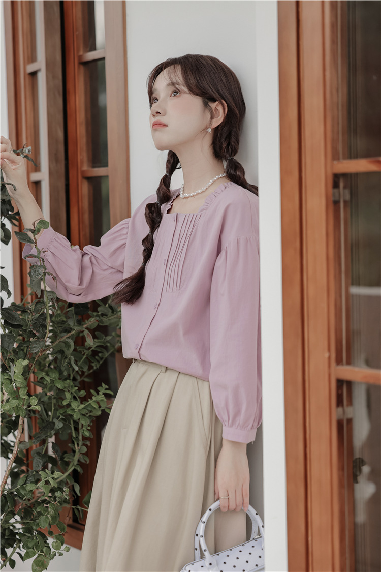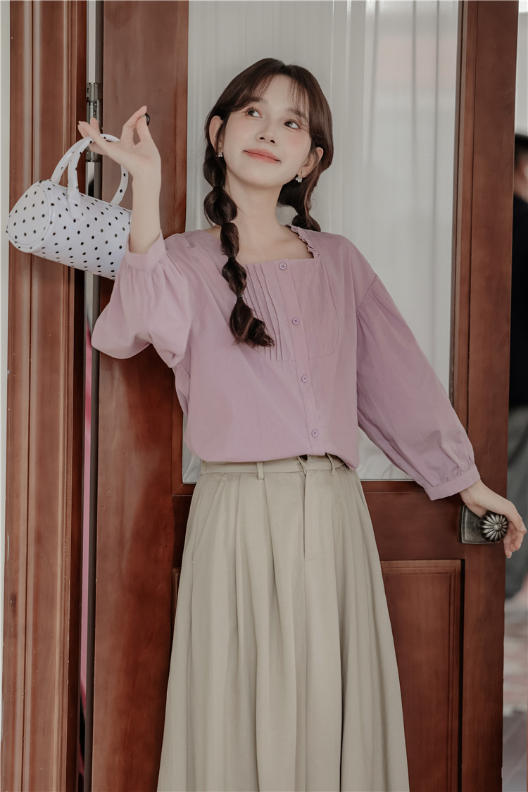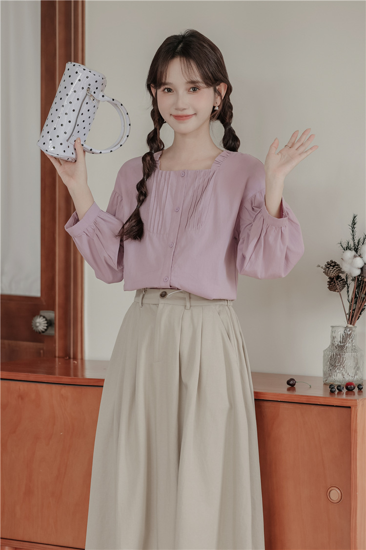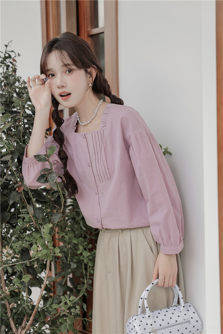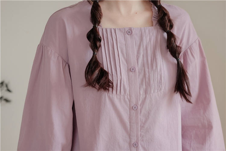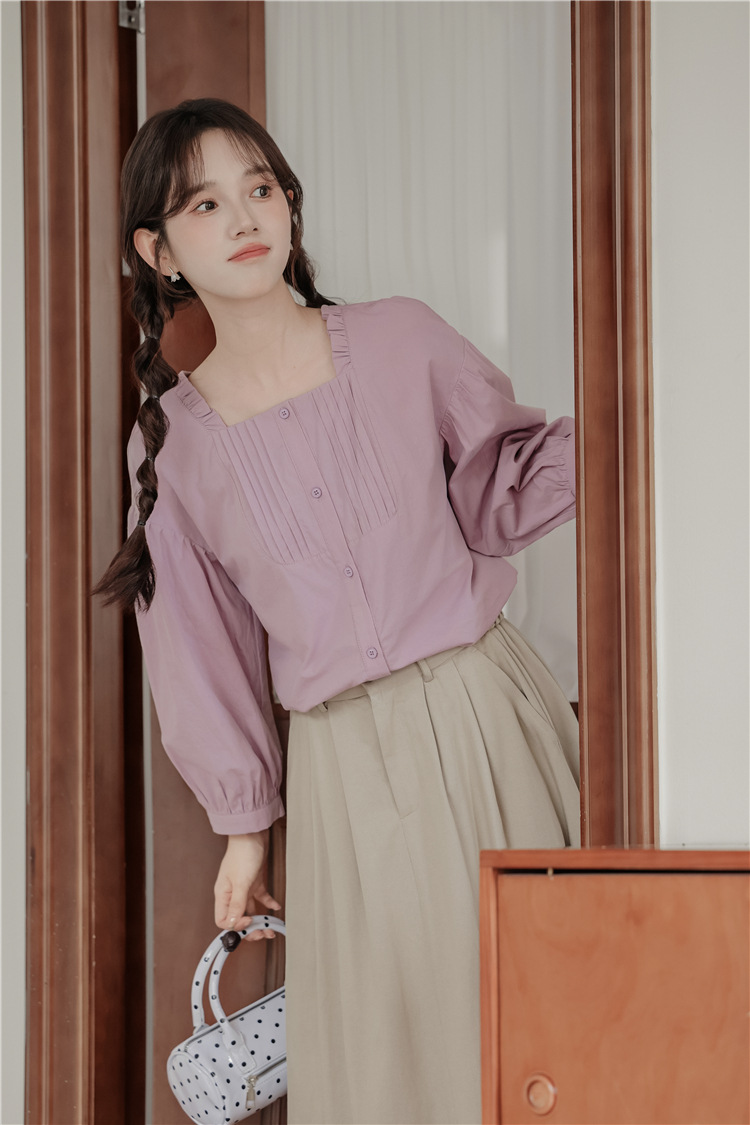 가을 2024 년 새로운 프렌치 퍼플 세련된 달콤한 스퀘어 칼라 9 포인트 슬리브 랜턴 슬리브 셔츠