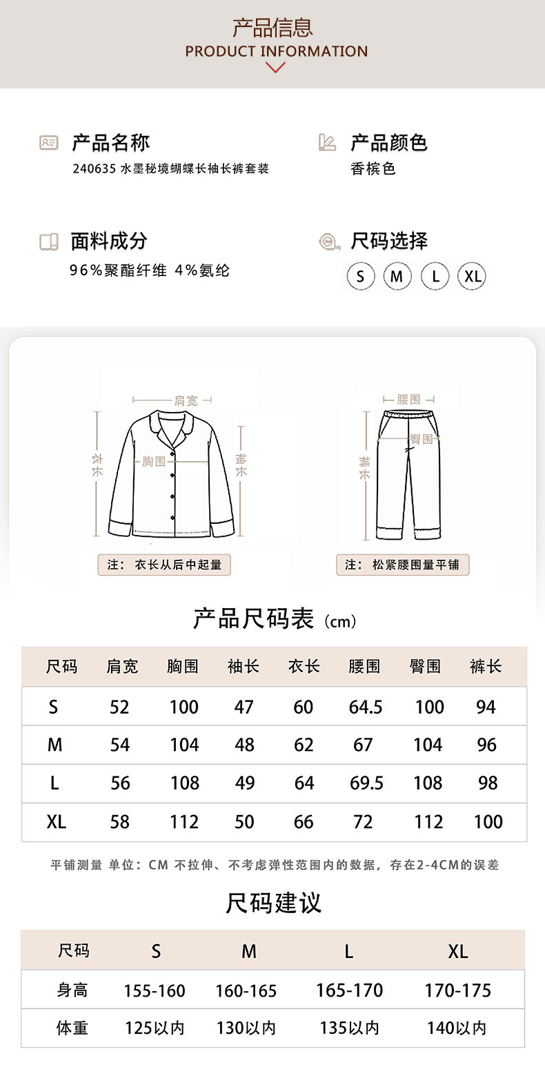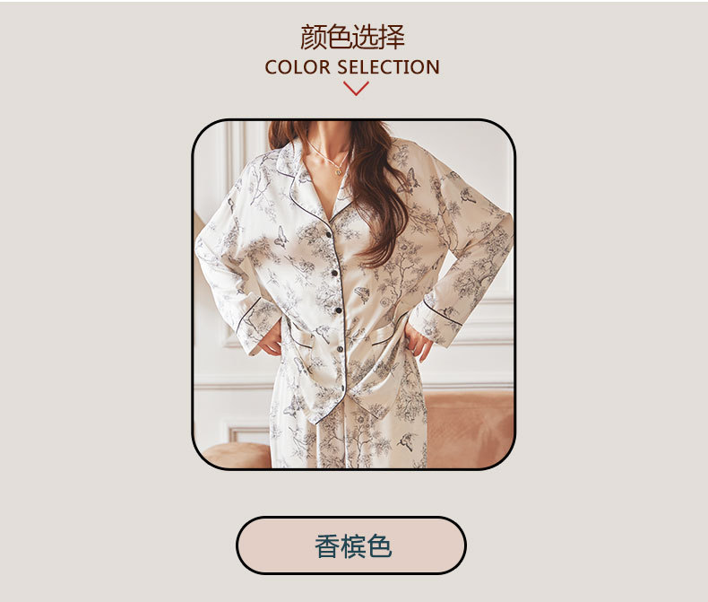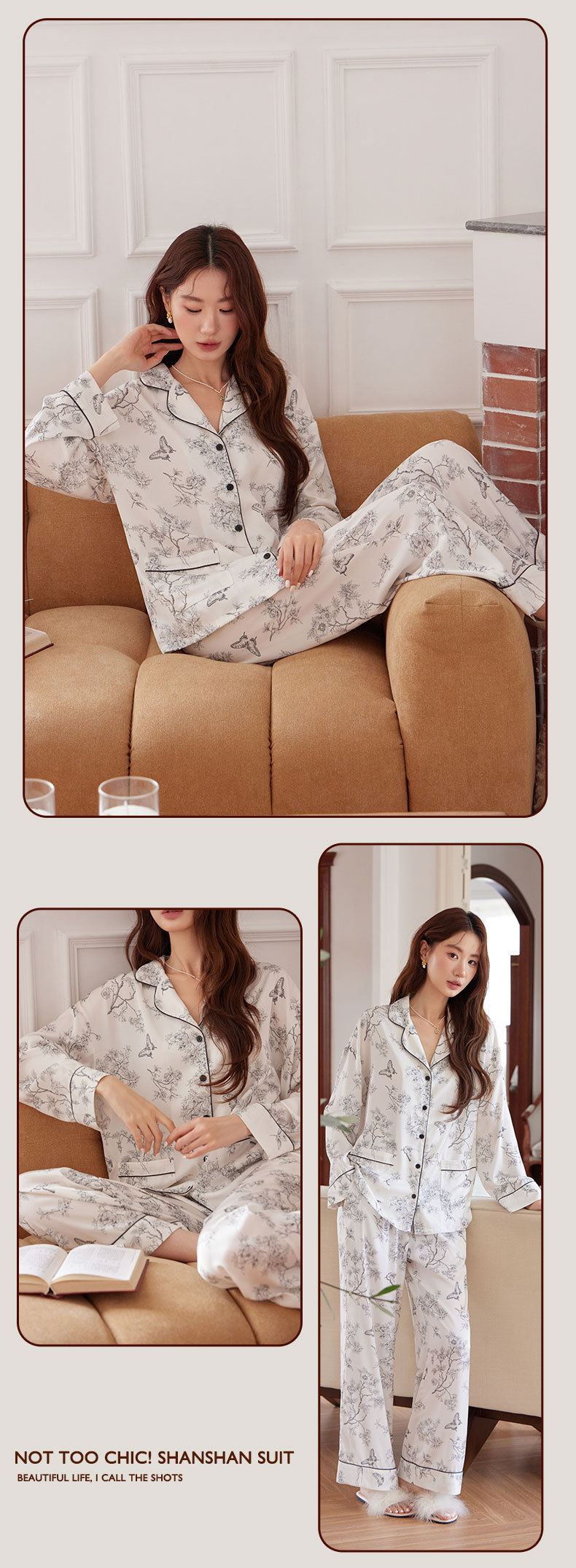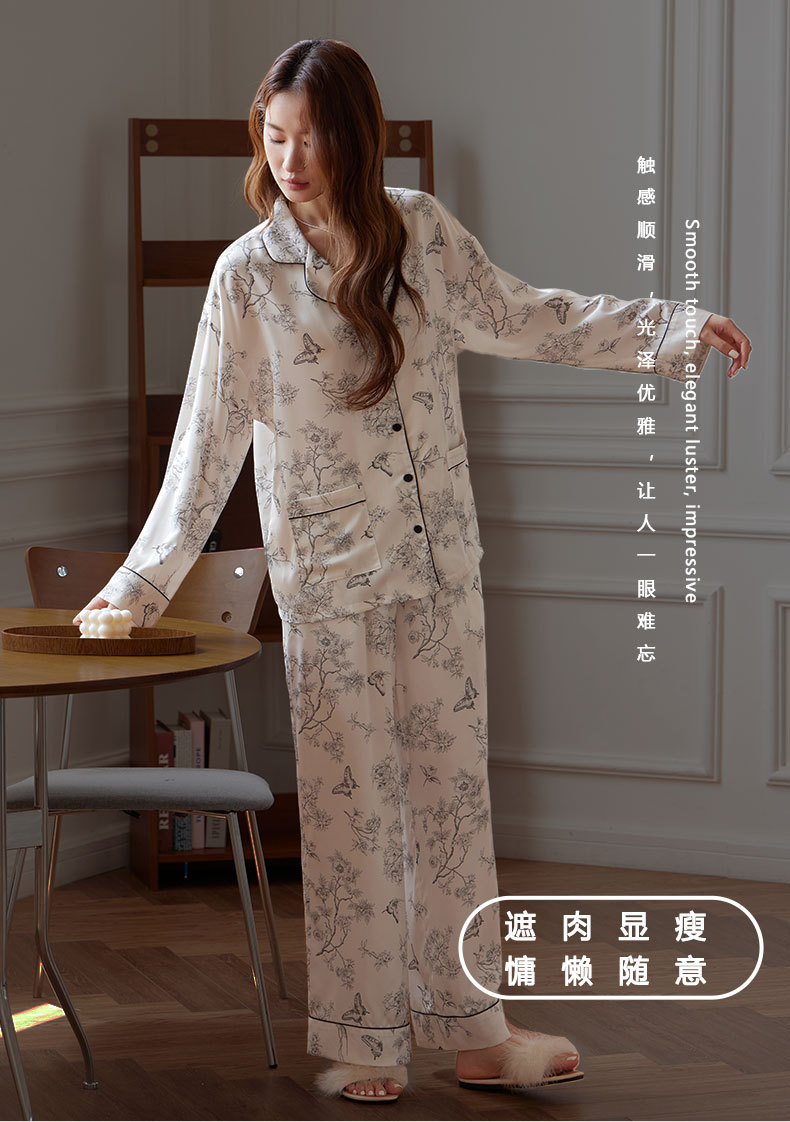 Guofeng 잉크 나비 새로운 인쇄 된 잠옷 여성용 긴 소매 바지 카디건 우유 실크 홈 의류 세트 도매