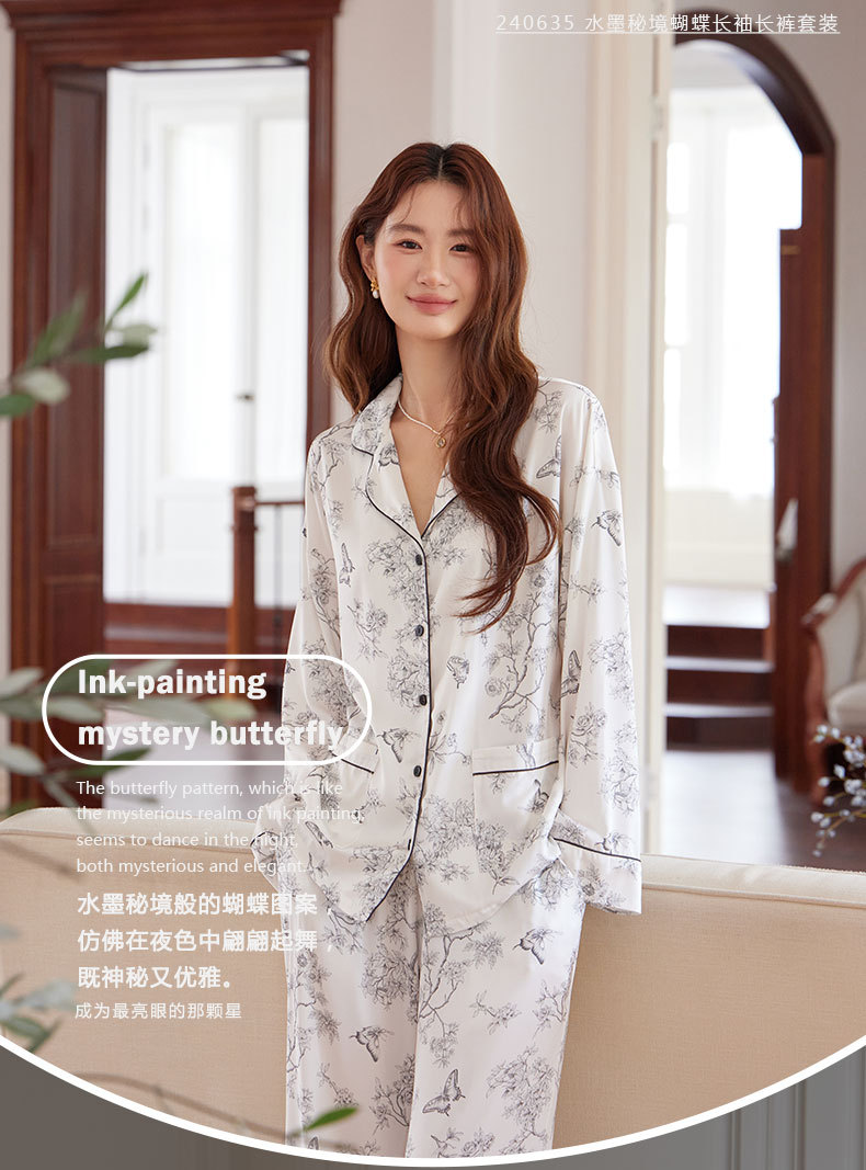 Guofeng 잉크 나비 새로운 인쇄 된 잠옷 여성용 긴 소매 바지 카디건 우유 실크 홈 의류 세트 도매스토어 가기