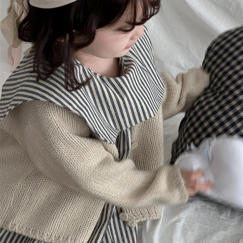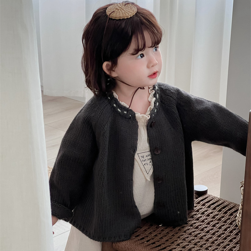 Xi Fan 2024 가을 새 한국 어린이 두꺼운 바늘 크루 넥 스웨터 솔리드 컬러 니트 카디건 재킷