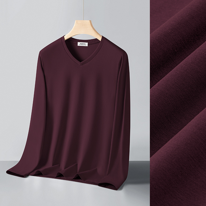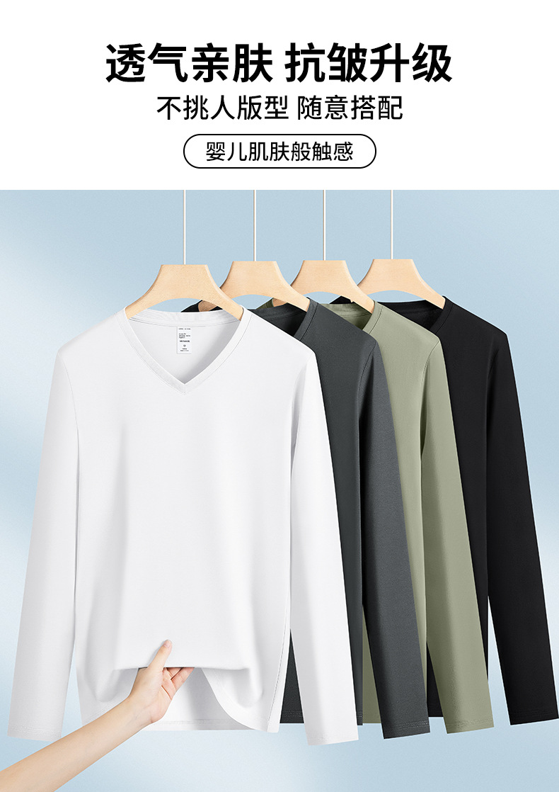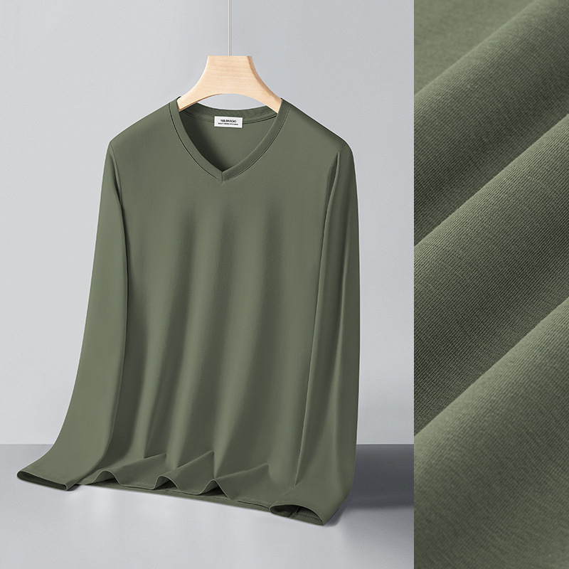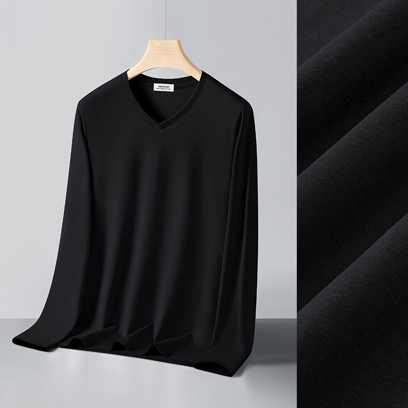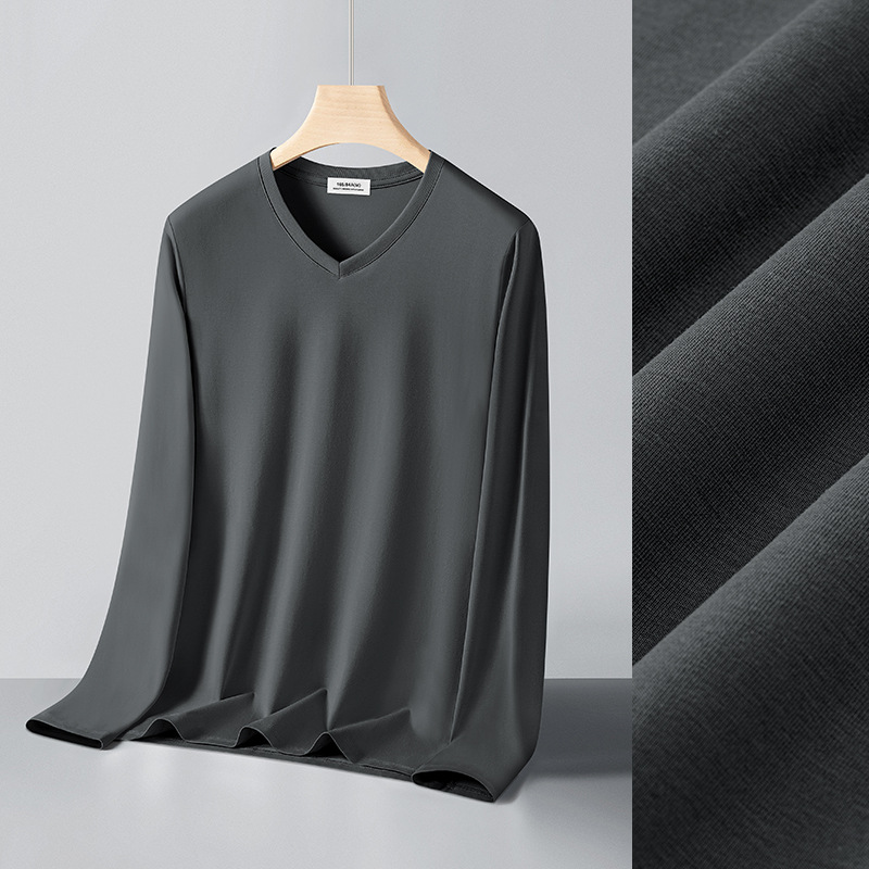 Mercerized modal 긴 소매 v-neck 티셔츠 2025 가을과 봄 슬림 다재다능한 단색 남성 밑바닥 셔츠 공장 아울렛스토어 가기