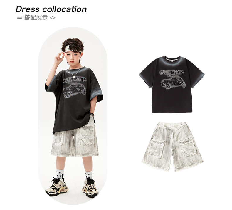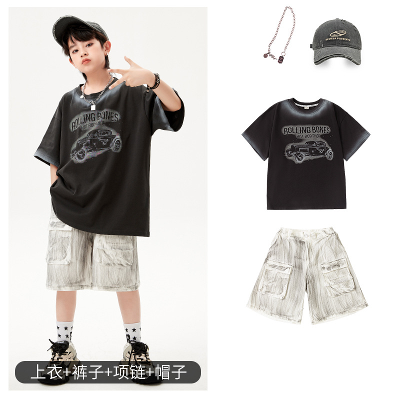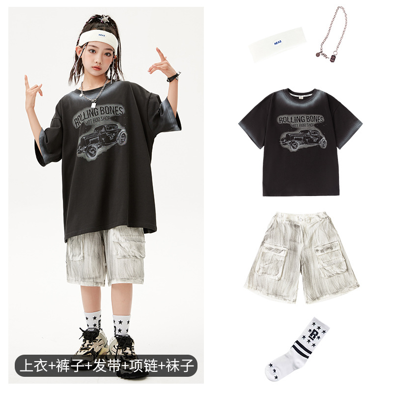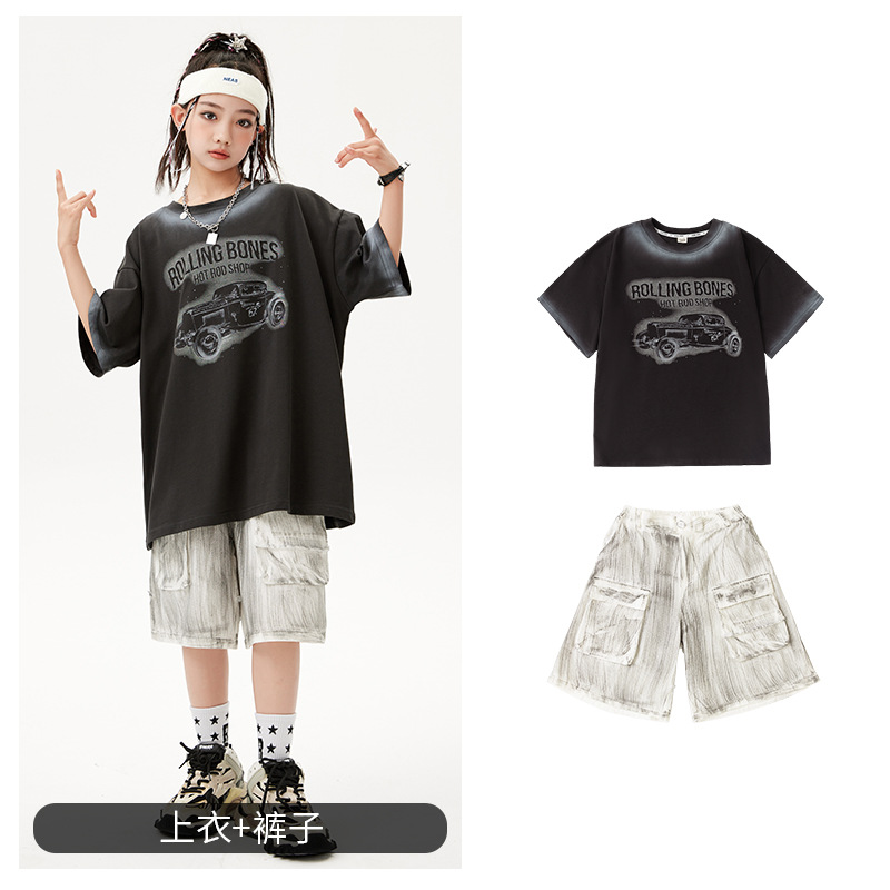 어린이 힙합 의상 소년 레트로 반팔 세트 걸스 쿨 재즈 패션 의상 힙합 쇼 의상 여름스토어 가기