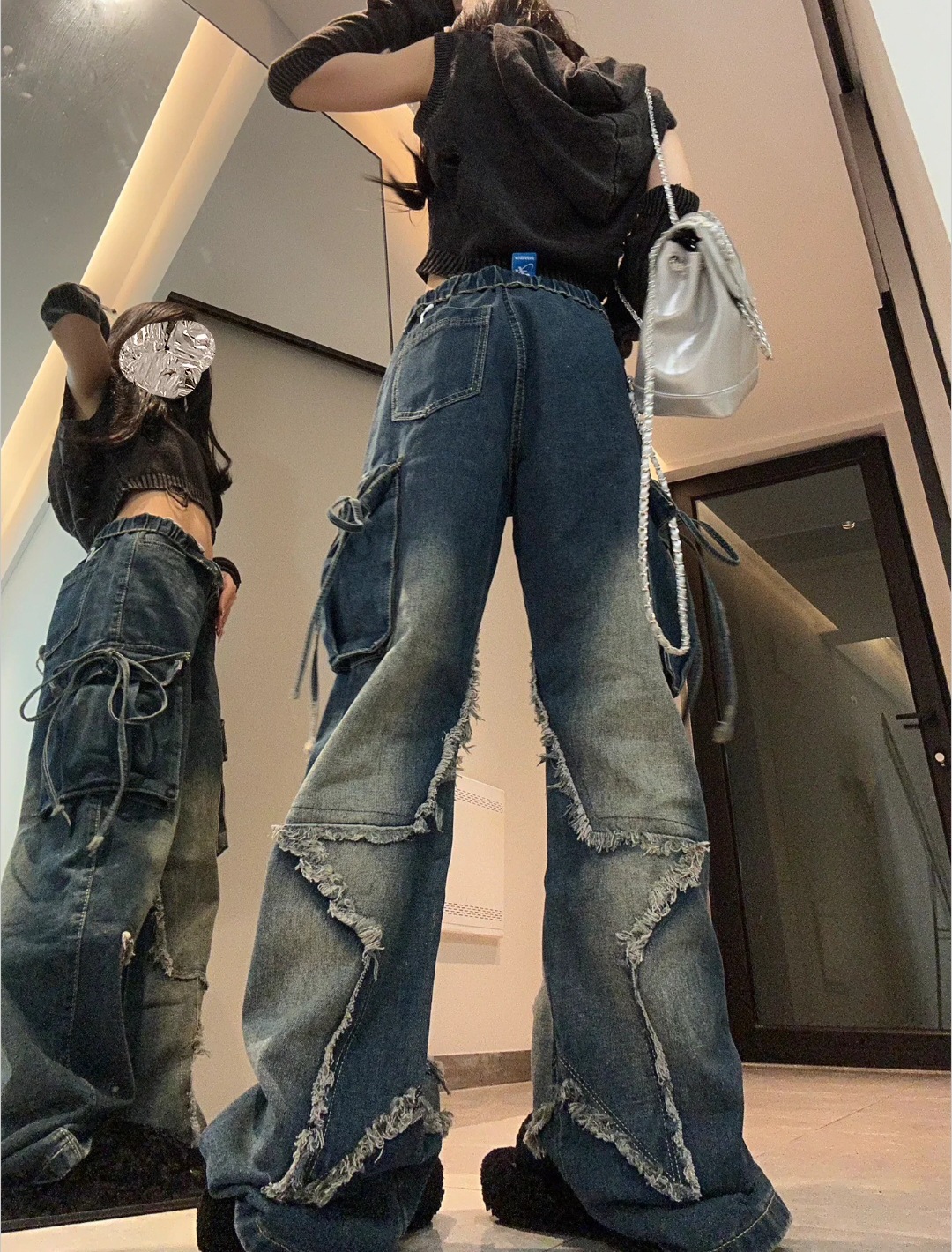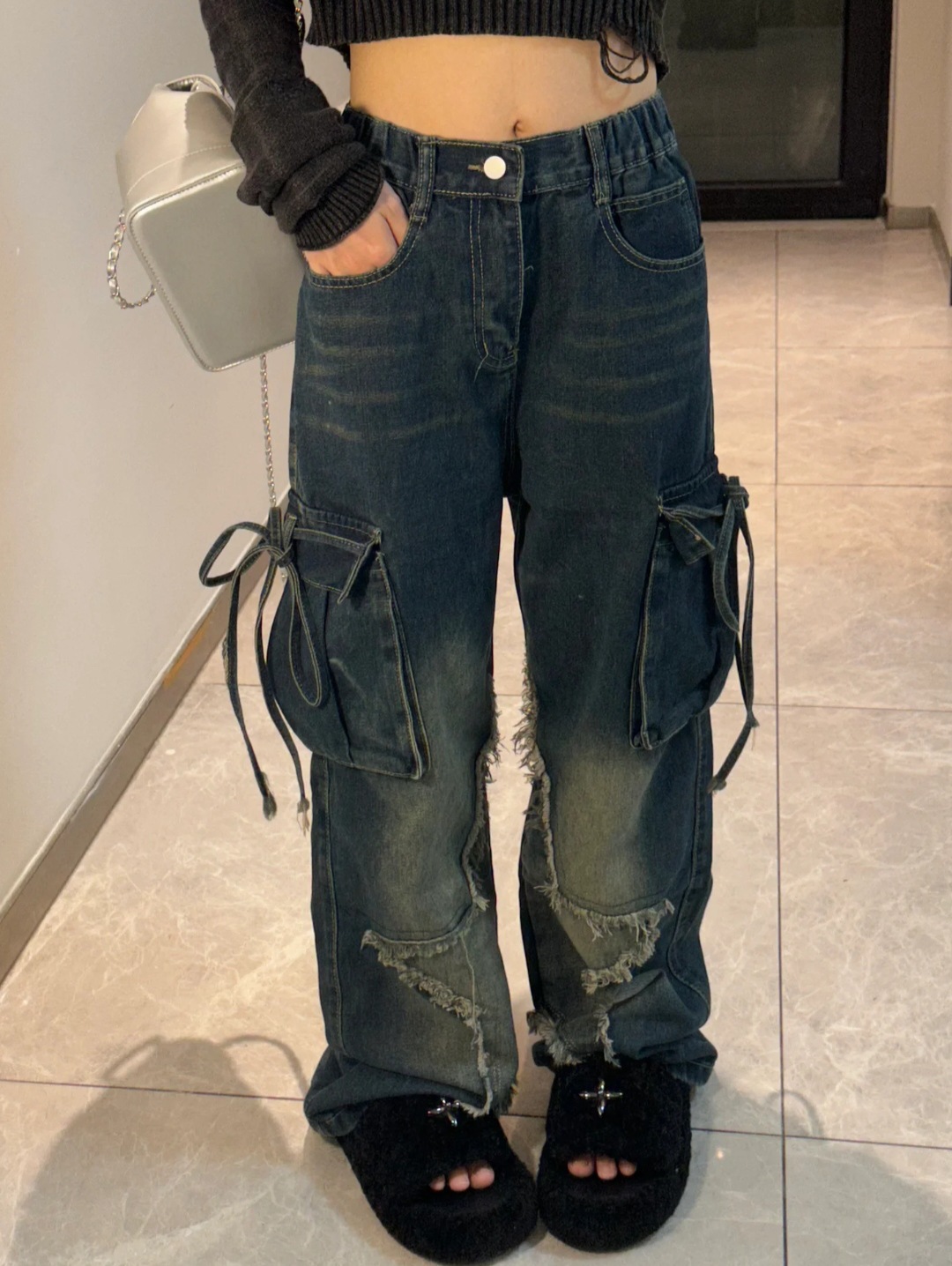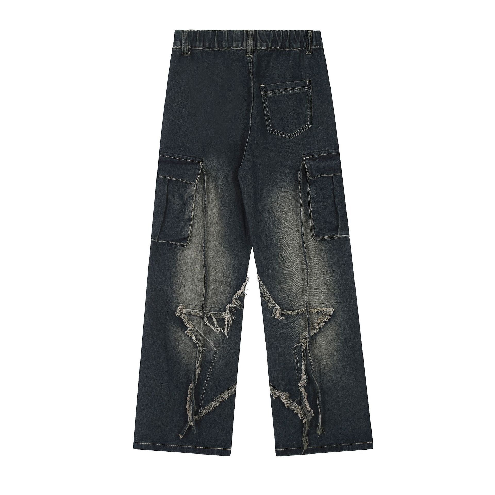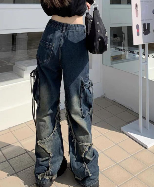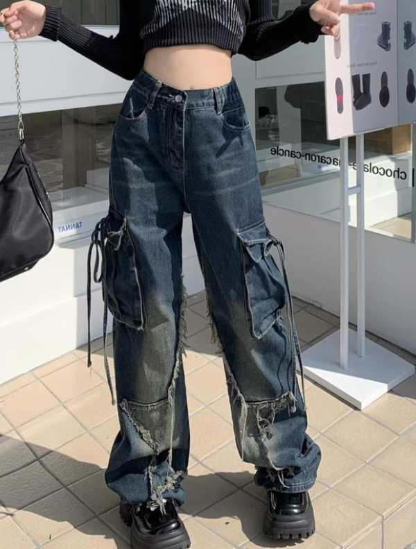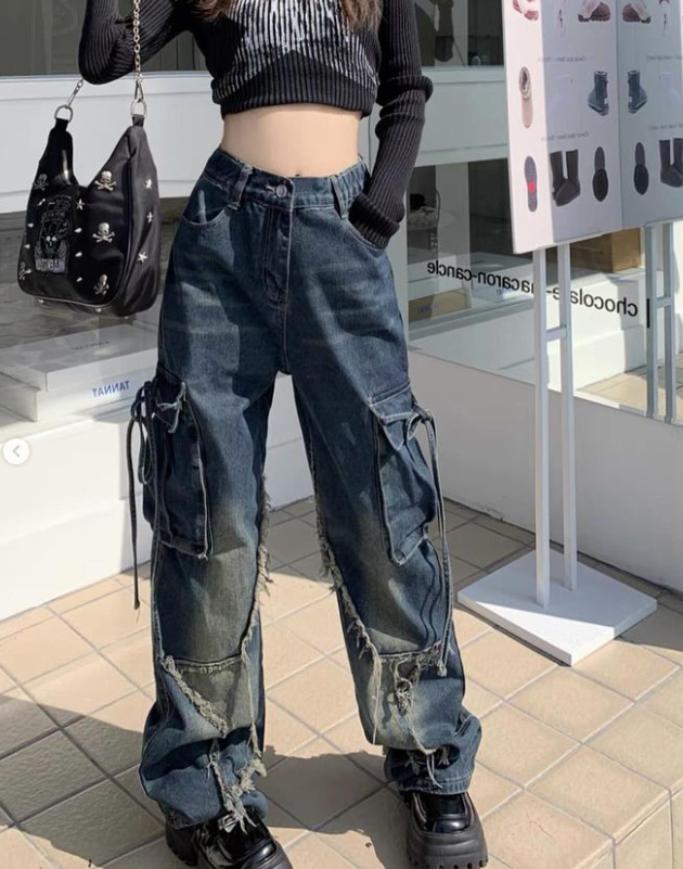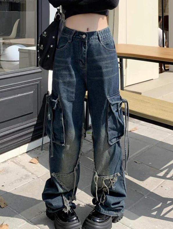 국경 간 봄과 가을 미국 레트로 스타 청바지 여성 멀티 포켓 스트랩 하이 스트리트 루즈 스트레이트 툴링 청바지스토어 가기