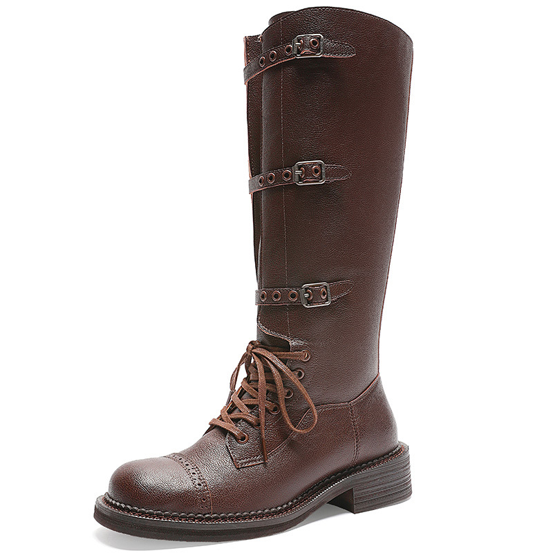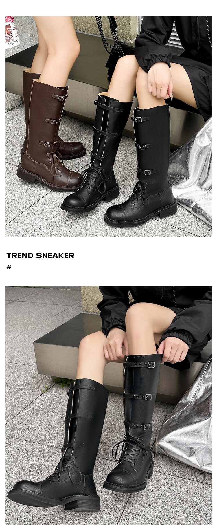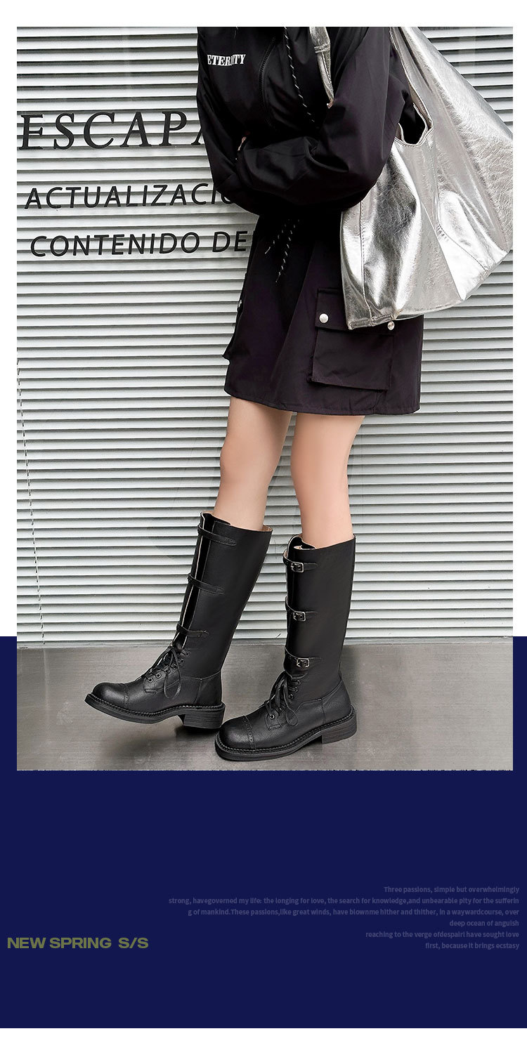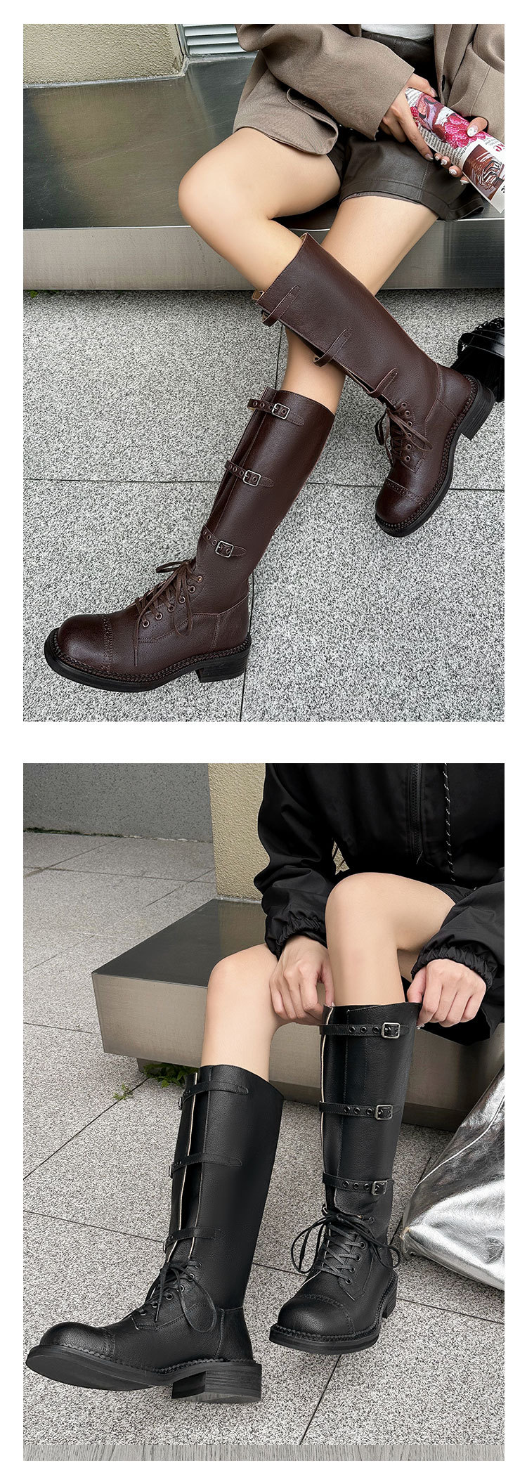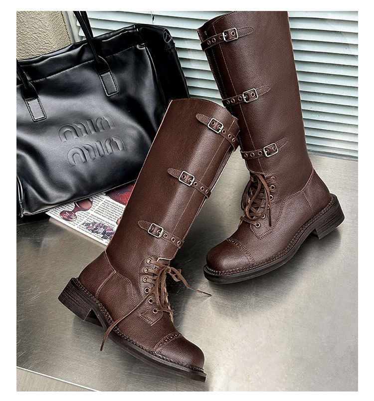두꺼운 힐 부츠 여성 미우 홈 벨트 버클 무릎 가죽 레트로 나이트 웨스턴 카우보이 부츠 롱 배럴 마틴 부츠