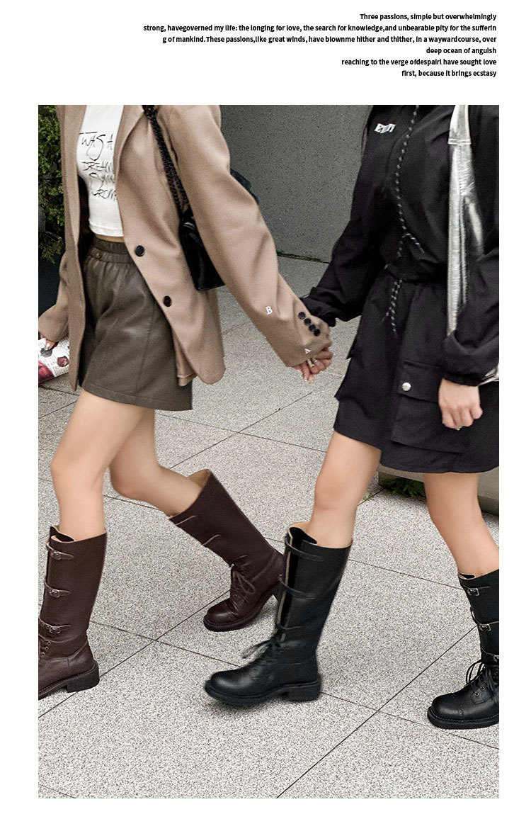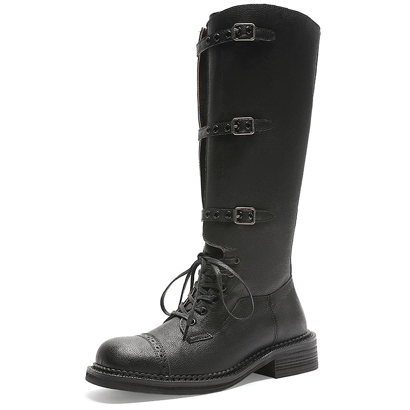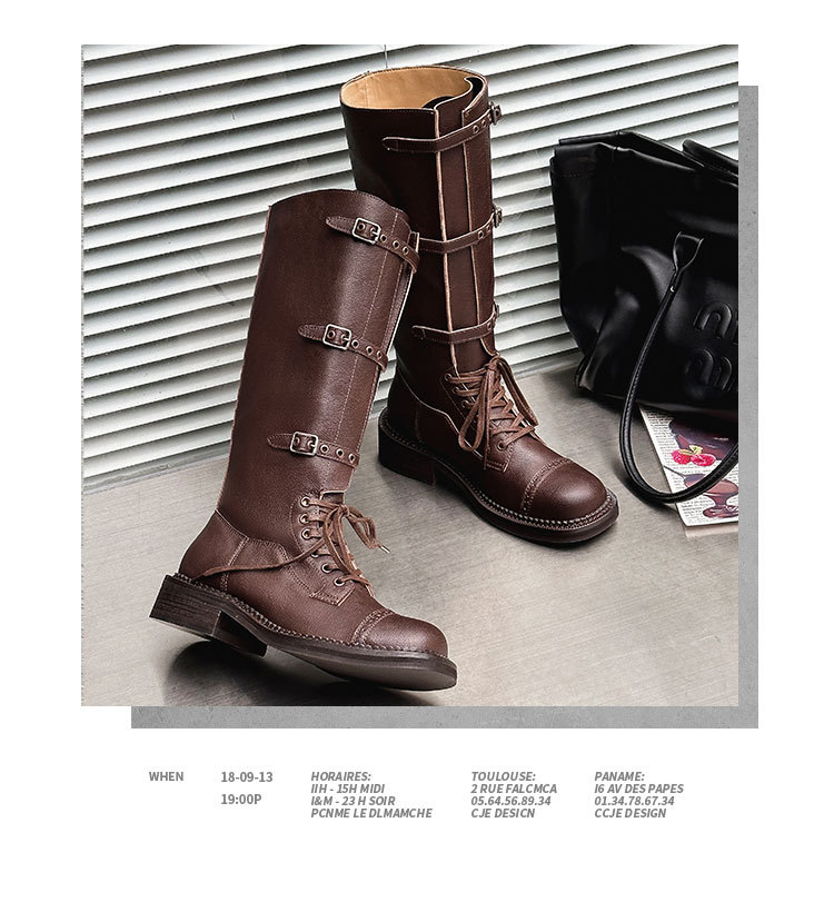 두꺼운 힐 부츠 여성 미우 홈 벨트 버클 무릎 가죽 레트로 나이트 웨스턴 카우보이 부츠 롱 배럴 마틴 부츠스토어 가기