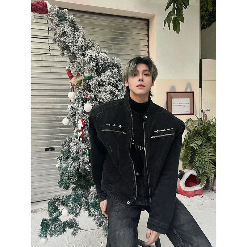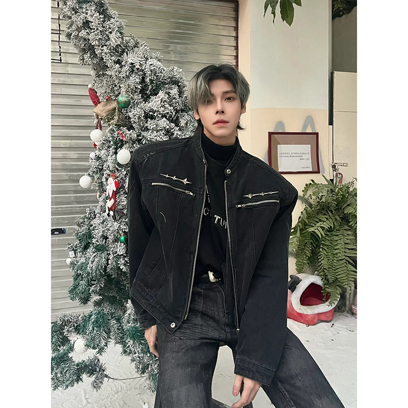 아메리칸 스타일 하이 스트리트 쇼트 데님 재킷 남성 봄과 가을 지퍼 디자인 센스 프론트 숄더 데님 재킷 빈티지 재킷