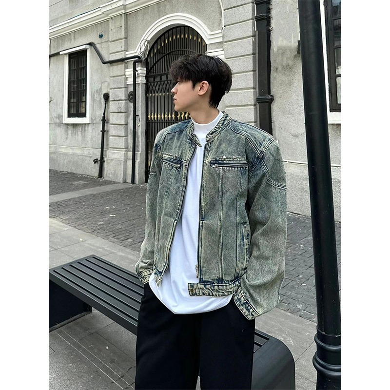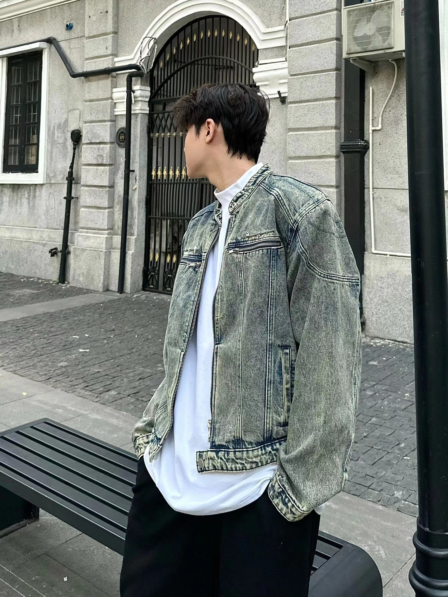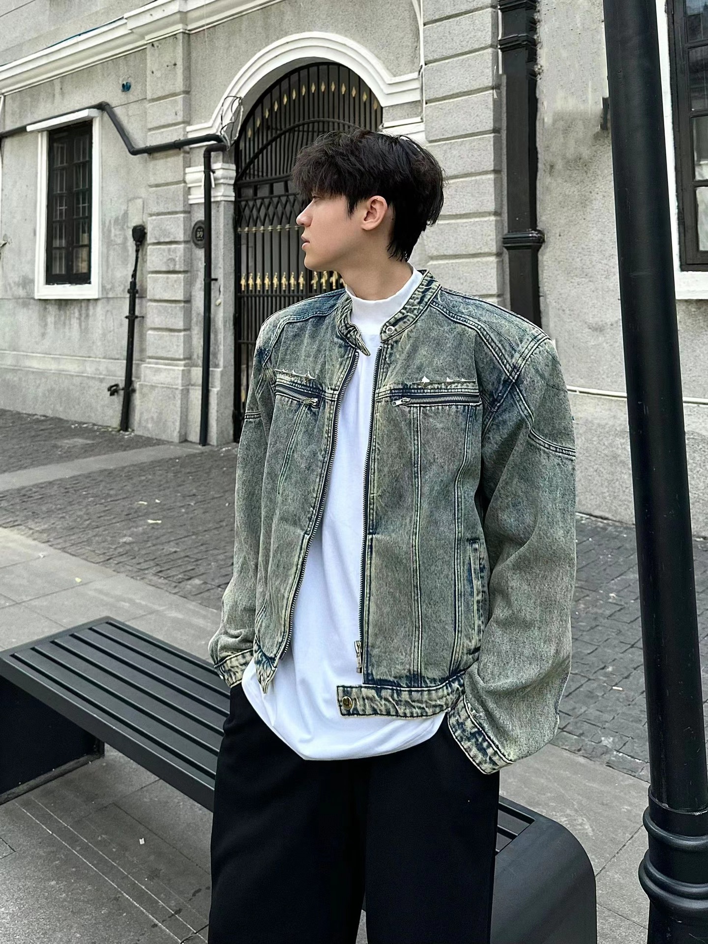 아메리칸 스타일 하이 스트리트 쇼트 데님 재킷 남성 봄과 가을 지퍼 디자인 센스 프론트 숄더 데님 재킷 빈티지 재킷스토어 가기
