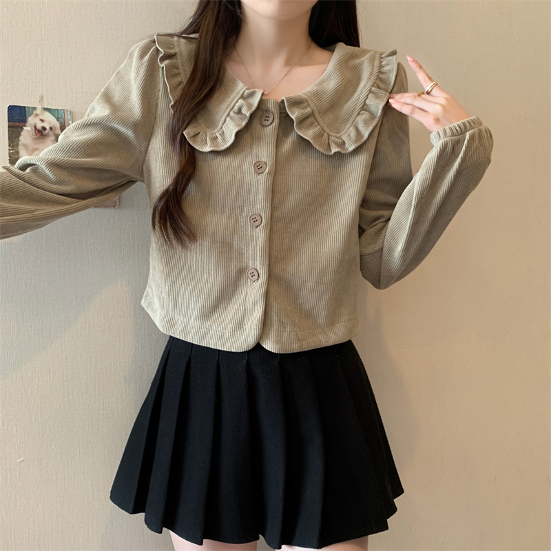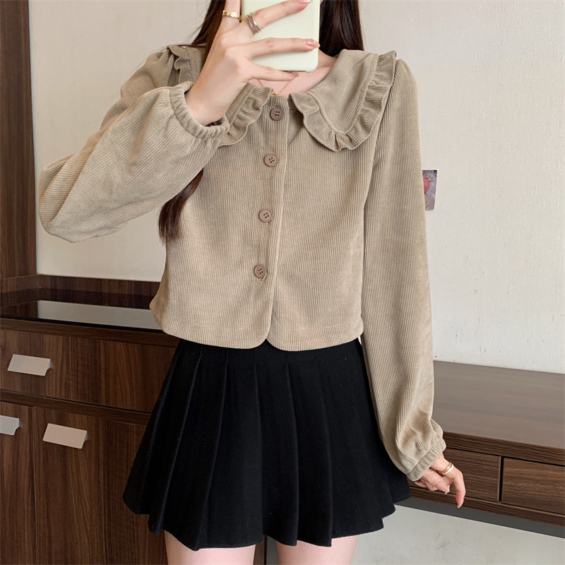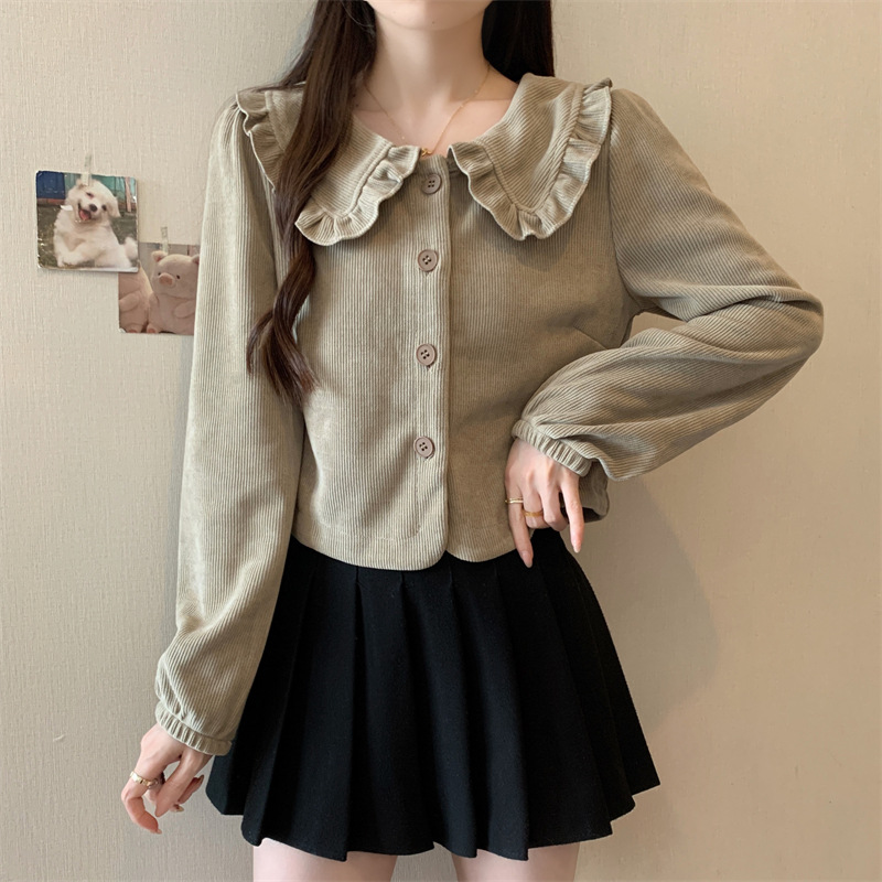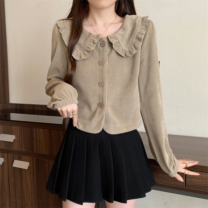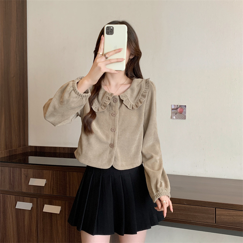 인형 칼라 코듀로이 짧은 셔츠 여성의 가을과 겨울 디자인 센스 틈새 패션 의상 슬림 핏 탑 작은 셔츠 재킷스토어 가기