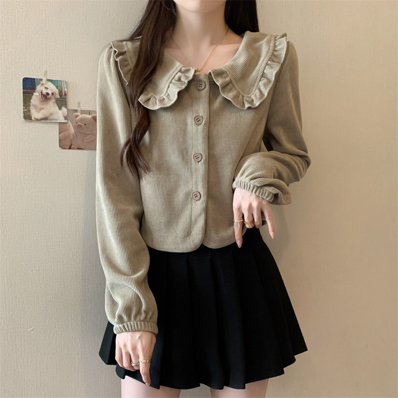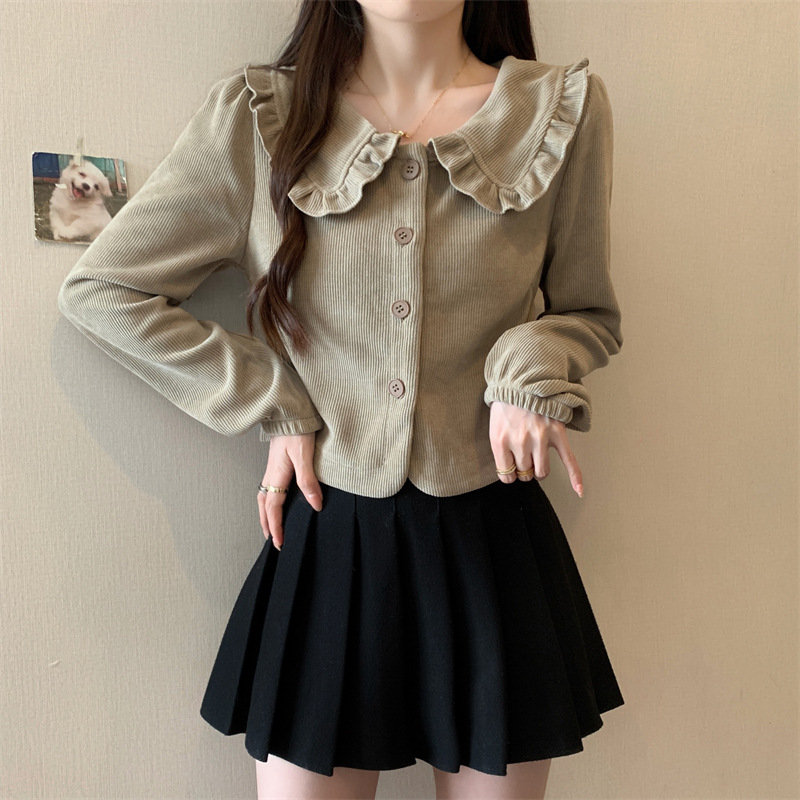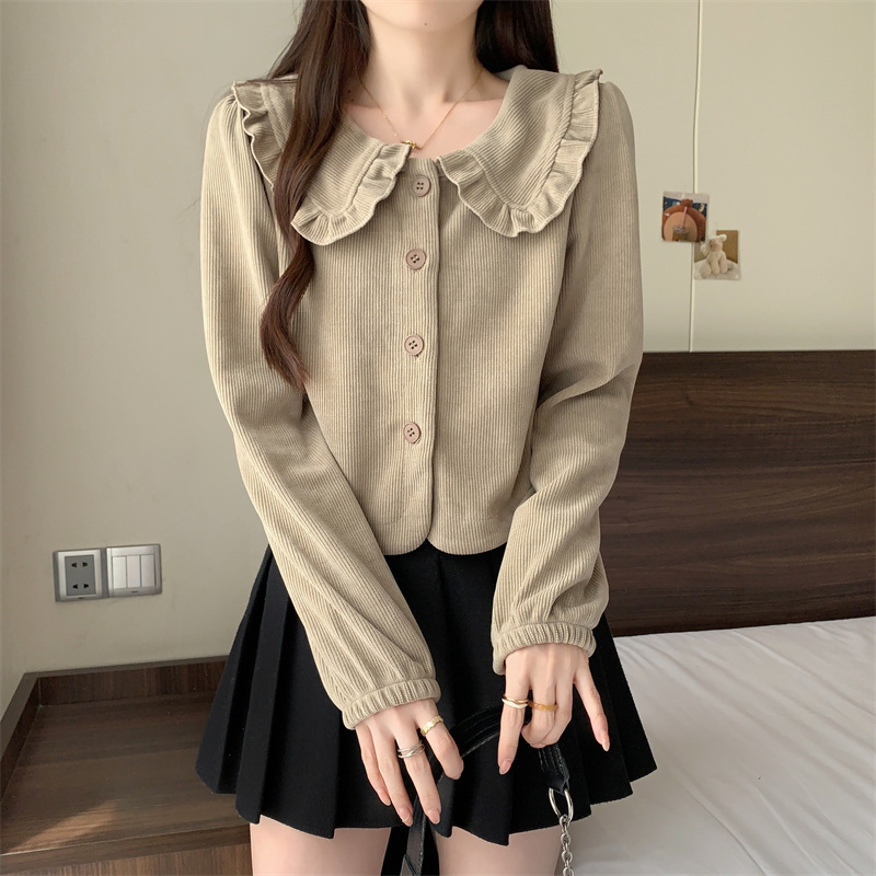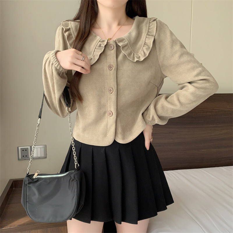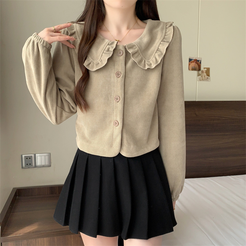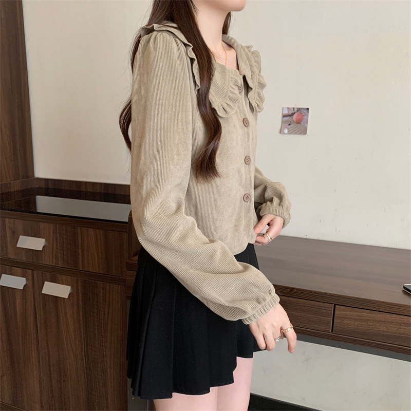 인형 칼라 코듀로이 짧은 셔츠 여성의 가을과 겨울 디자인 센스 틈새 패션 의상 슬림 핏 탑 작은 셔츠 재킷스토어 가기