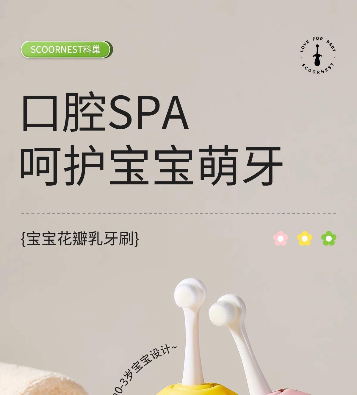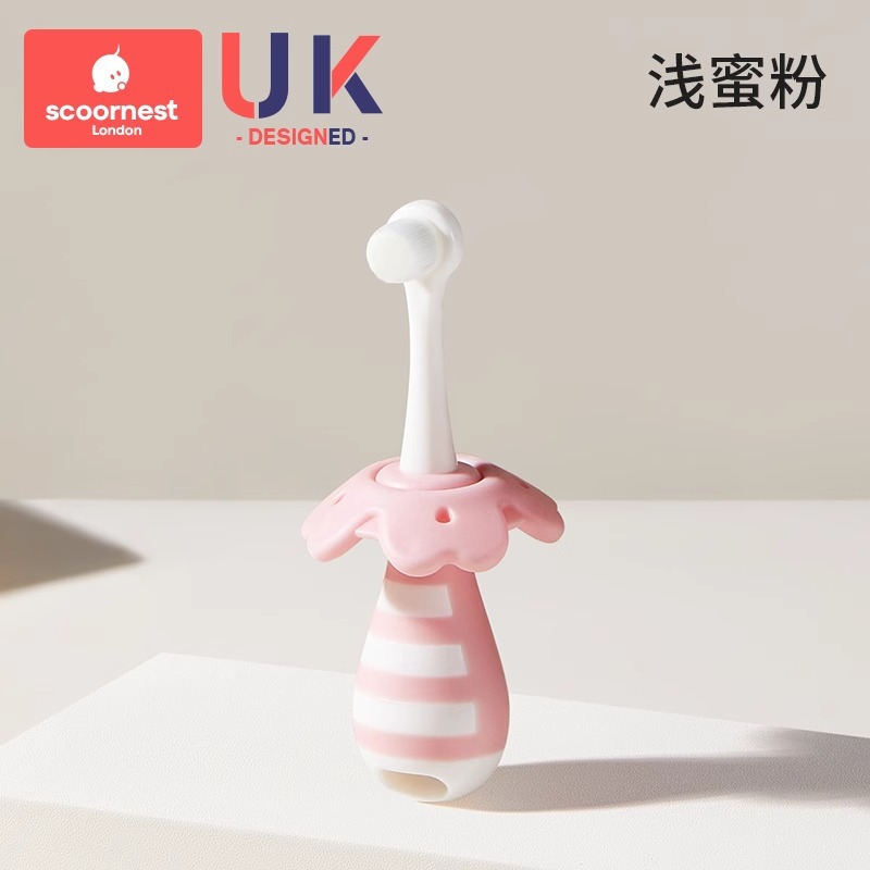 • 가벼운 꿀가루 + 유아용 치약 + 가루 구강 세정제 컵, 0-3세에게 적합