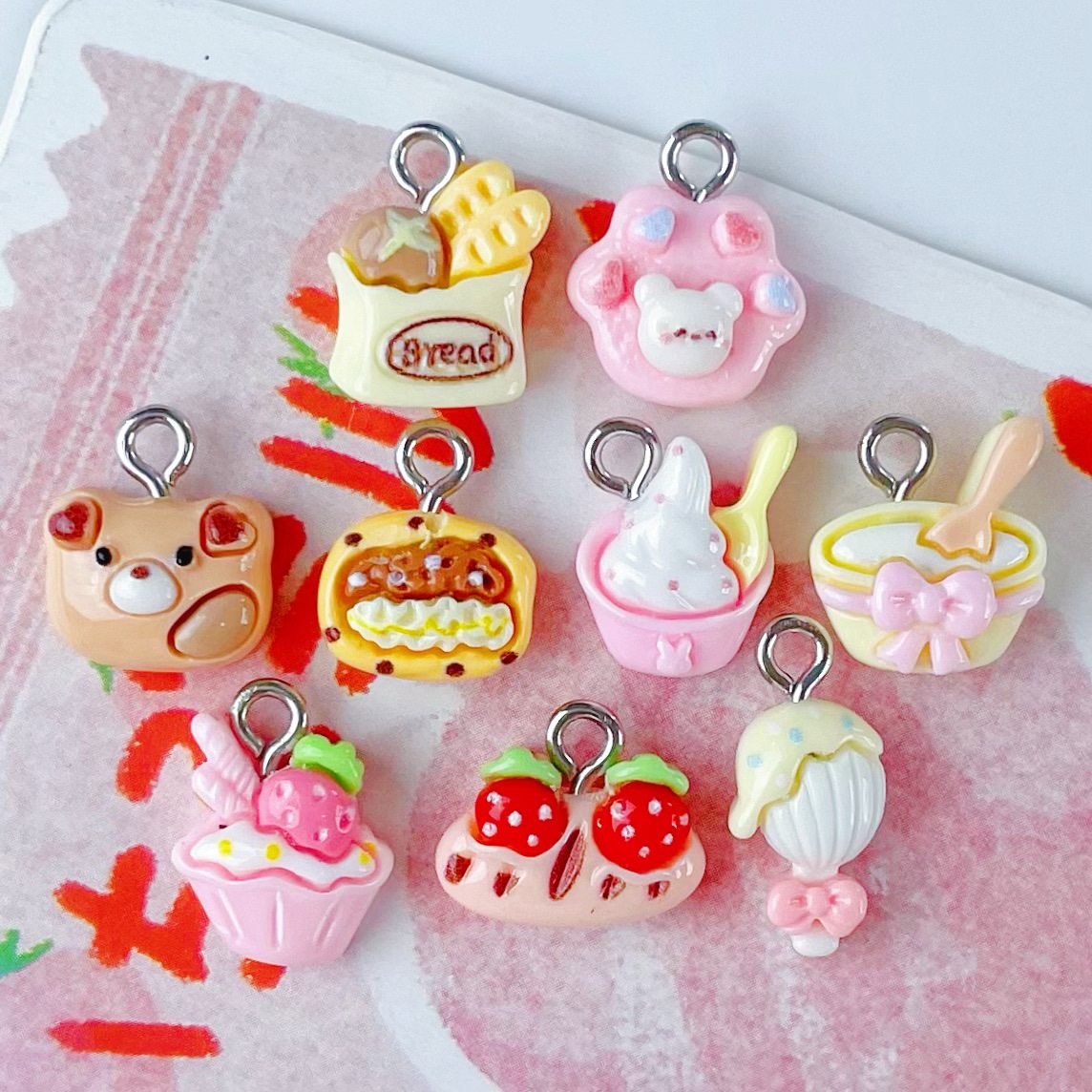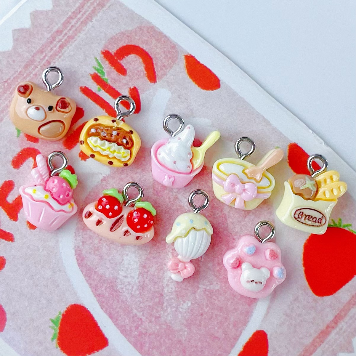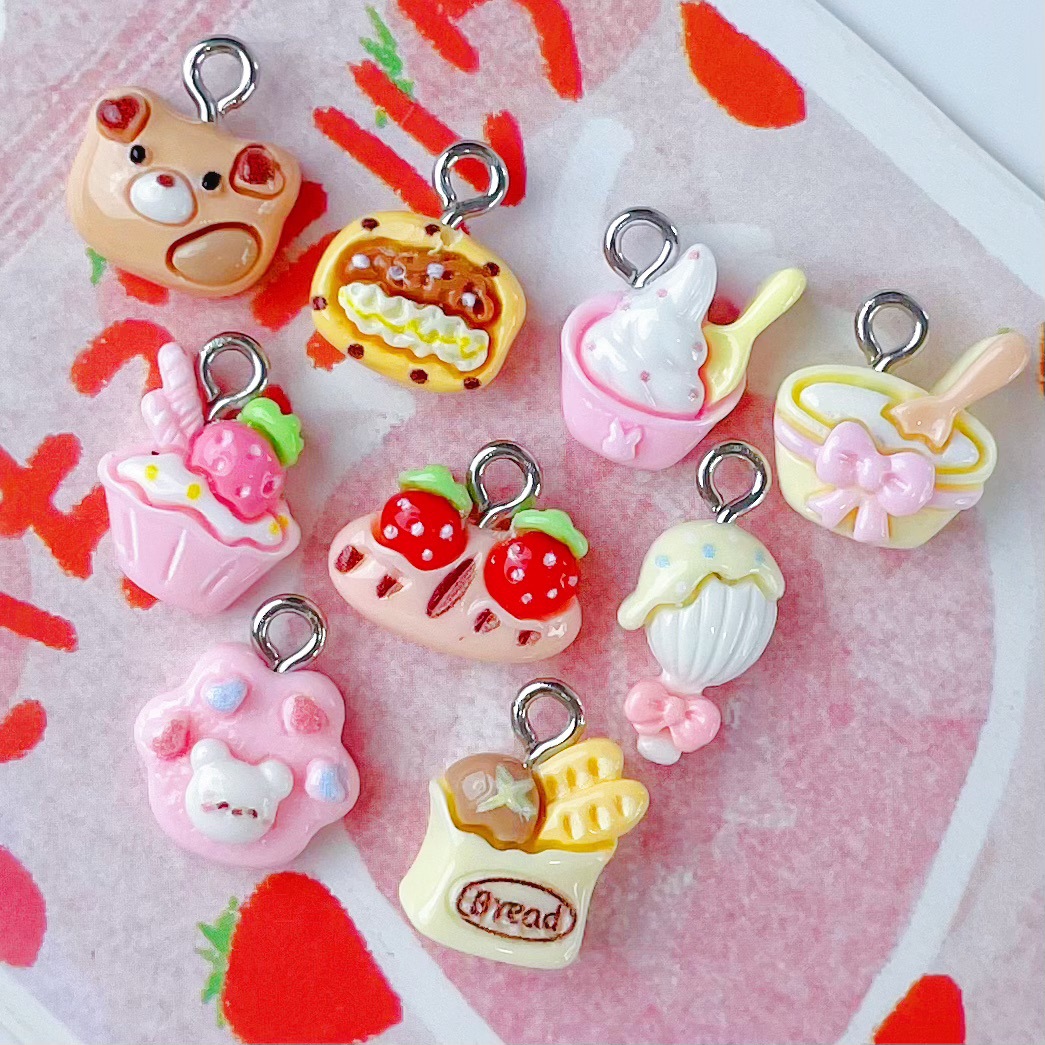 미니 케이크 음식 플레이 딸기 아이스크림 빵 보석 펜던트 시뮬레이션 식품 플레이 수지 액세서리 펜던트 키 체인