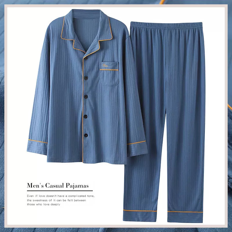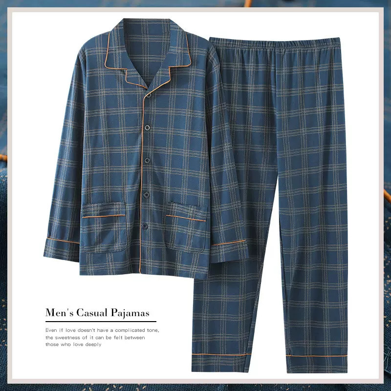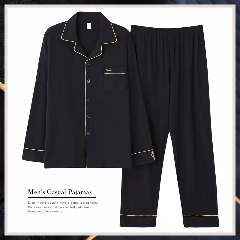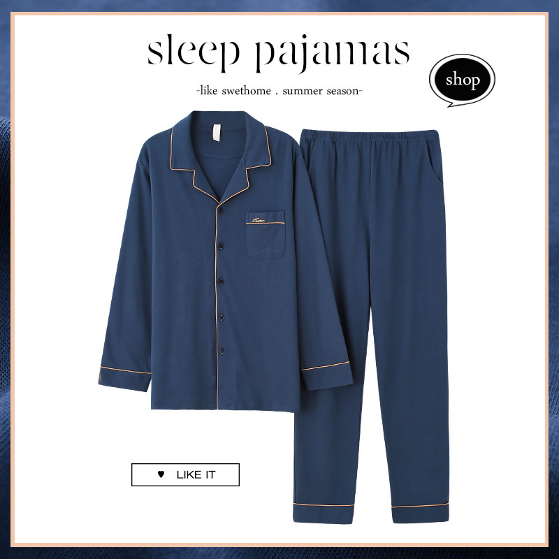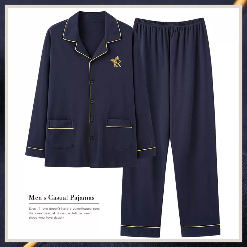 봄과 가을 새로운 카디건 옷깃 긴팔 바지 면 잠옷 남성용 캐주얼 심플 플러스 사이즈 홈 의류 투피스 세트스토어 가기