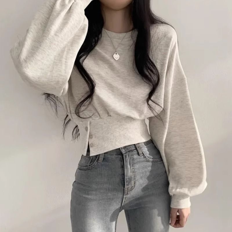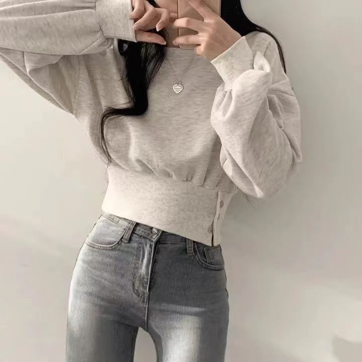한국 새로운 가을 틈새 디자인 크루 넥 버클 타이트 허리 슬리밍 긴 소매 풀오버 땀 최고 짧은 여성스토어 가기