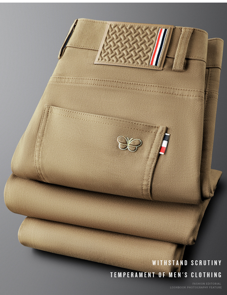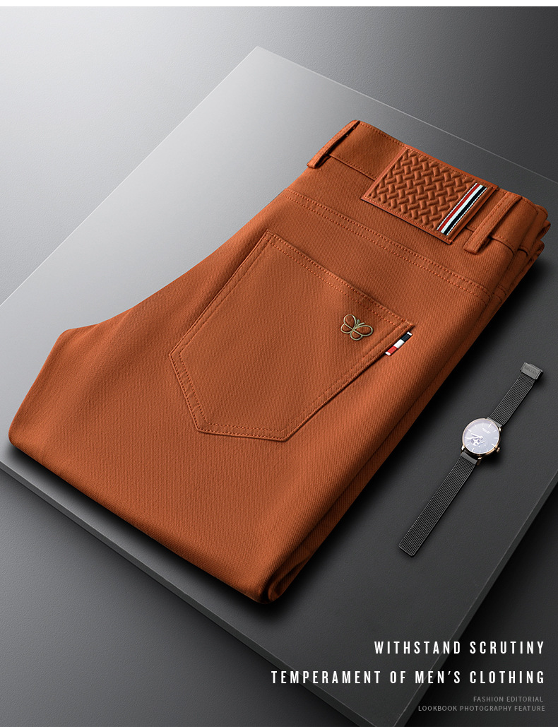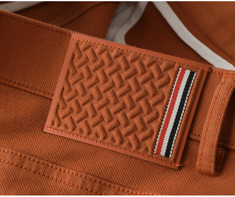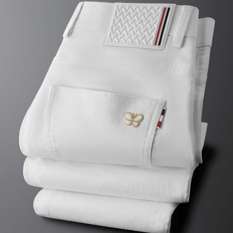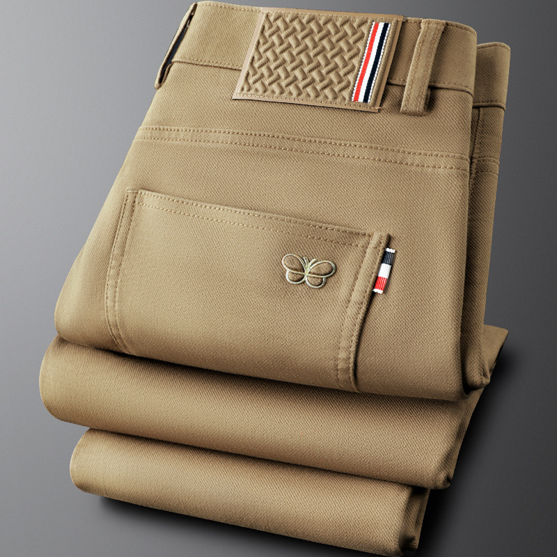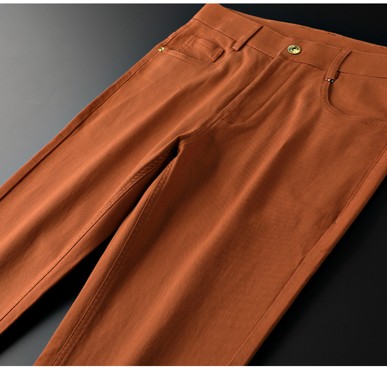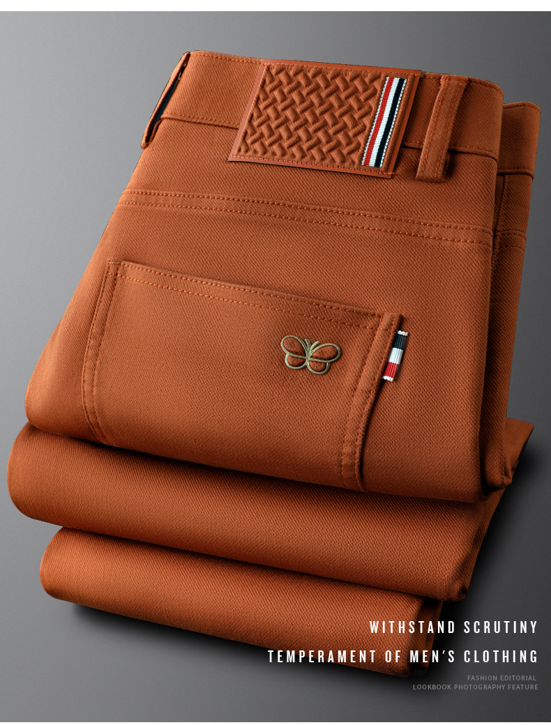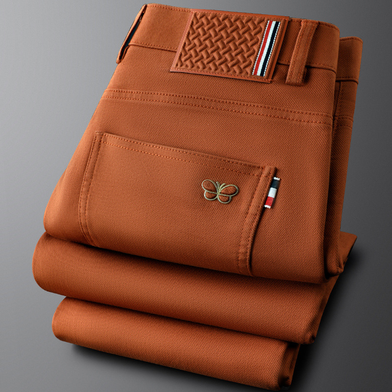가벼운 고급 벽돌 빨간 데님 바지 남자의 슬림 핏 작은 스트레이트 바지 가을과 겨울 남자의 나비 양각 캐주얼 비즈니스 바지스토어 가기