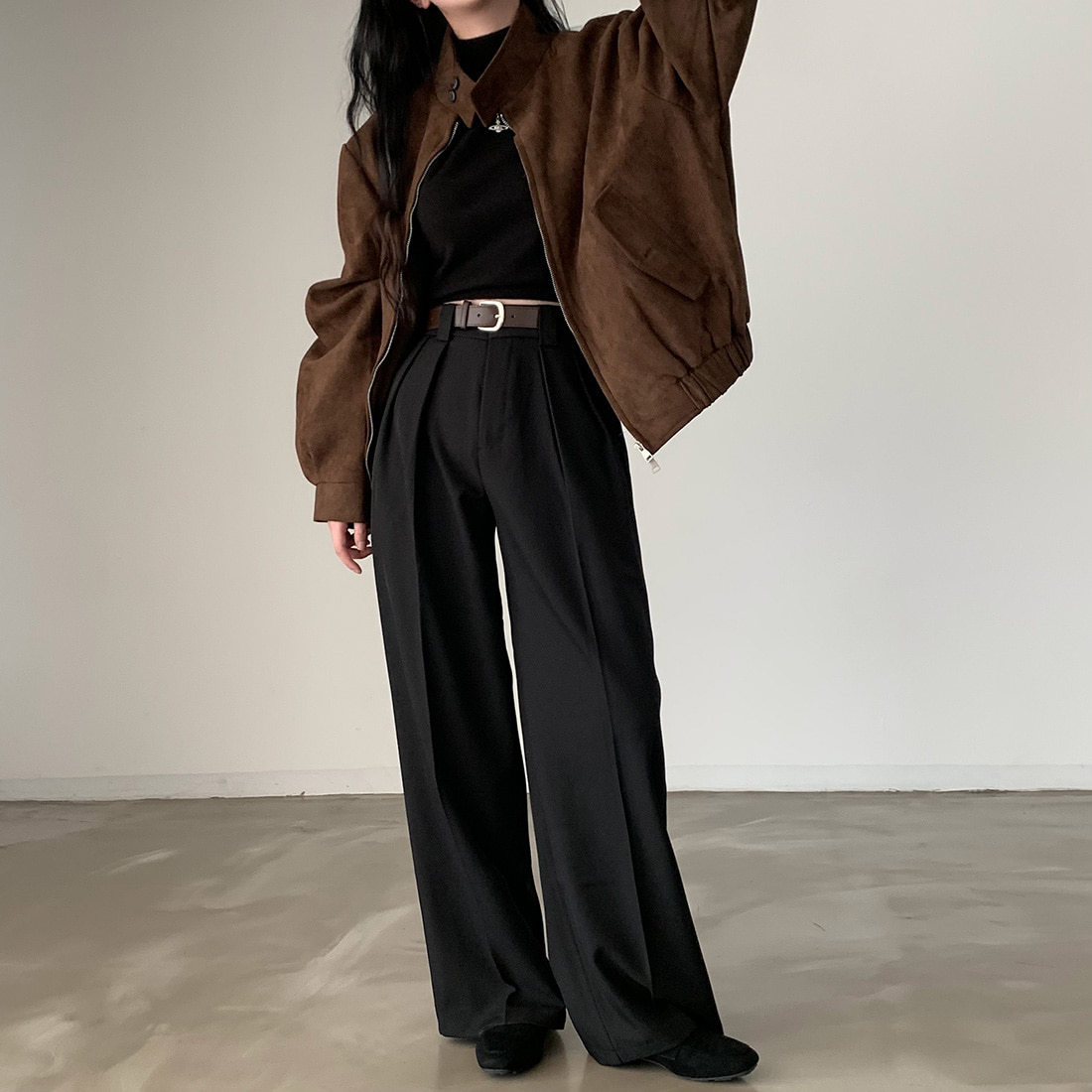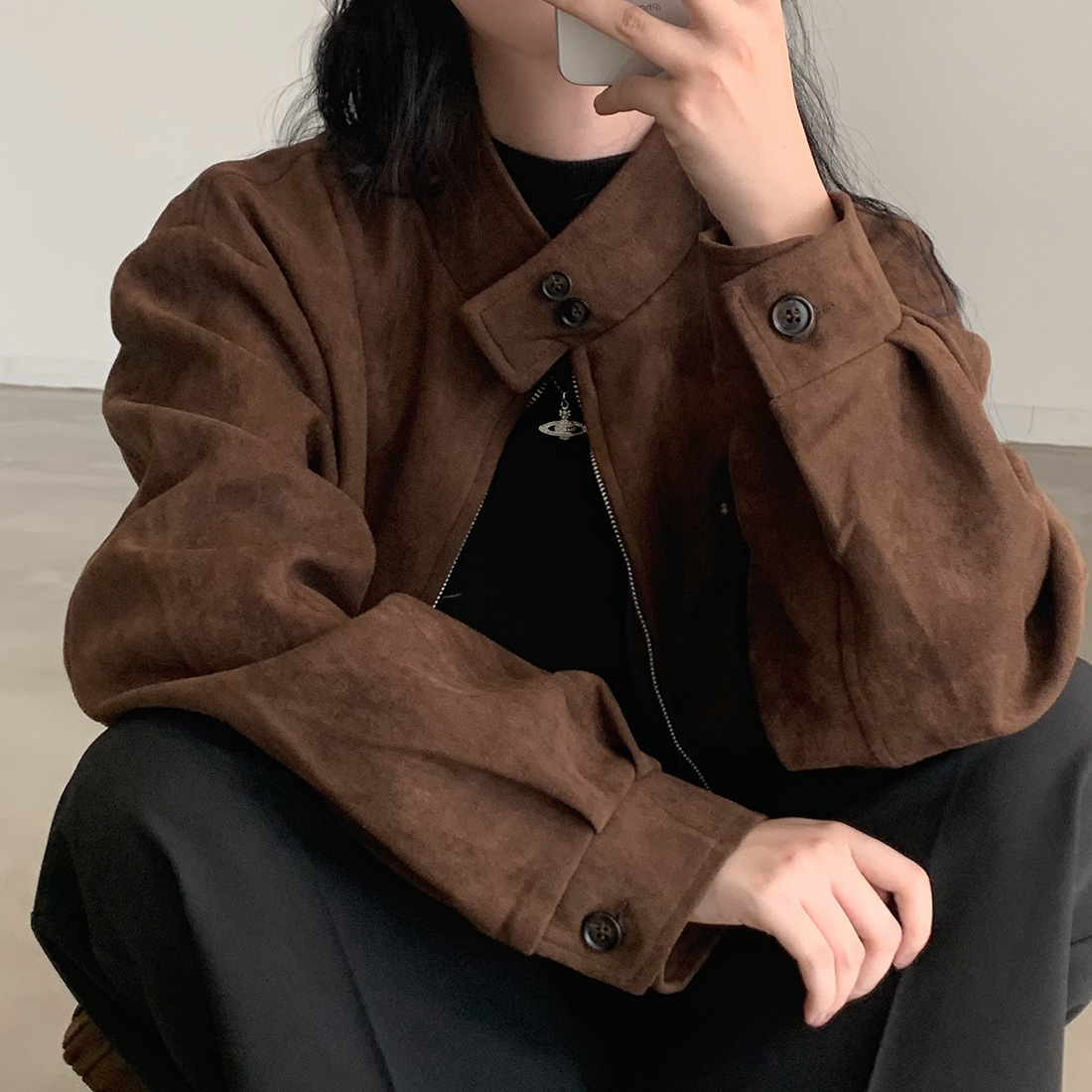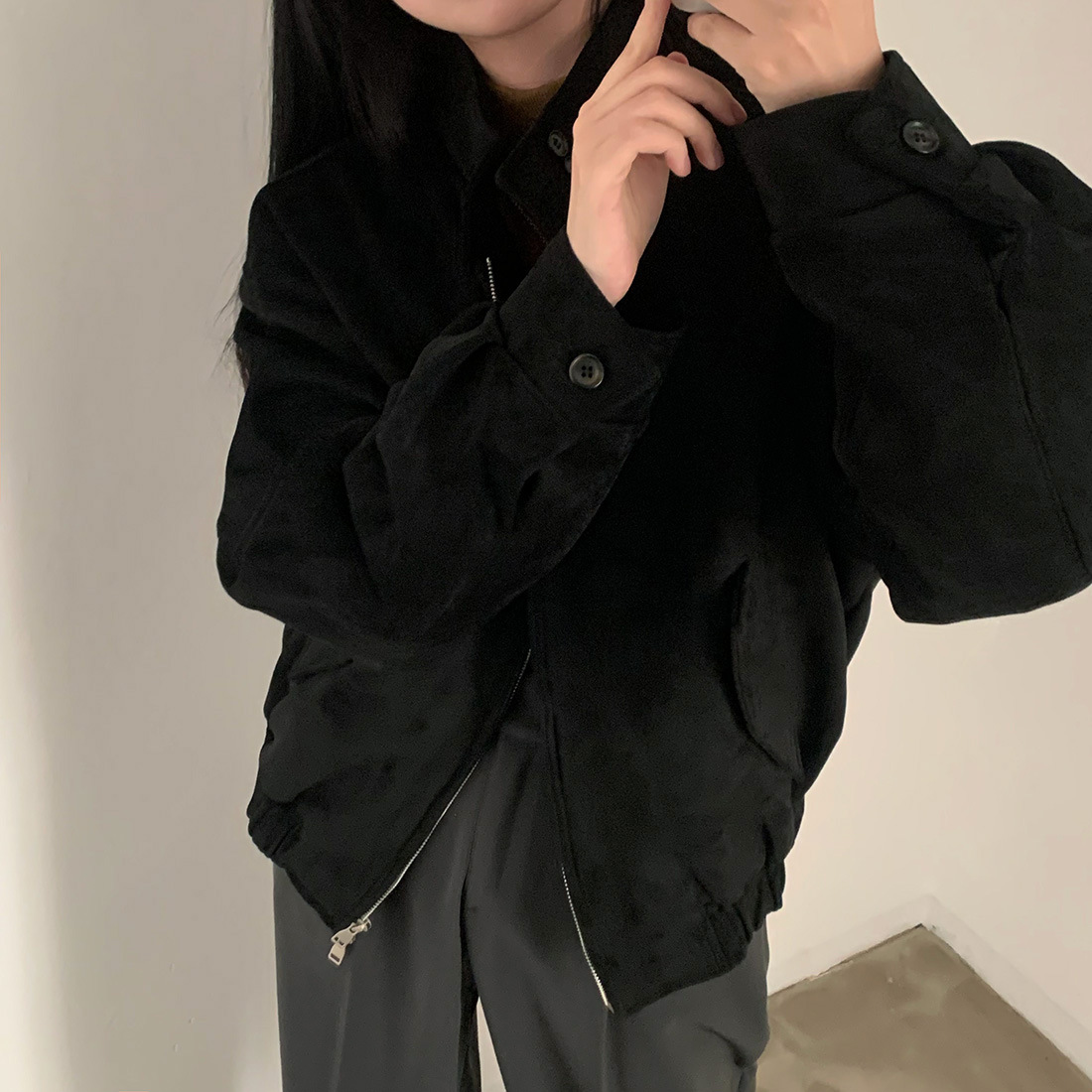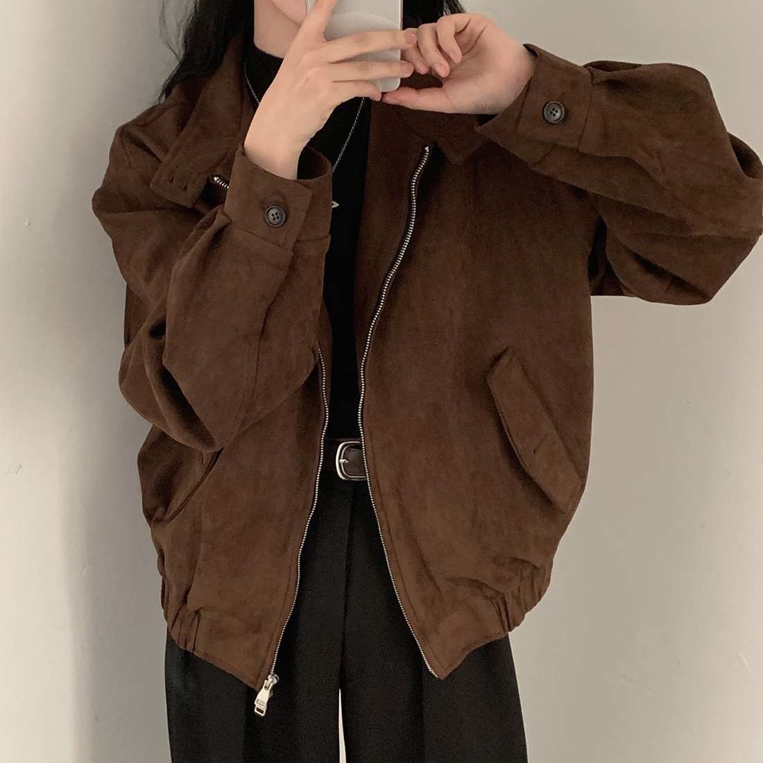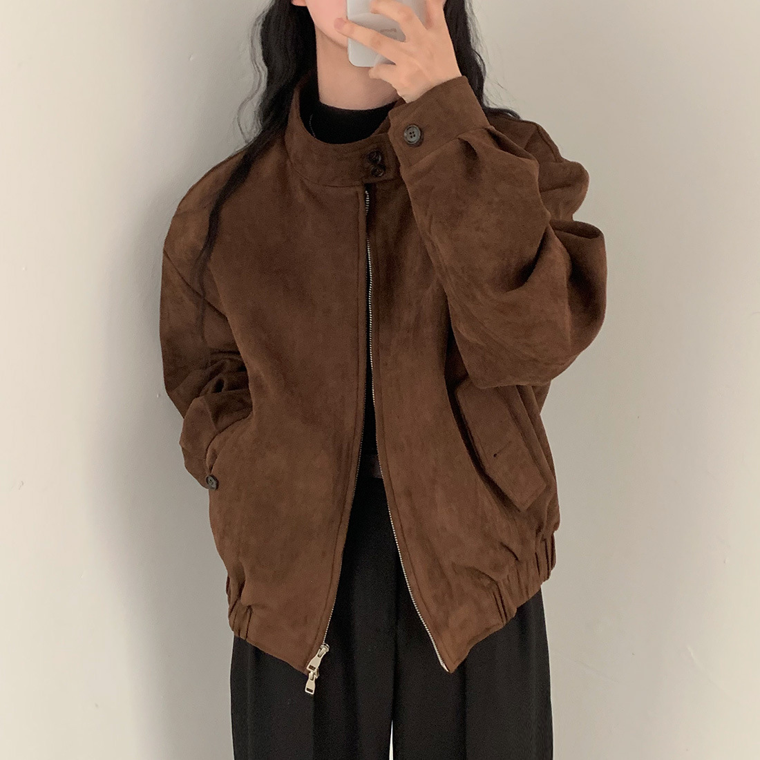 한국 세련된 가을과 겨울 빈티지 우아한 스탠딩 칼라 모조 사슴 가죽 벨벳 따뜻한 다용도 긴 소매 더블 지퍼 코트 여성스토어 가기
