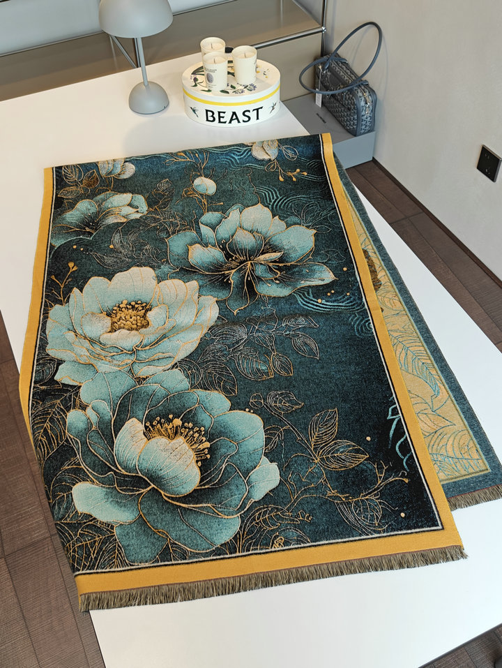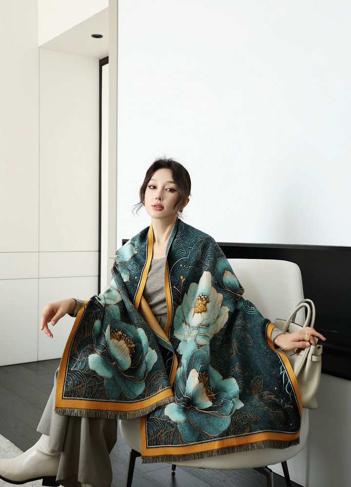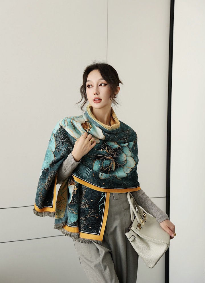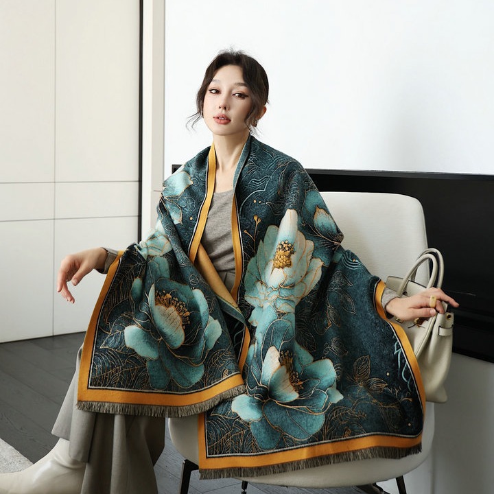 高级感牡丹花油画系围巾秋冬加厚新款百搭女士外搭保暖大披肩两用