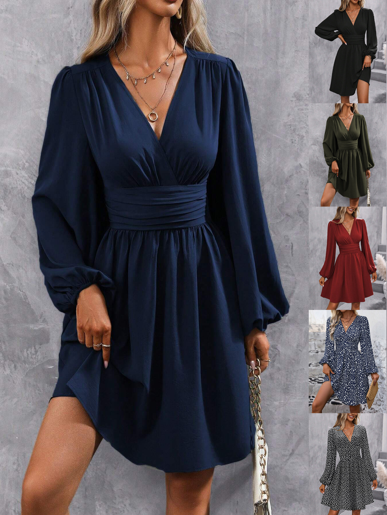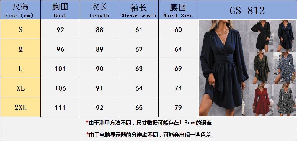 가을과 겨울 새로운 대각선 칼라 랜턴 소매 주름 허리 원피스