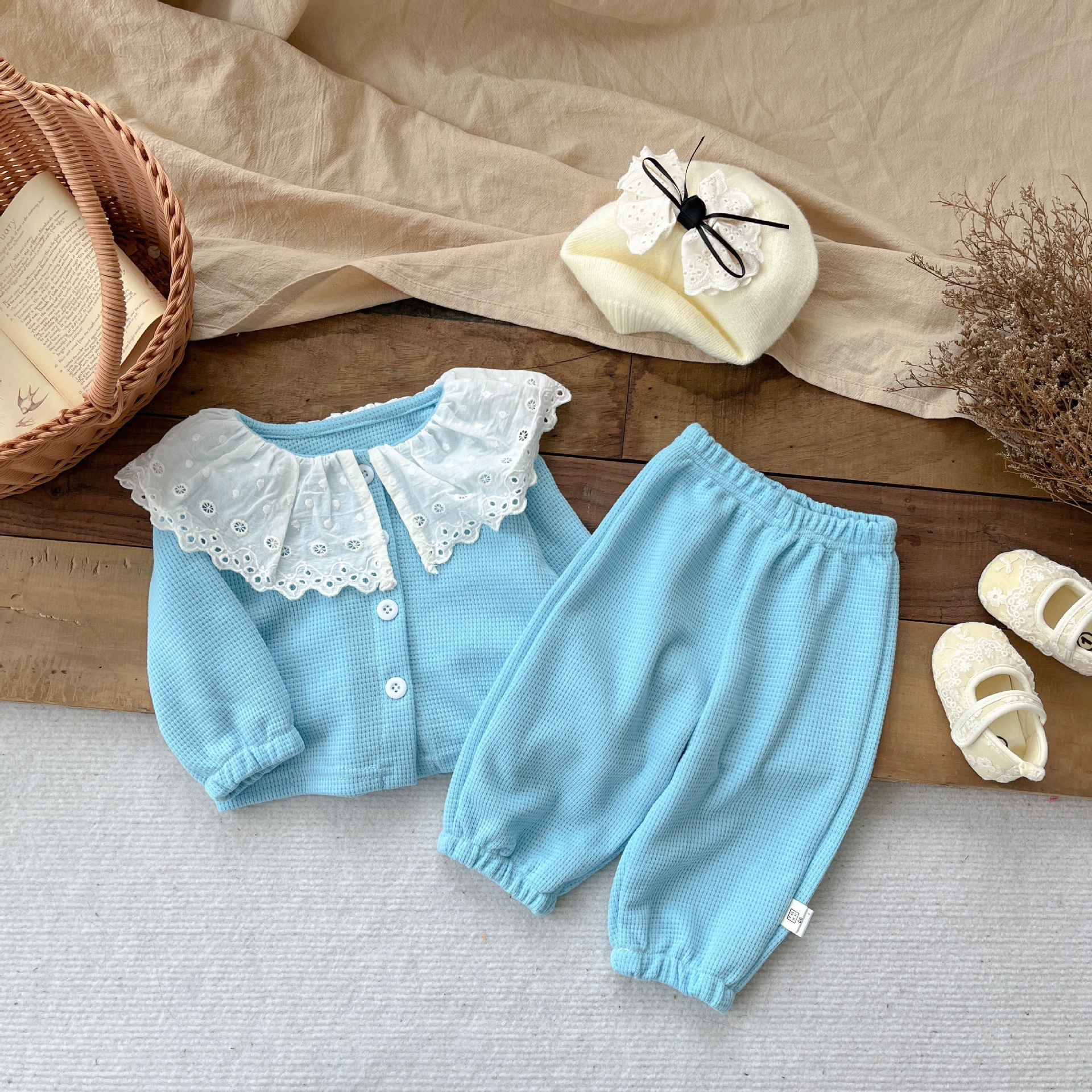 2024 새로운 소녀의 봄 가을 세트 베이비 레이스 레이스 스위트 인형 칼라 탑 발목 바지 한국 스타일스토어 가기