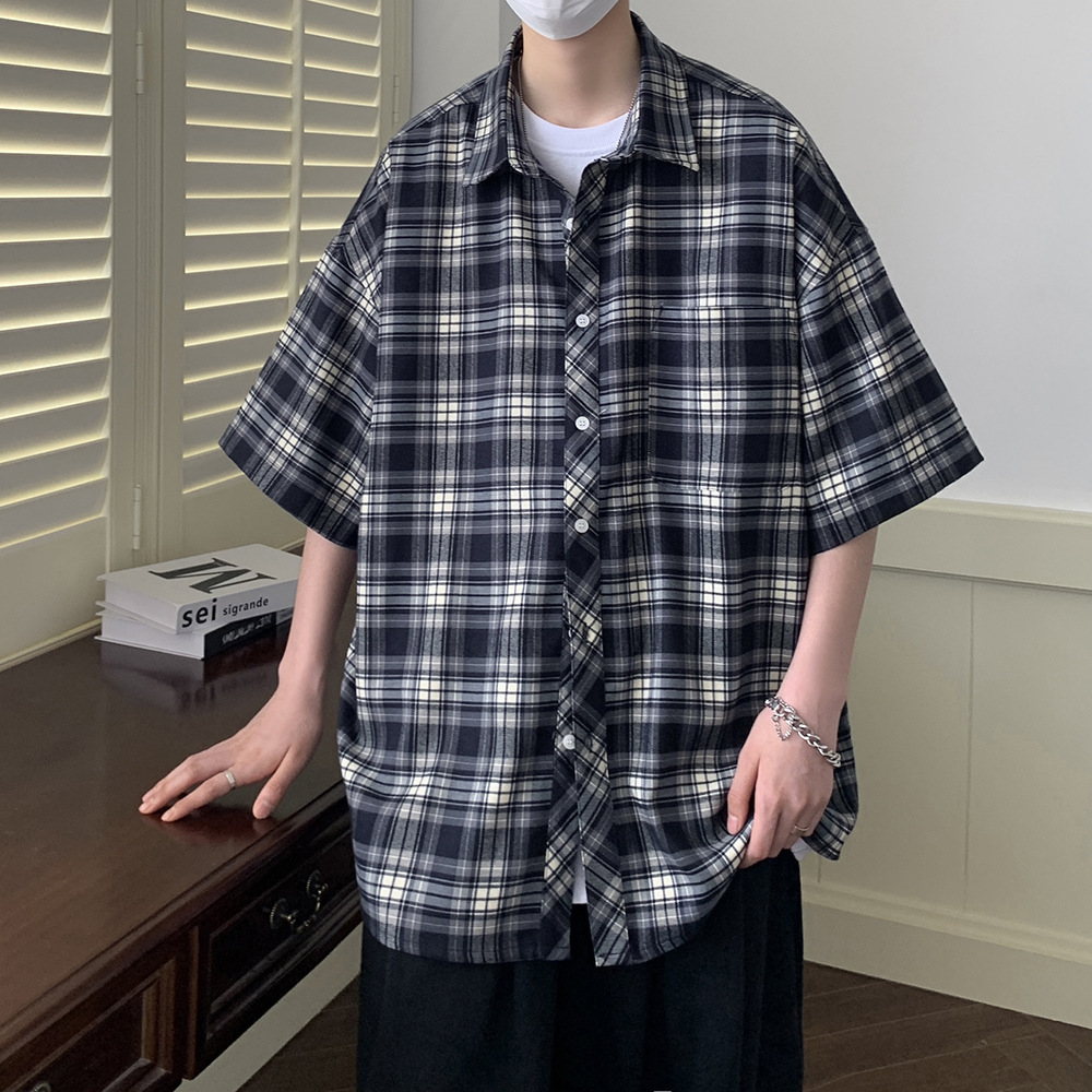 격자 무늬 반팔 셔츠 남자 여름 일본 스타일 레트로 느슨한 캐주얼 반소매 셔츠 미국 스타일 하이 스트리트 패션 브랜드 재킷스토어 가기