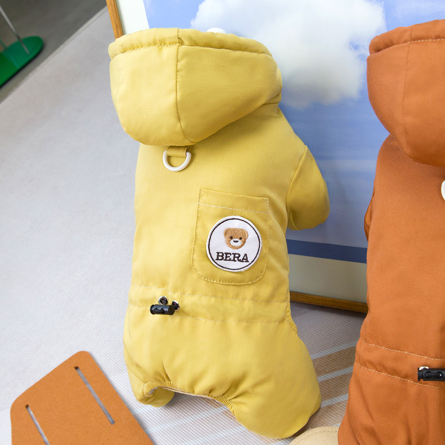 材质描述:面布是水洗布,中间是喷胶棉,里布棉花绒,100%涤纶。面料厚实保暖,四脚衣连帽设计,包裹性好,不惧寒冬,保暖的同时又不会臃肿,英伦学院风,宝贝上身时尚帅气,惹人喜爱!