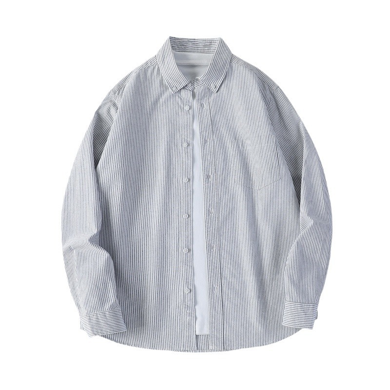 아메리칸 스타일 레트로 블루와 화이트 스트라이프 클래식 셔츠 긴 소매 남성 봄과 가을 느슨한 캐주얼 작업 셔츠 얇은 재킷