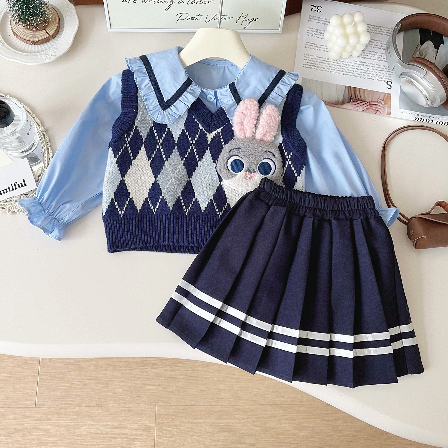 어린이 세트 새 봄과 가을 소녀 유행 토끼 경찰관 JK 제복 세트 니트 조끼 스커트 3 피스 세트