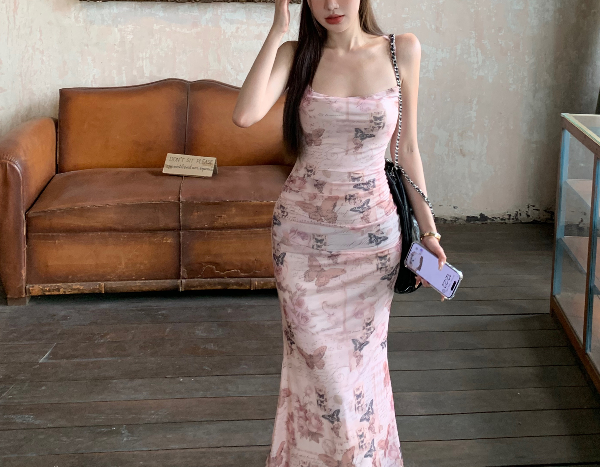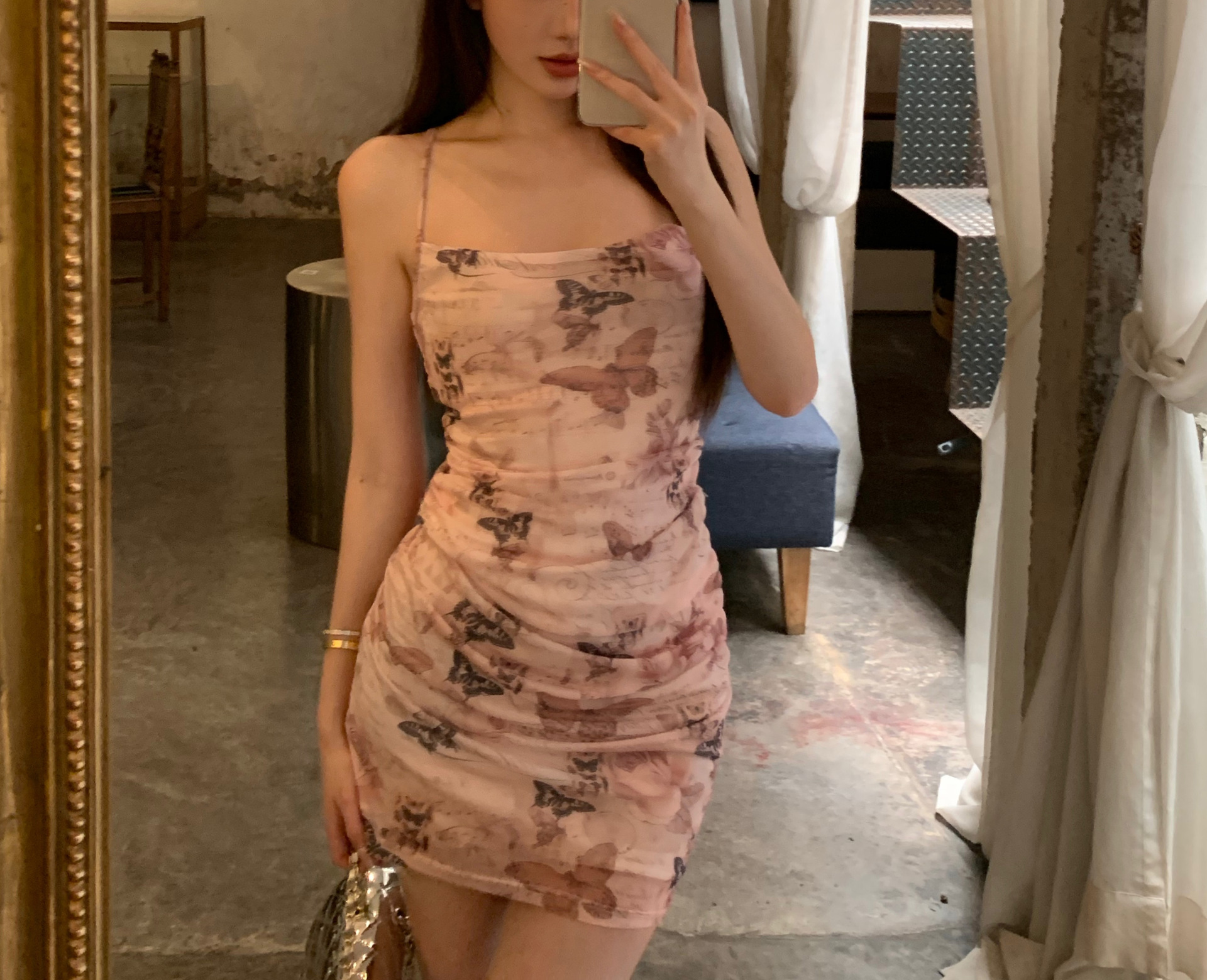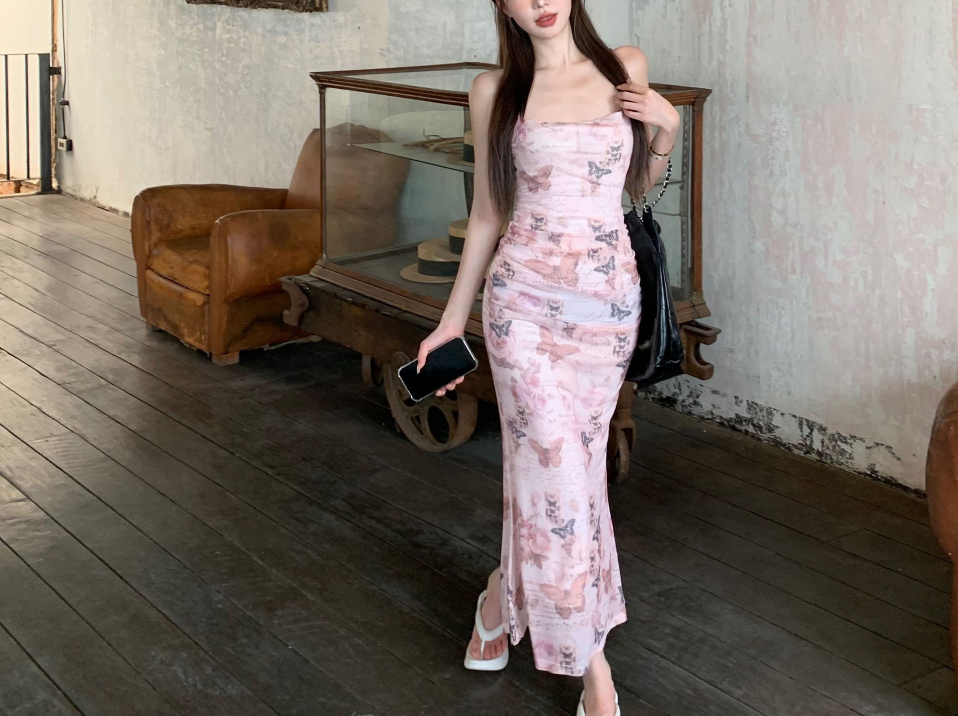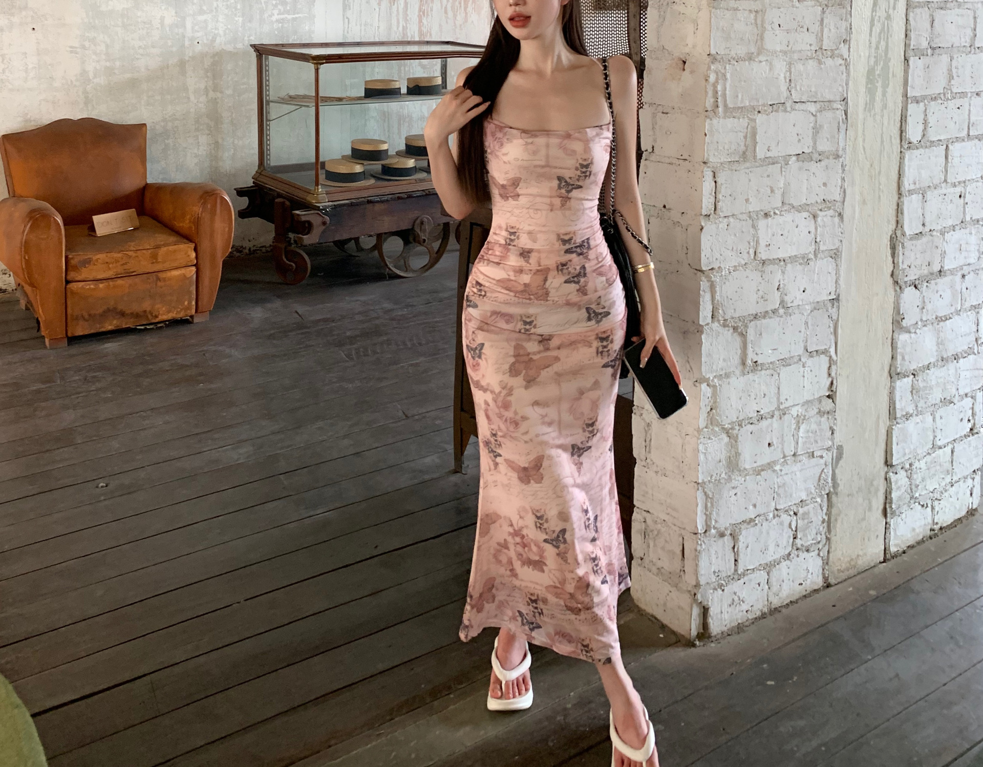 순수한 욕망 스타일 나비 인쇄 섹시한 슬링 원피스 여성의 여름 허리 백리스 스트랩 힙합 스커트 새로운 긴 스커트스토어 가기