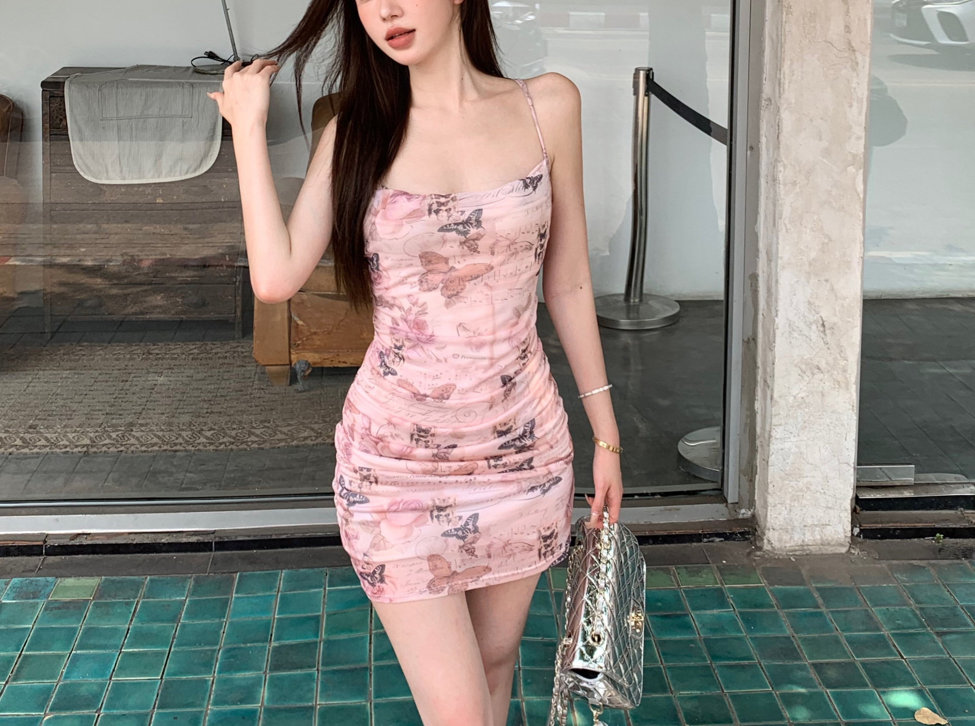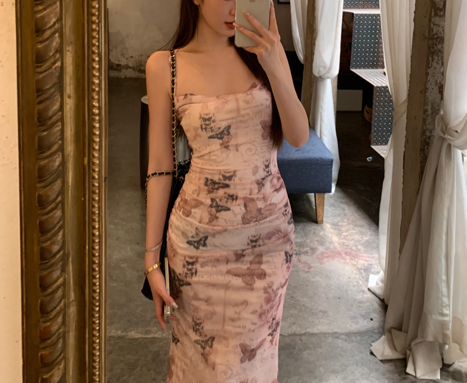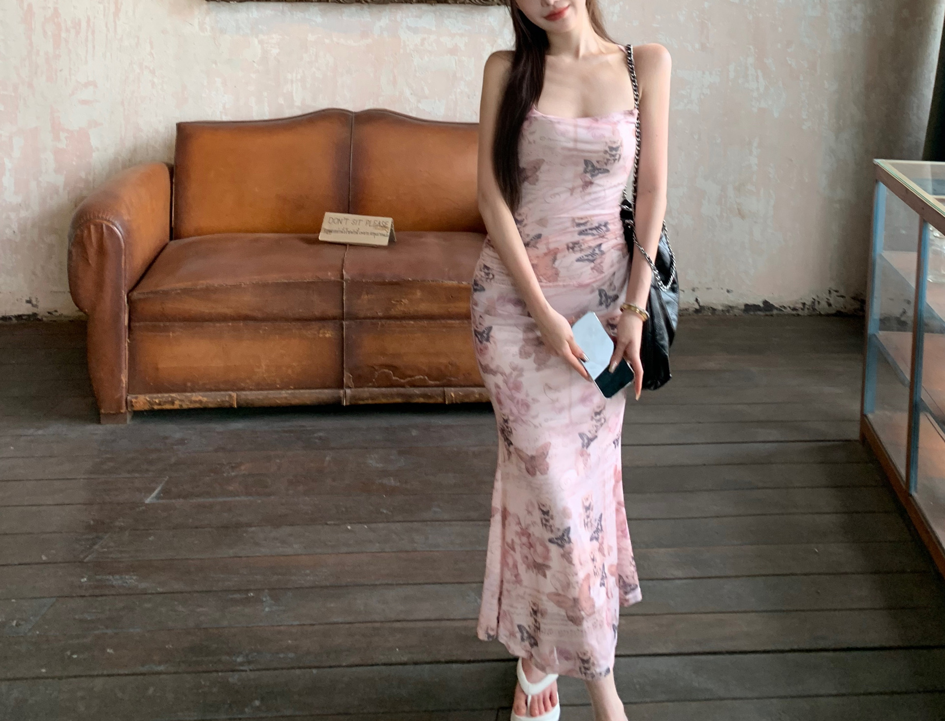 순수한 욕망 스타일 나비 인쇄 섹시한 슬링 원피스 여성의 여름 허리 백리스 스트랩 힙합 스커트 새로운 긴 스커트스토어 가기