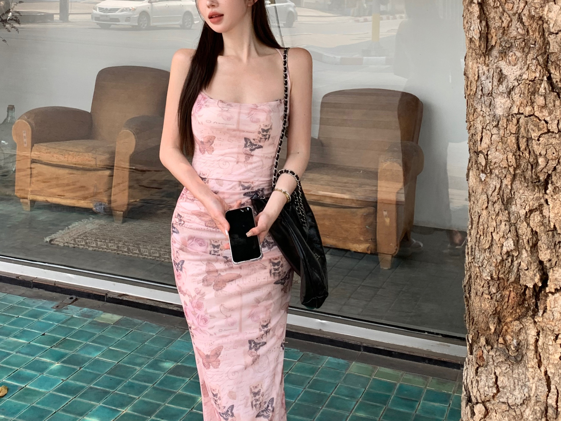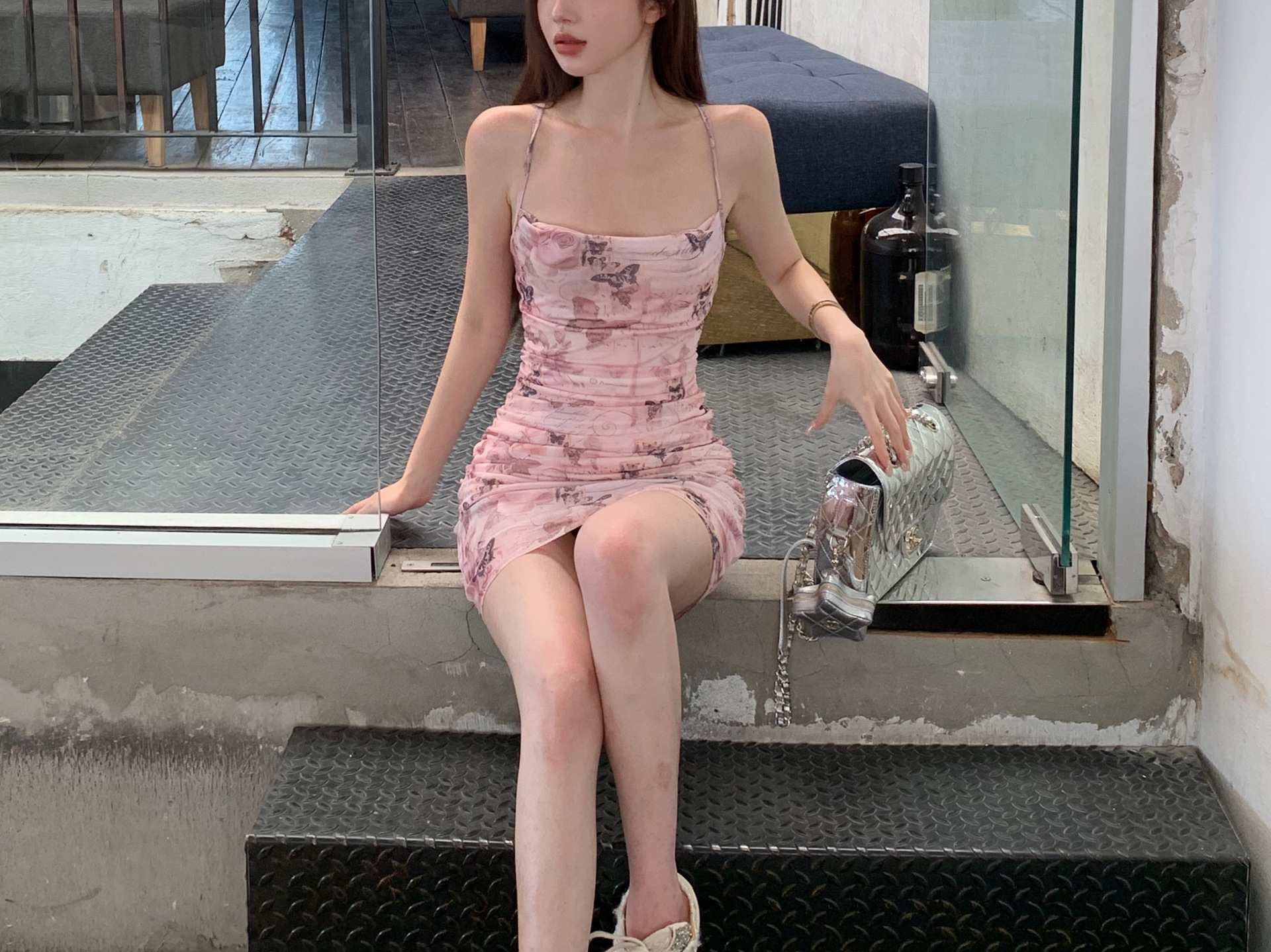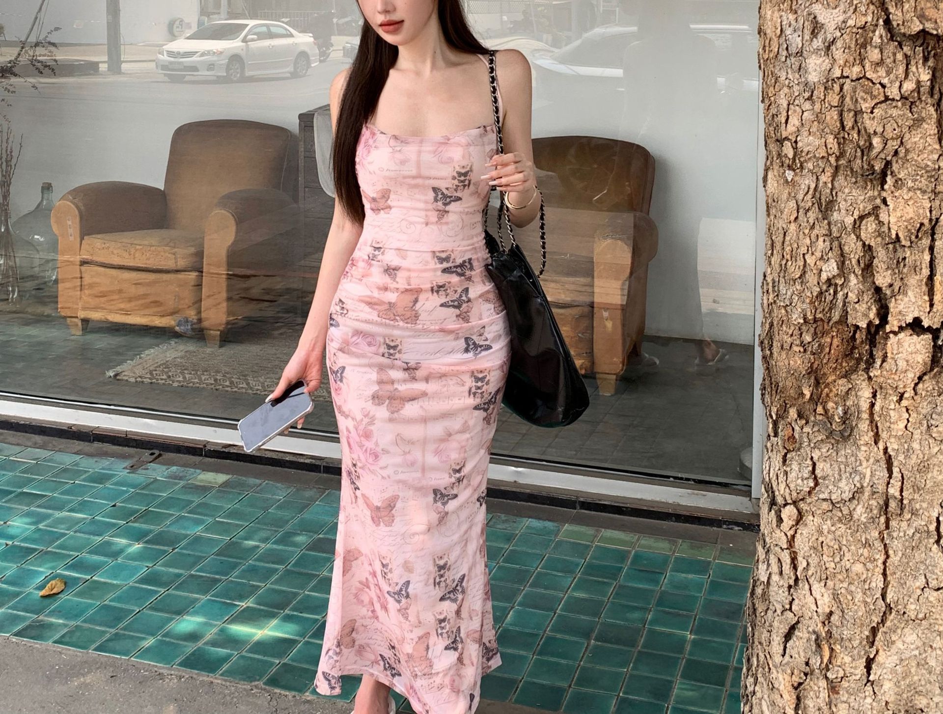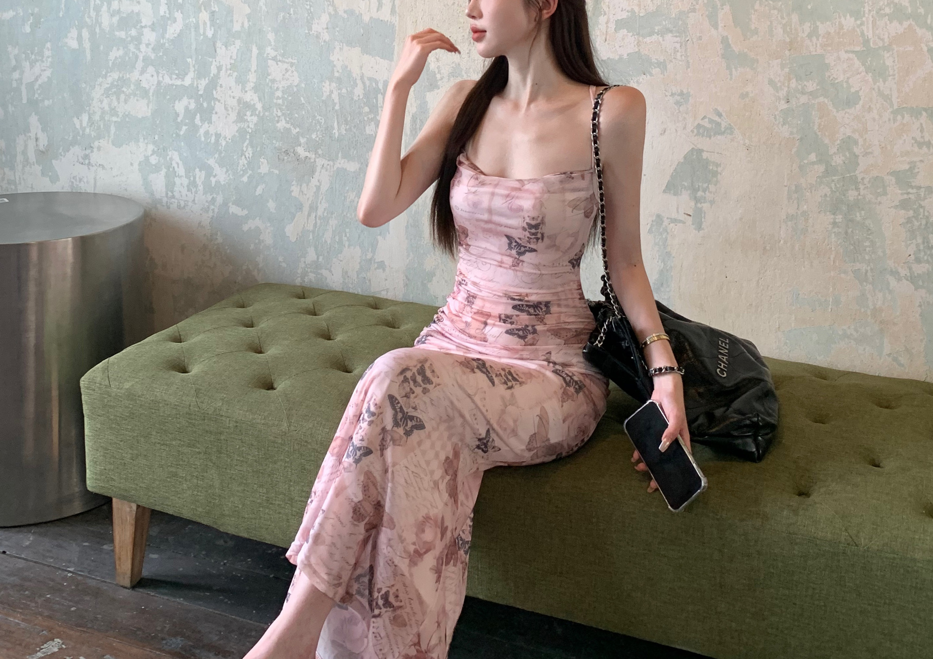 순수한 욕망 스타일 나비 인쇄 섹시한 슬링 원피스 여성의 여름 허리 백리스 스트랩 힙합 스커트 새로운 긴 스커트스토어 가기