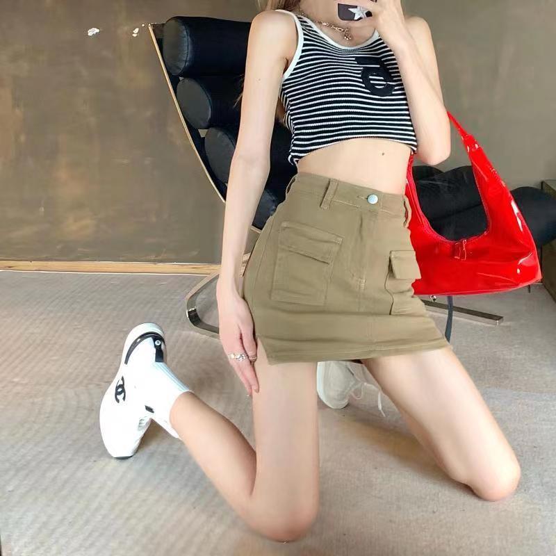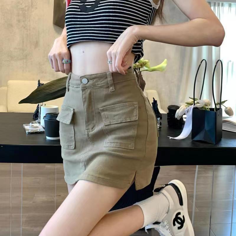 틈새 디자인 감각 카키 데님 엉덩이 치마 여성의 2024 여름 새로운 높은 허리 슬리밍 작업 치마