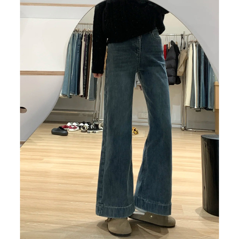 여성용 하이웨이스트 루즈핏 플레어 팬츠, 작은 키에도 잘 어울리는 라인형 체형을 위한 슬림한 스트레이트 데님 팬츠스토어 가기