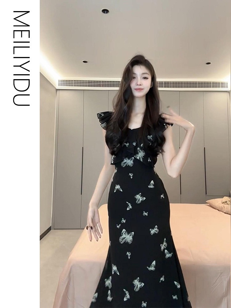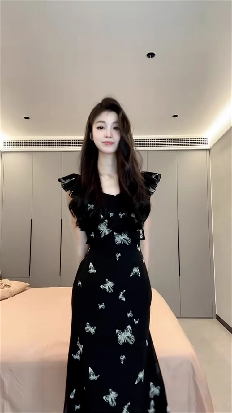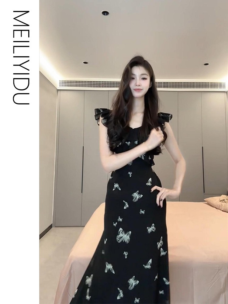 [더블 레이어 + 인테리어] 작은 비행 소매 나비 원피스 어린이 여름 프랑스 기질 아름다운 허리 길이