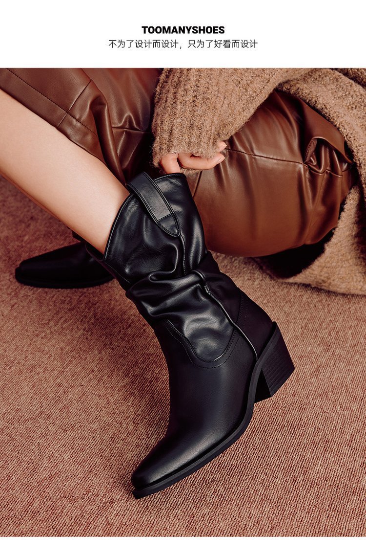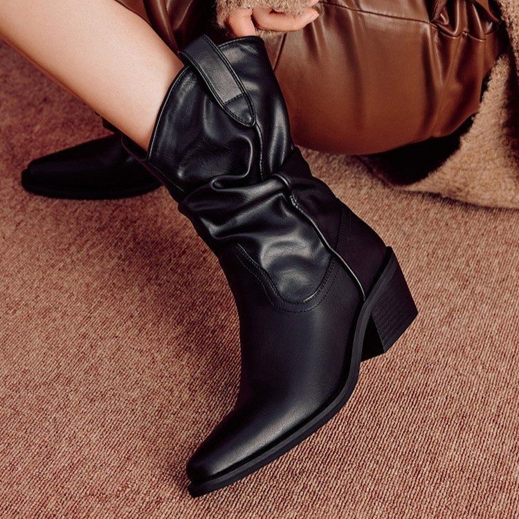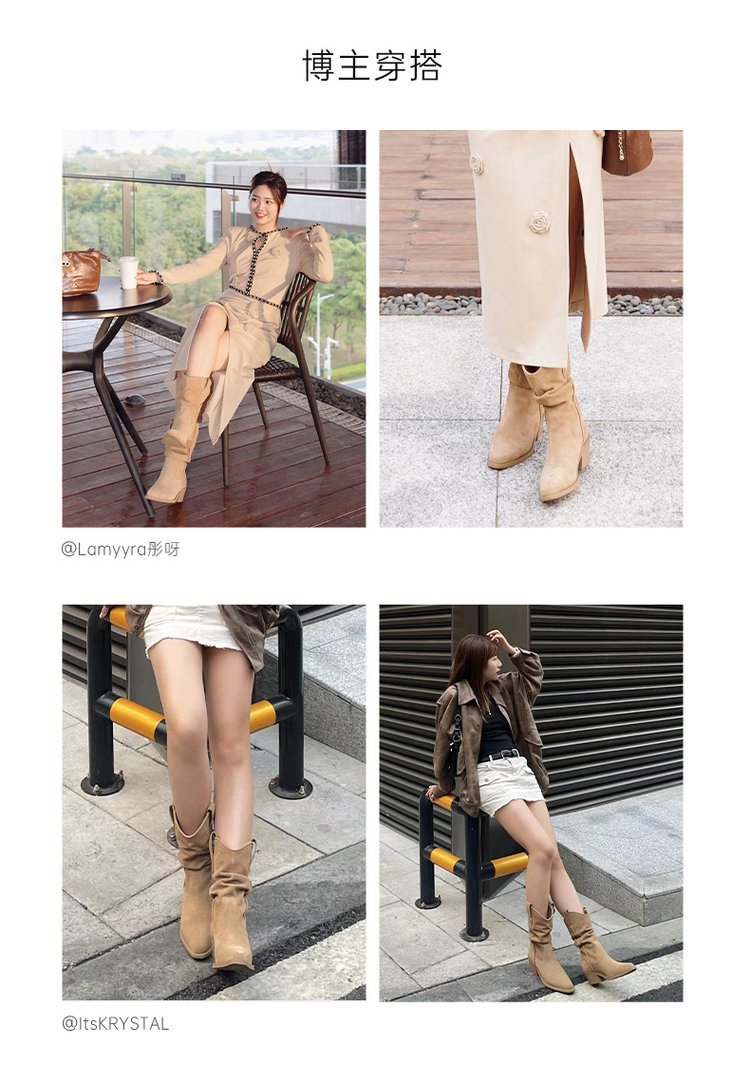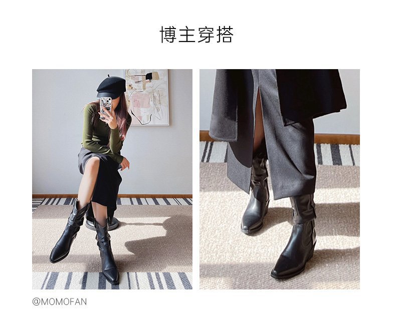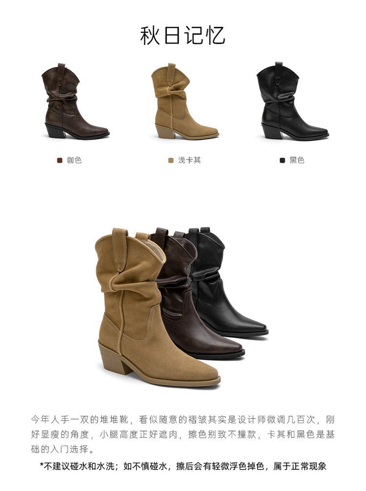 靴子女子秋日记忆中筒骑士靴尖头粗高跟短靴显瘦堆堆靴女