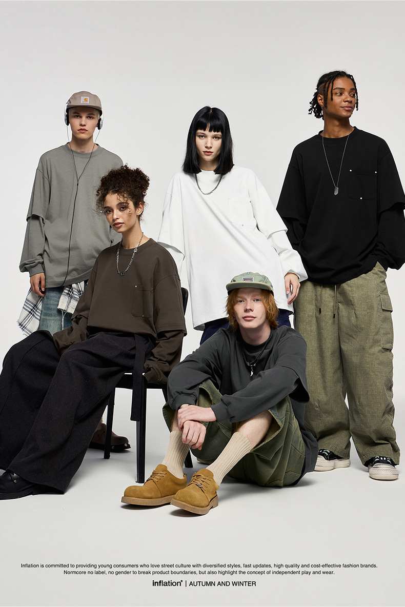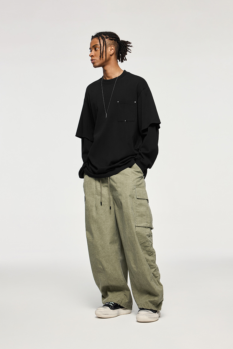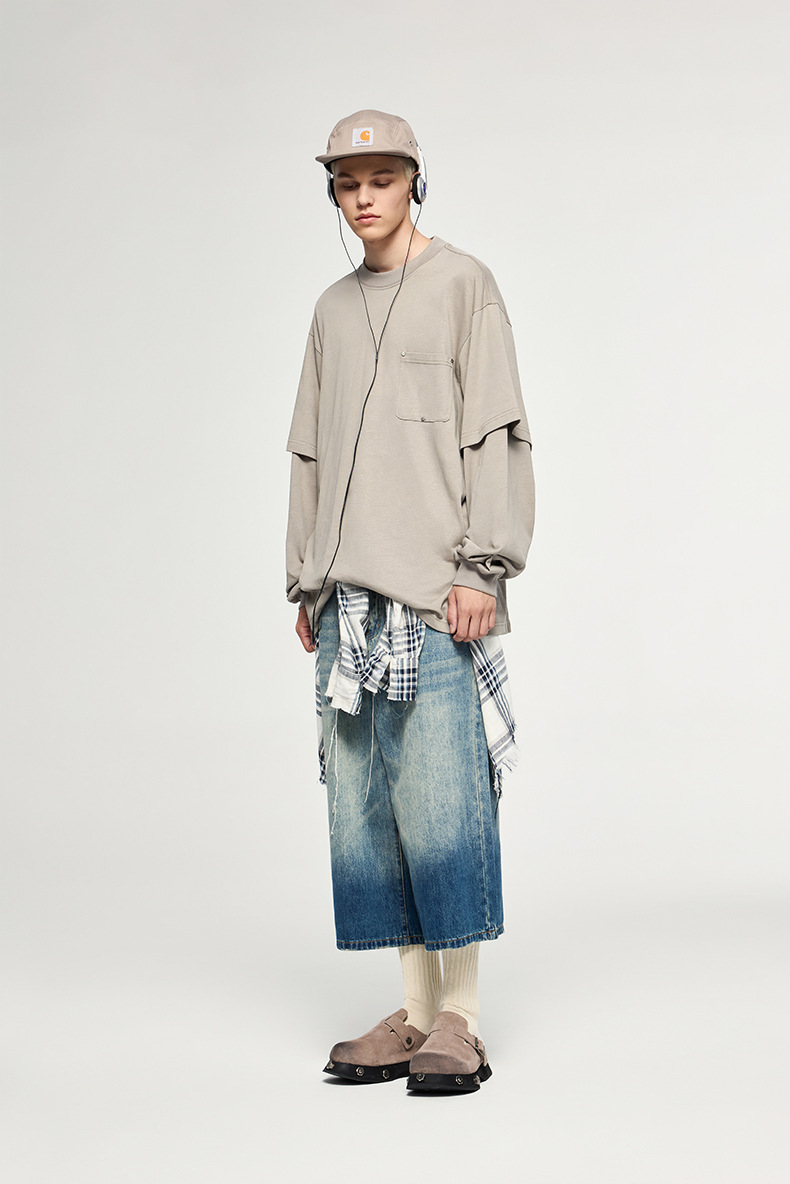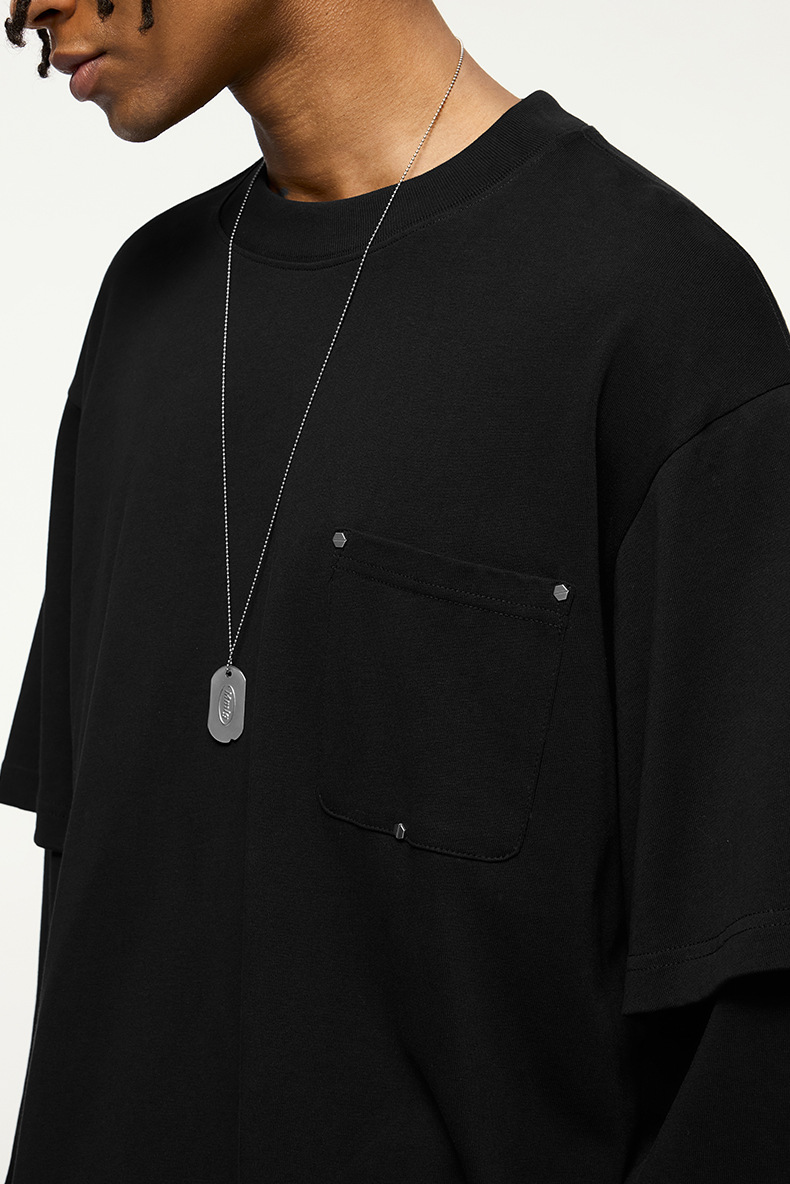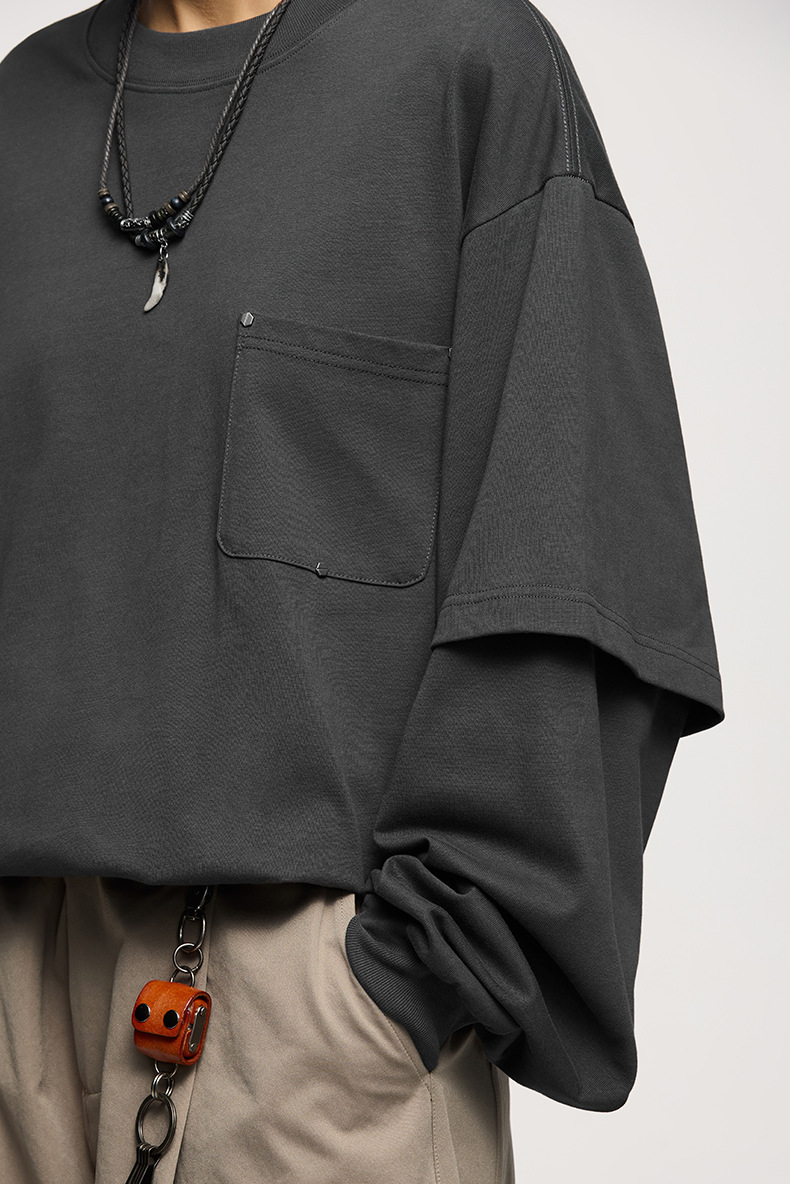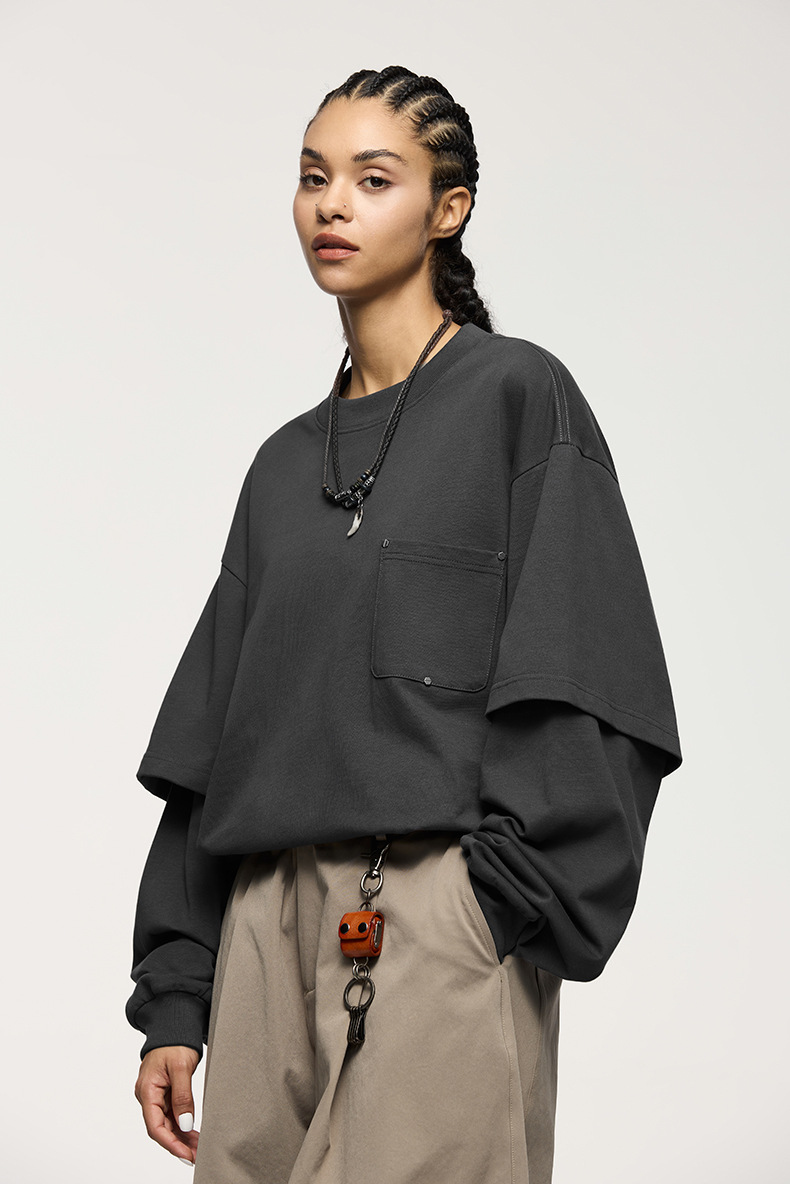 Jie Zhan 남성 의류 | 헤비 265g 스터드 페이크 투피스 긴팔 티셔츠 2025 가을 트렌디 브랜드 스크류 리벳 포켓스토어 가기