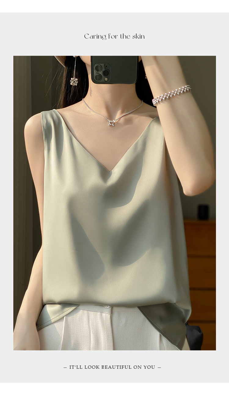 여성 캐미솔 실크 새틴 더블 숄더 스트랩 봄 여름 신작 슬림 브이넥 쇼트 이너 탑 티셔츠 트렌디