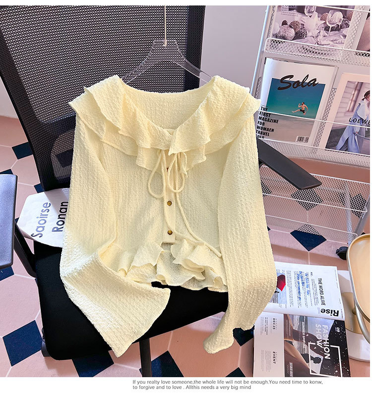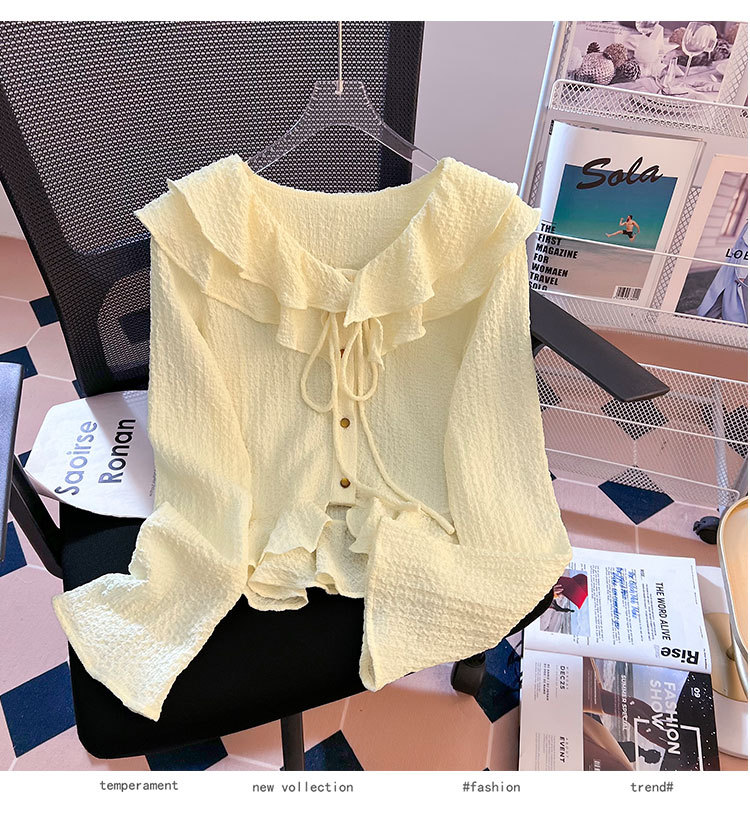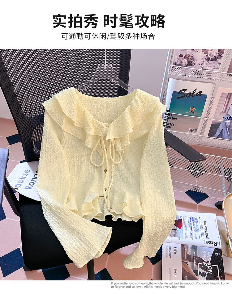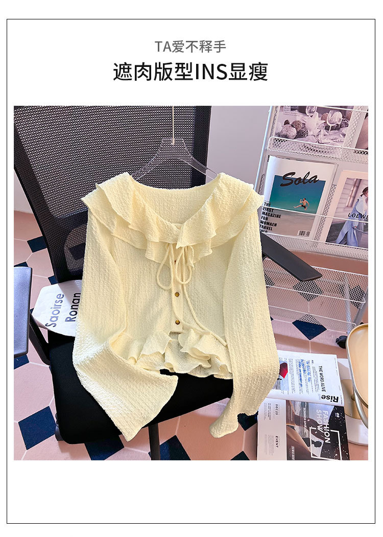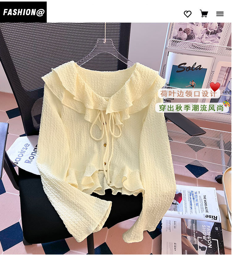 단색 뿔 소매 긴 소매 카디건 가을 새로운 프랑스 부드러운 진주 버클 주름 기질 탑 도매