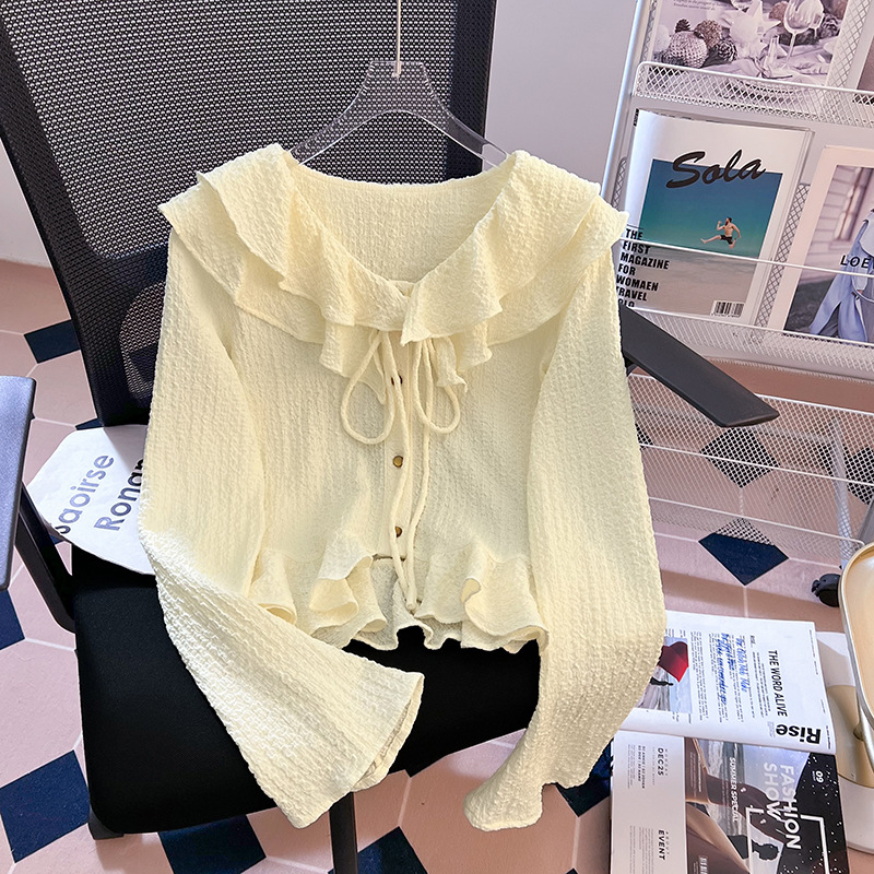 단색 뿔 소매 긴 소매 카디건 가을 새로운 프랑스 부드러운 진주 버클 주름 기질 탑 도매스토어 가기
