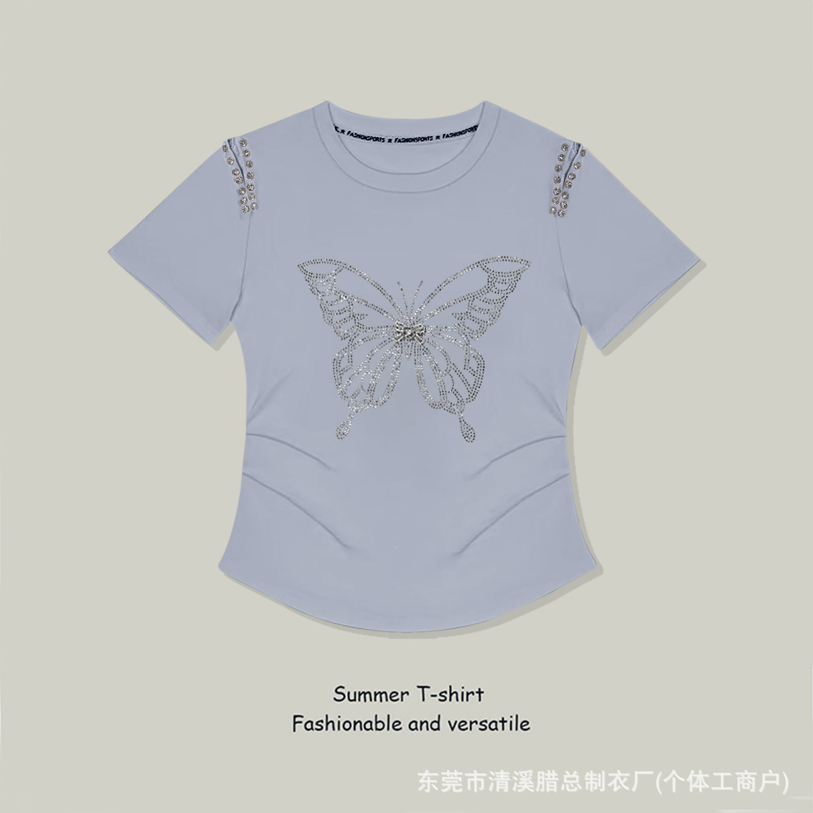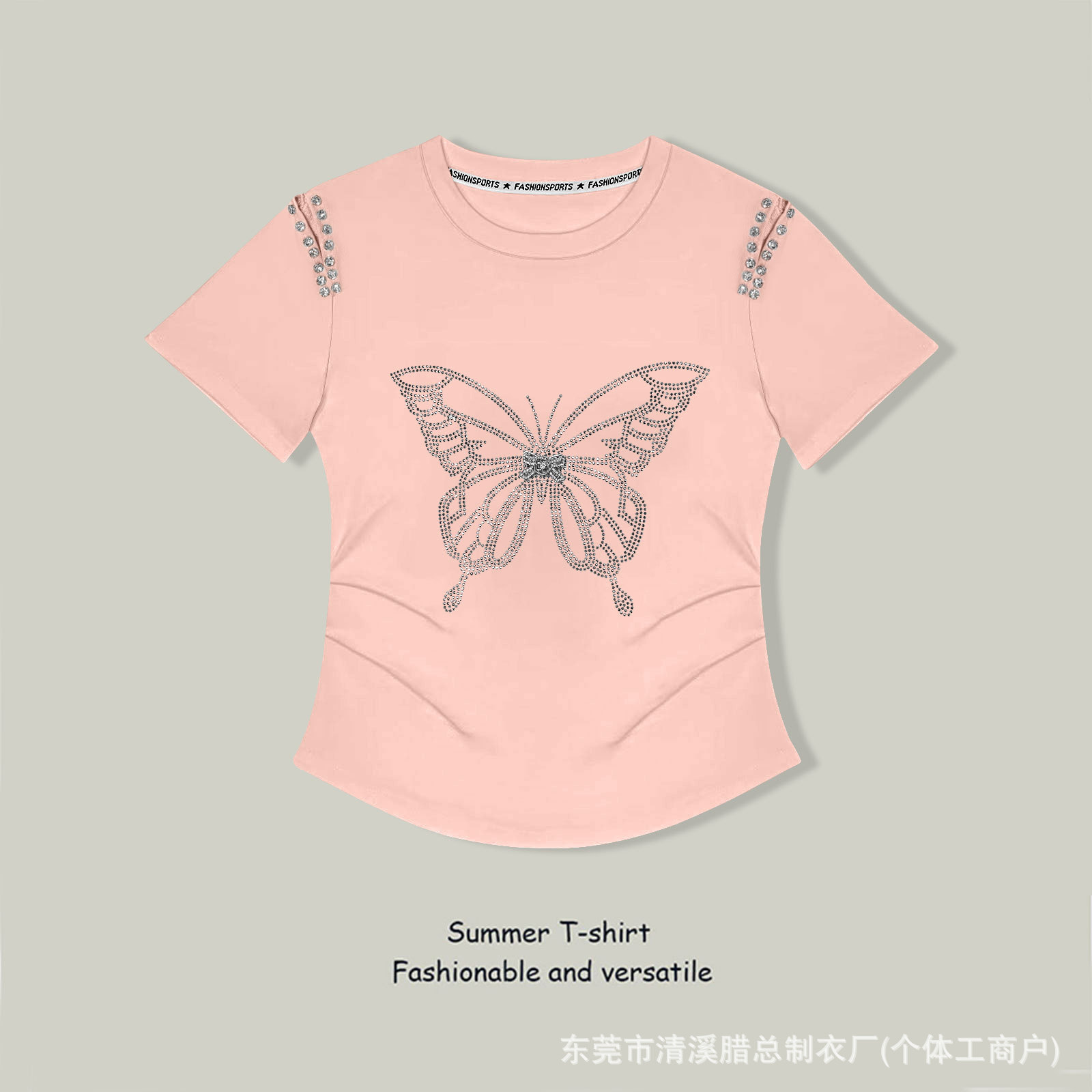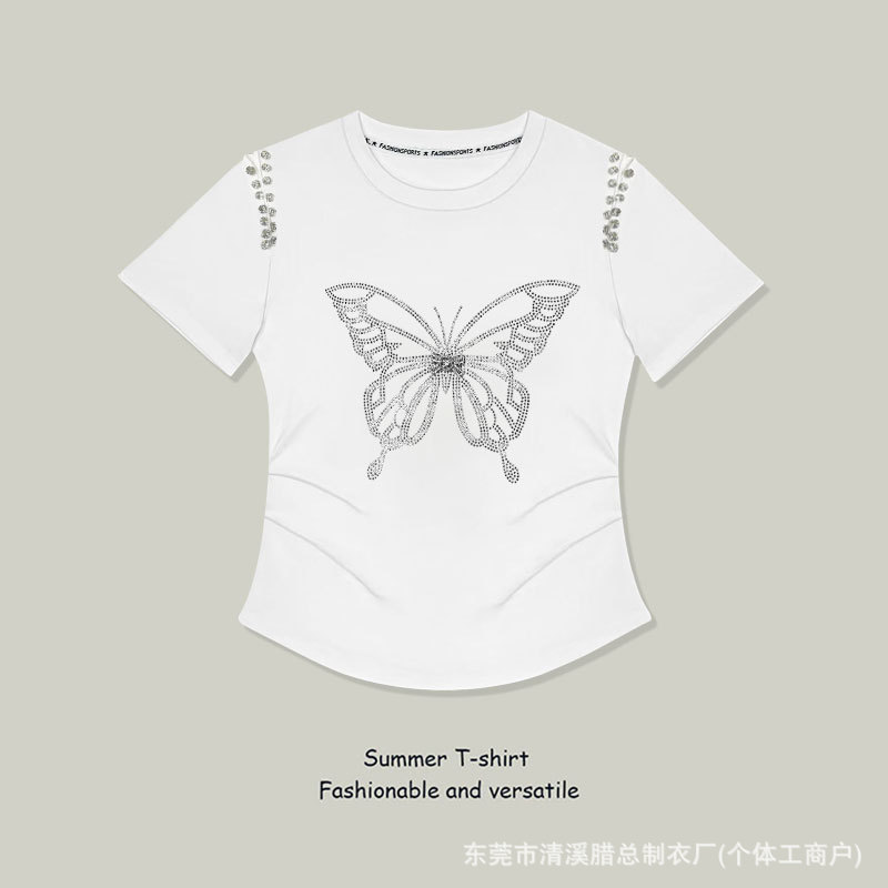 공장 직접 공급 높은 등급 100% 면 여름 둥근 목 나비 모조 다이아몬드 짧은 소매 티셔츠 여성 패션 재킷 여성 의류스토어 가기