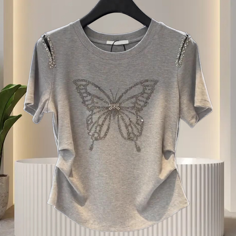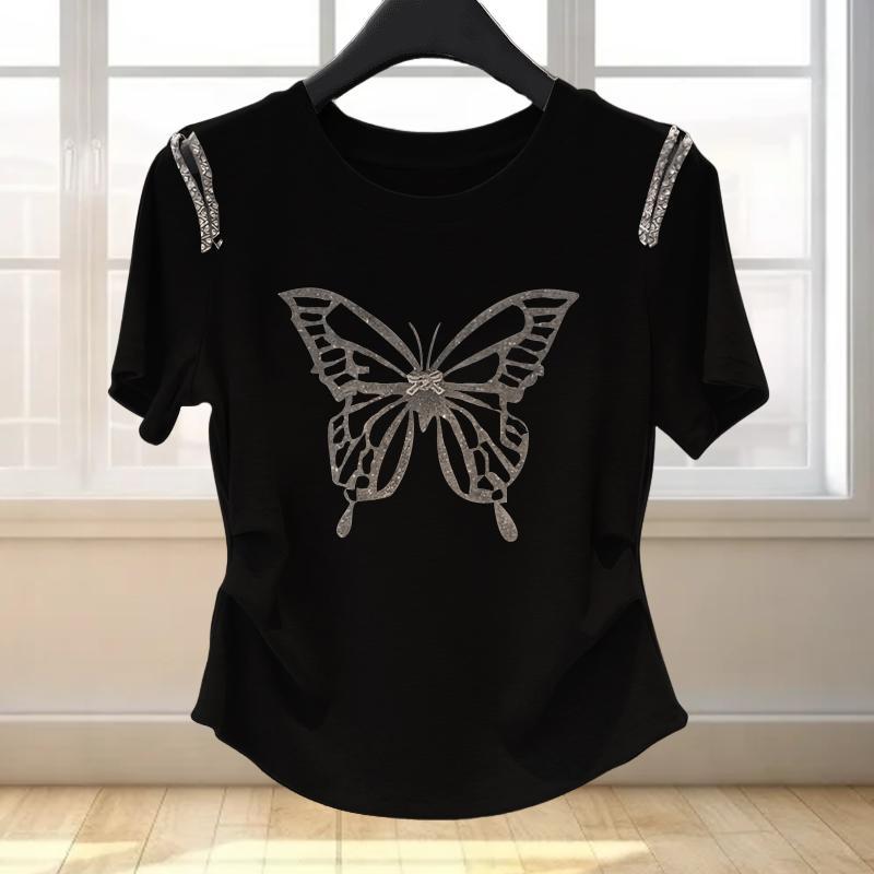공장 직접 공급 높은 등급 100% 면 여름 둥근 목 나비 모조 다이아몬드 짧은 소매 티셔츠 여성 패션 재킷 여성 의류