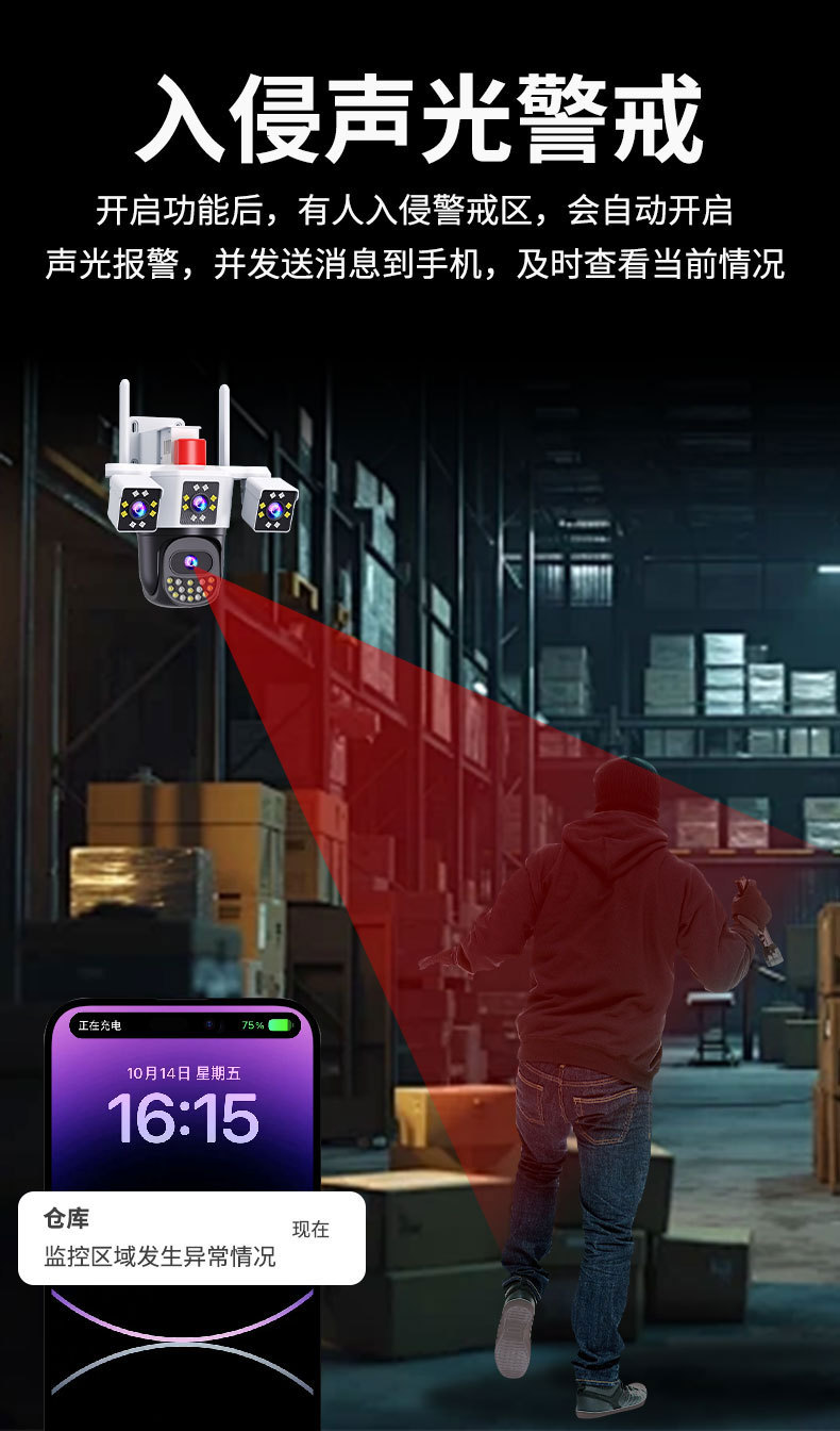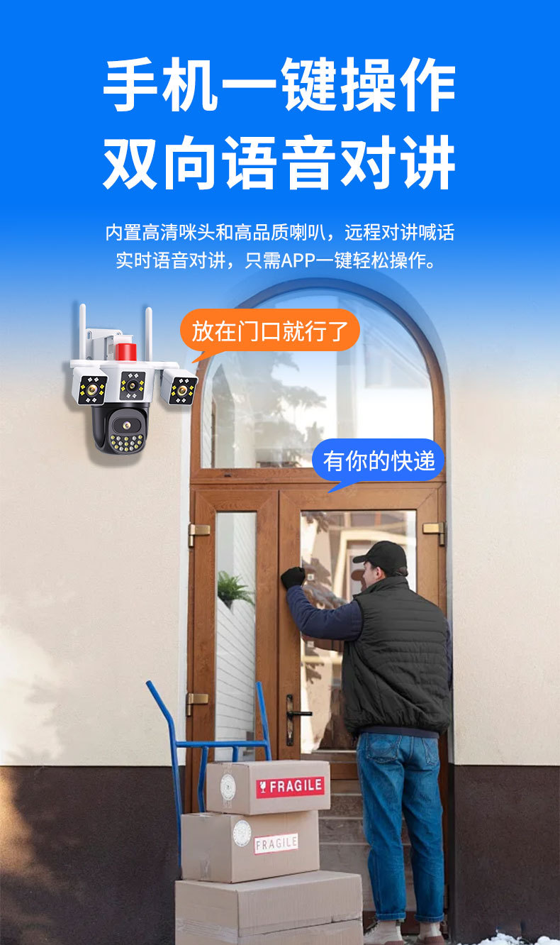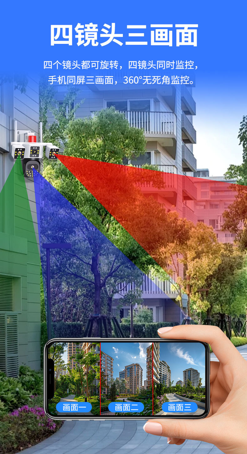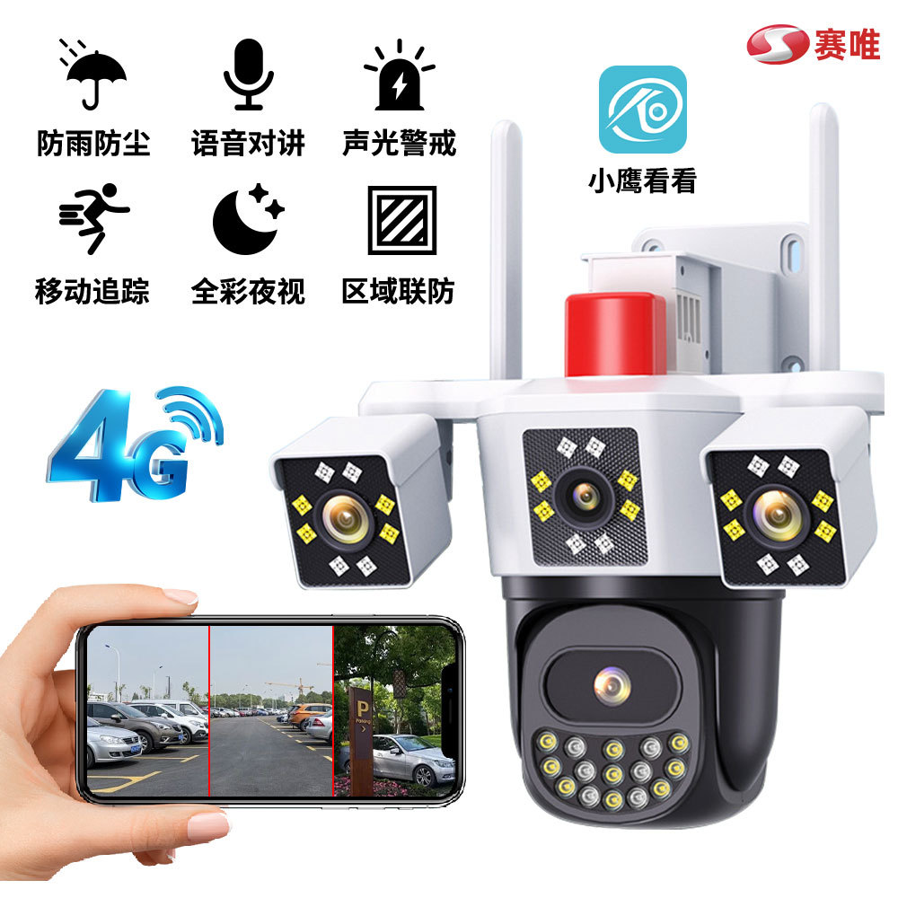 웨이파이 4G 야외 3중 렌즈 3중 화면 감시 카메라, 휴대폰 원격 고화질, 연못/과수원 음성 인터콤
