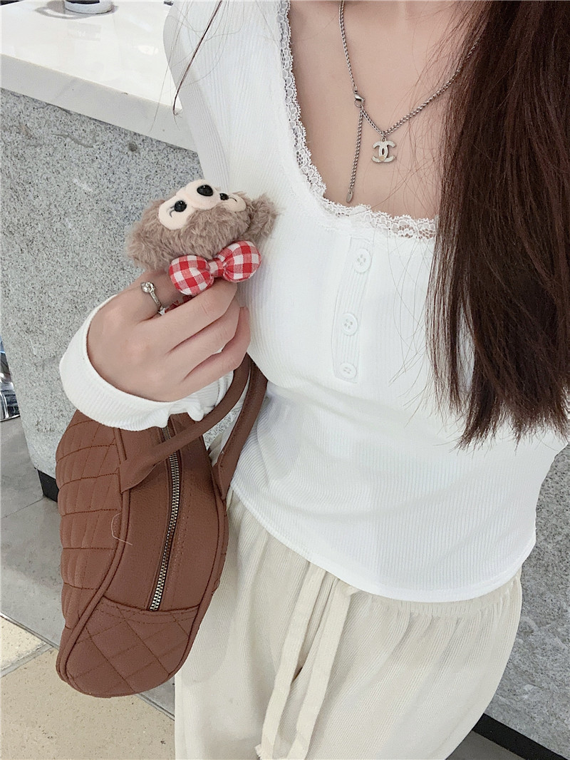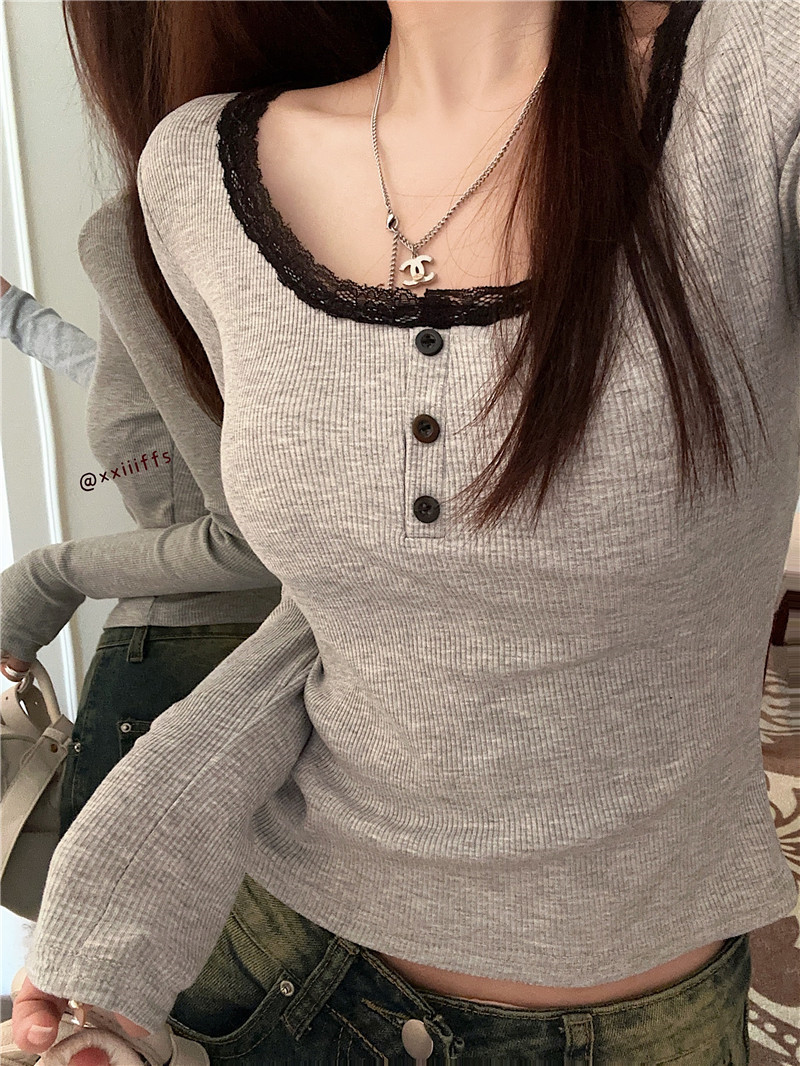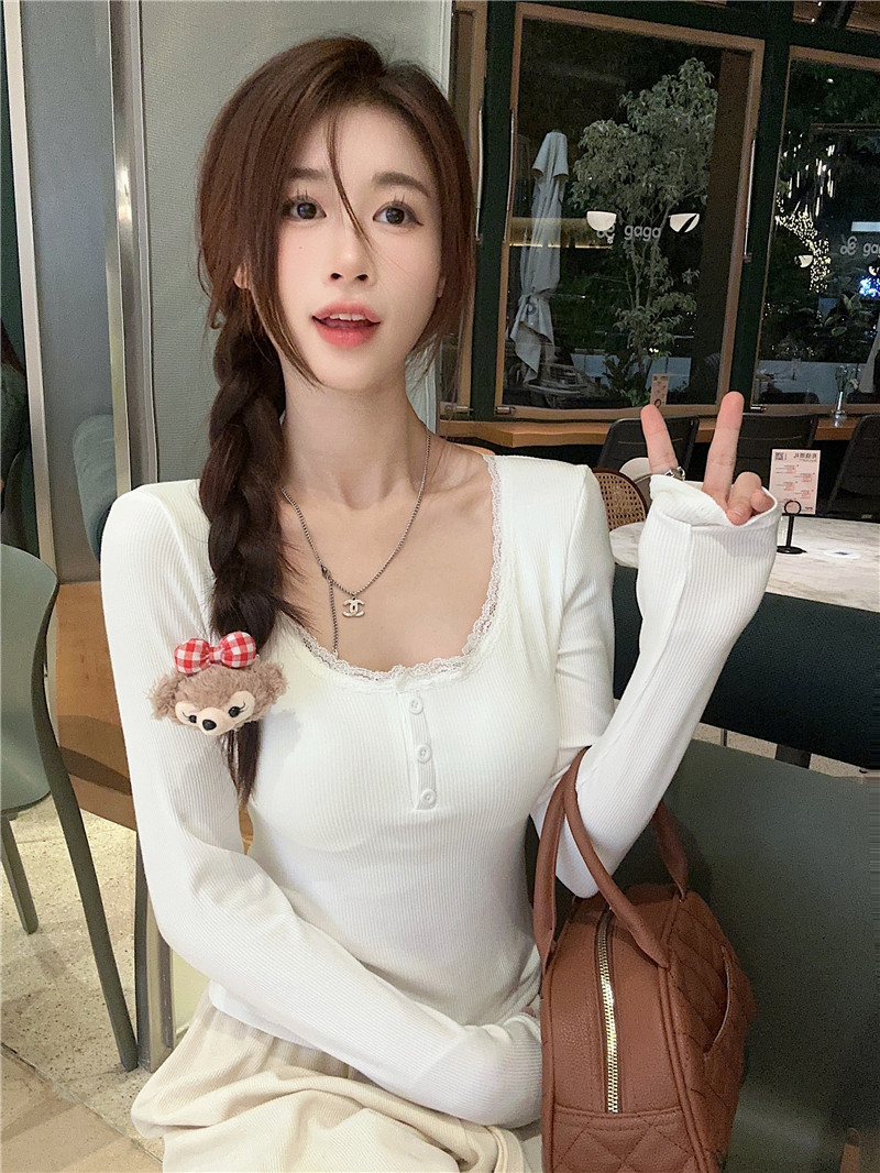 가을 아름다운 순수한 욕망 레이스 슬리밍 양털베이스 셔츠 여성의 내부 긴 소매 티셔츠 프론트 숄더 스퀘어 칼라 탑