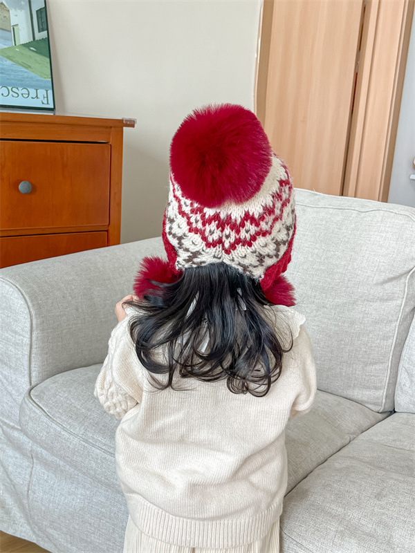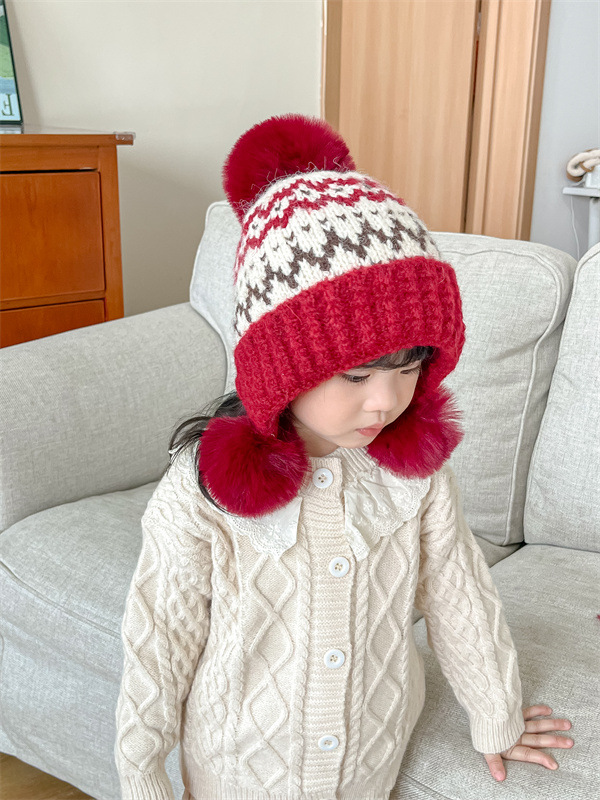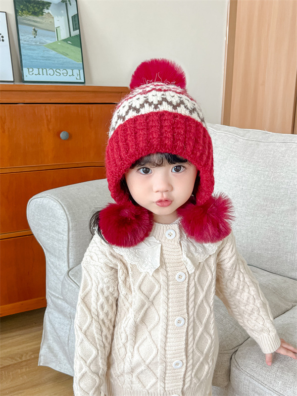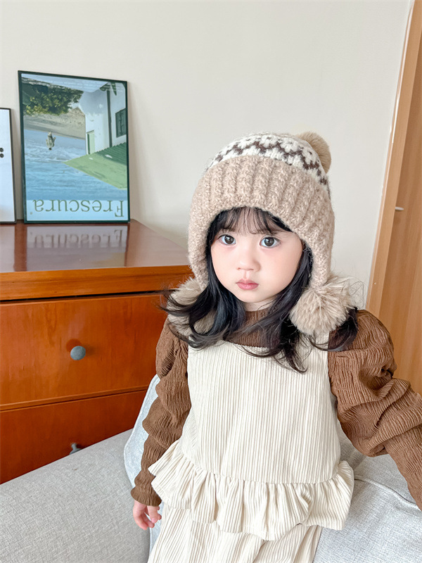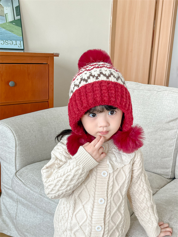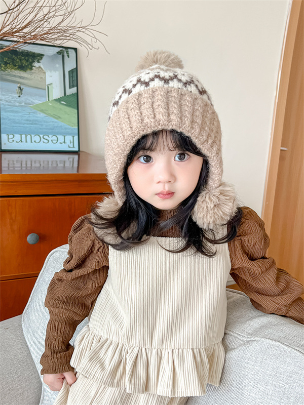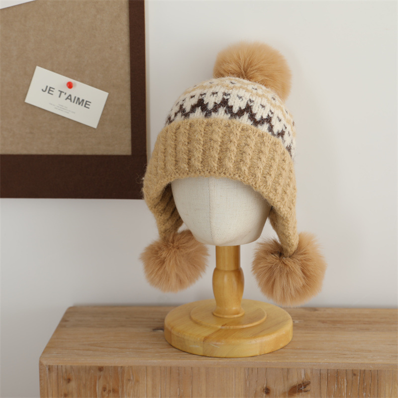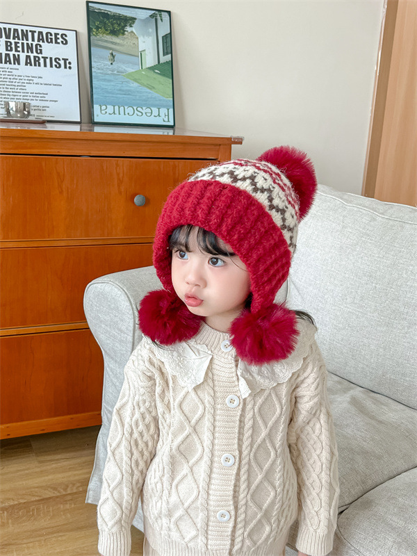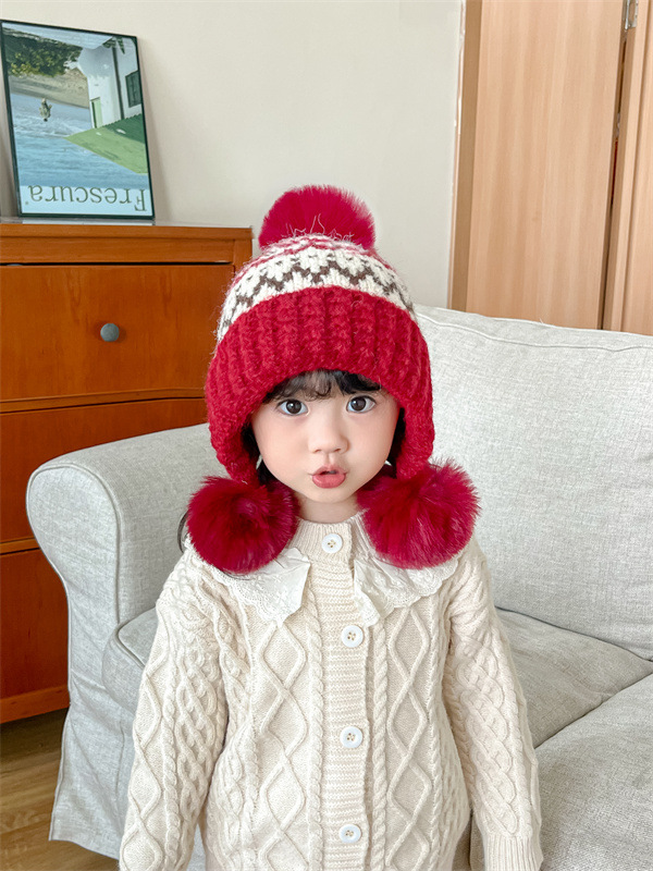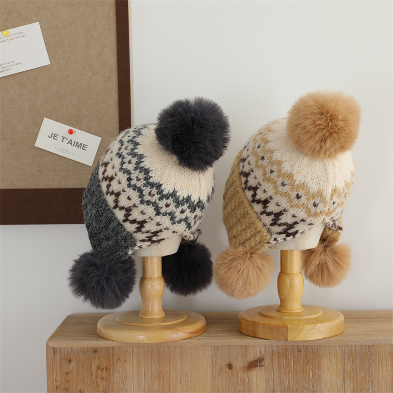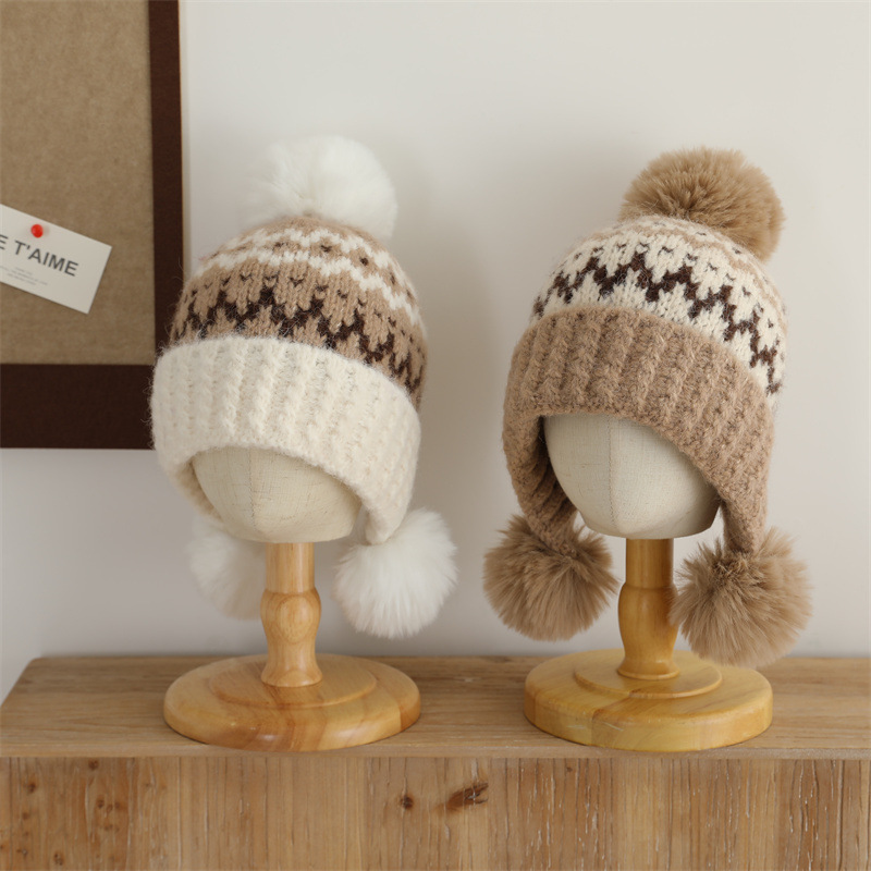 빈티지 마일 라드 어린이 울 모자 여성의 가을과 겨울 따뜻한 귀 보호 캐주얼 콜드 모자 모피 볼 두꺼운 라인 아기 니트 모자