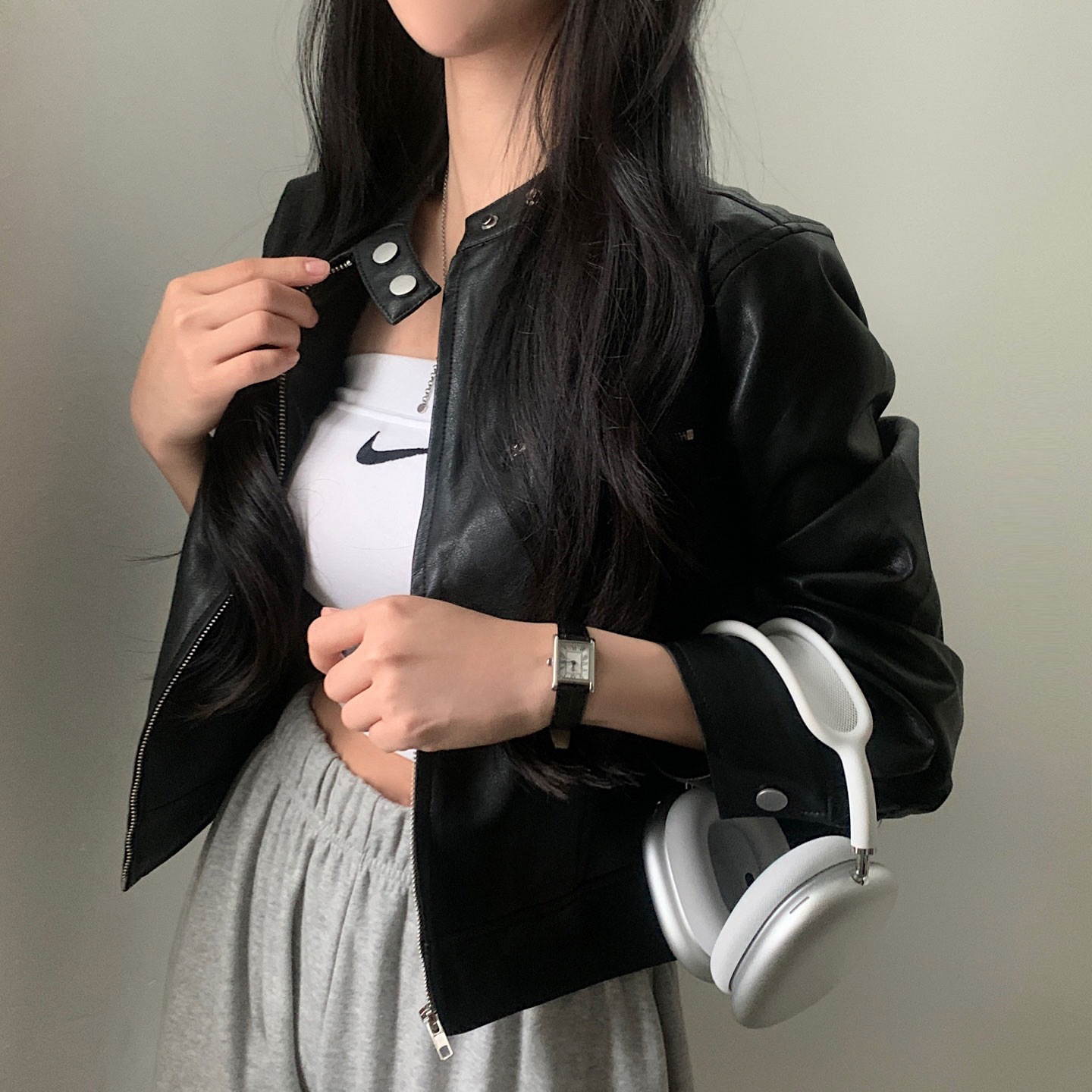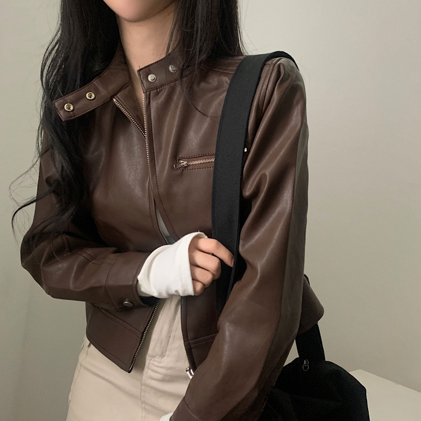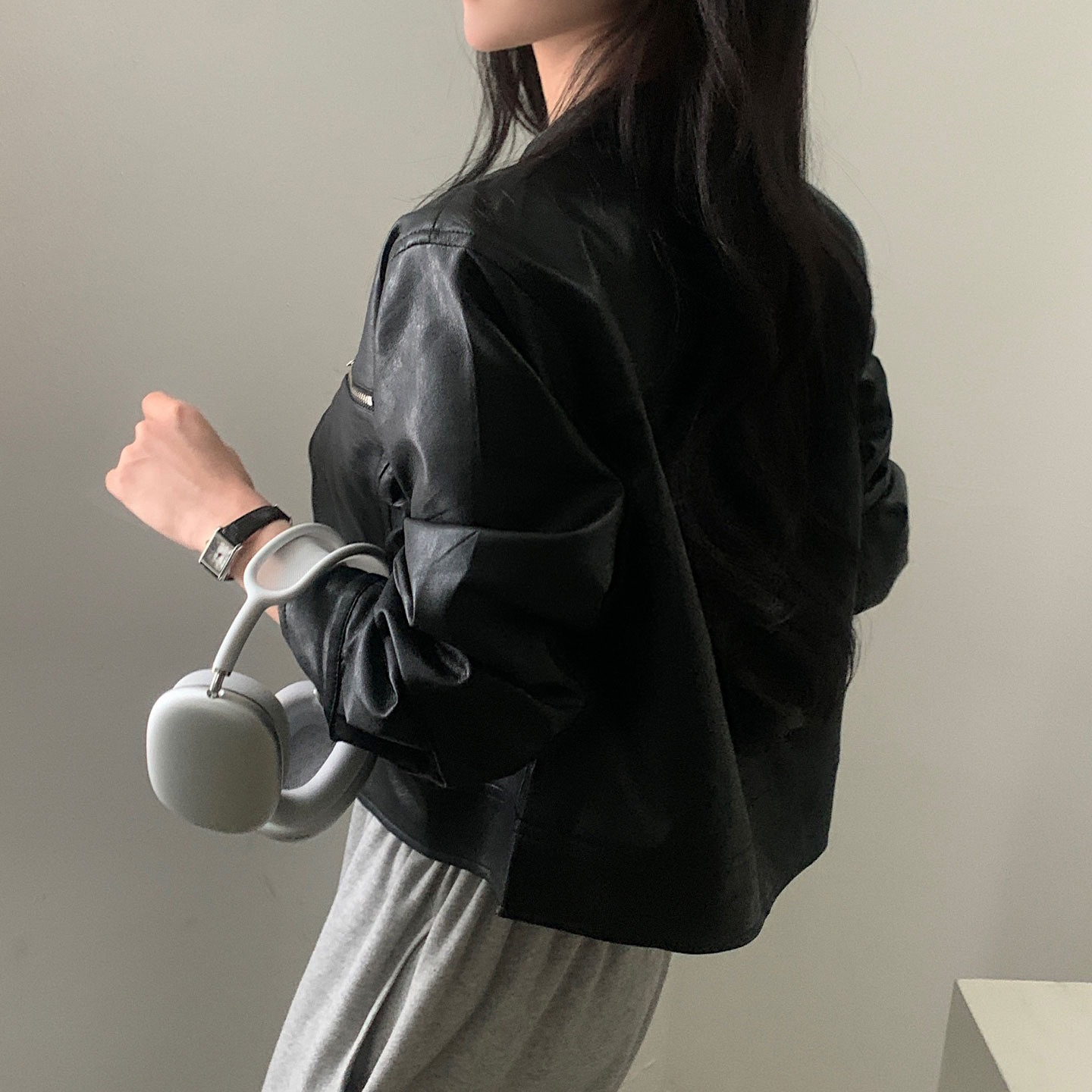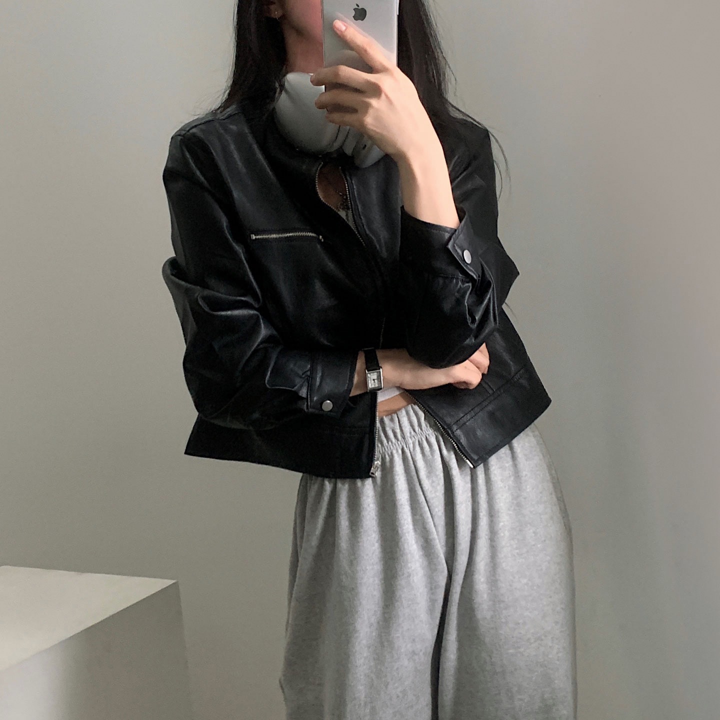 한국 세련된 가을과 겨울 빈티지 잘 생긴 둥근 목 지퍼 PU 가죽 느슨한 올매치 긴 소매 가죽 자켓 코트 여성스토어 가기