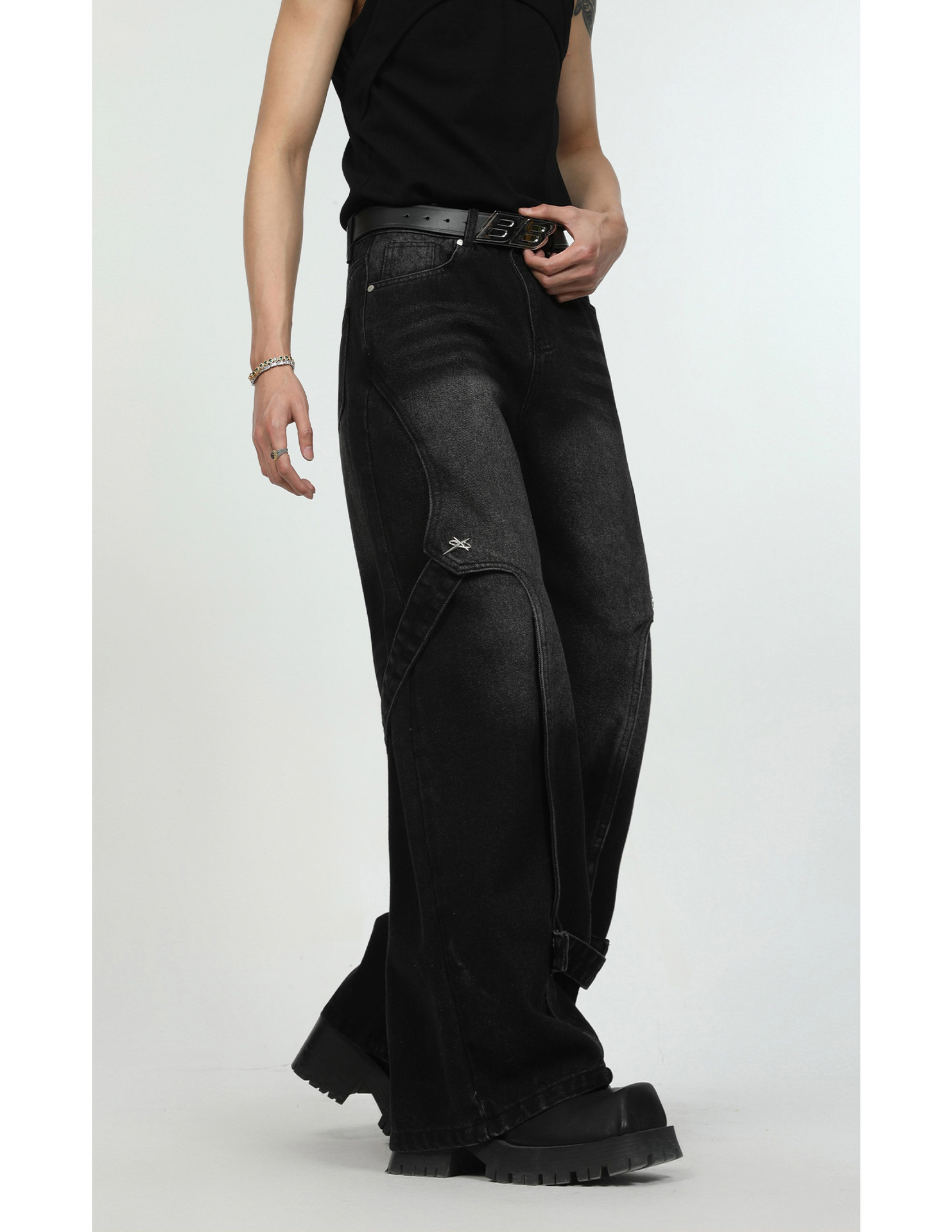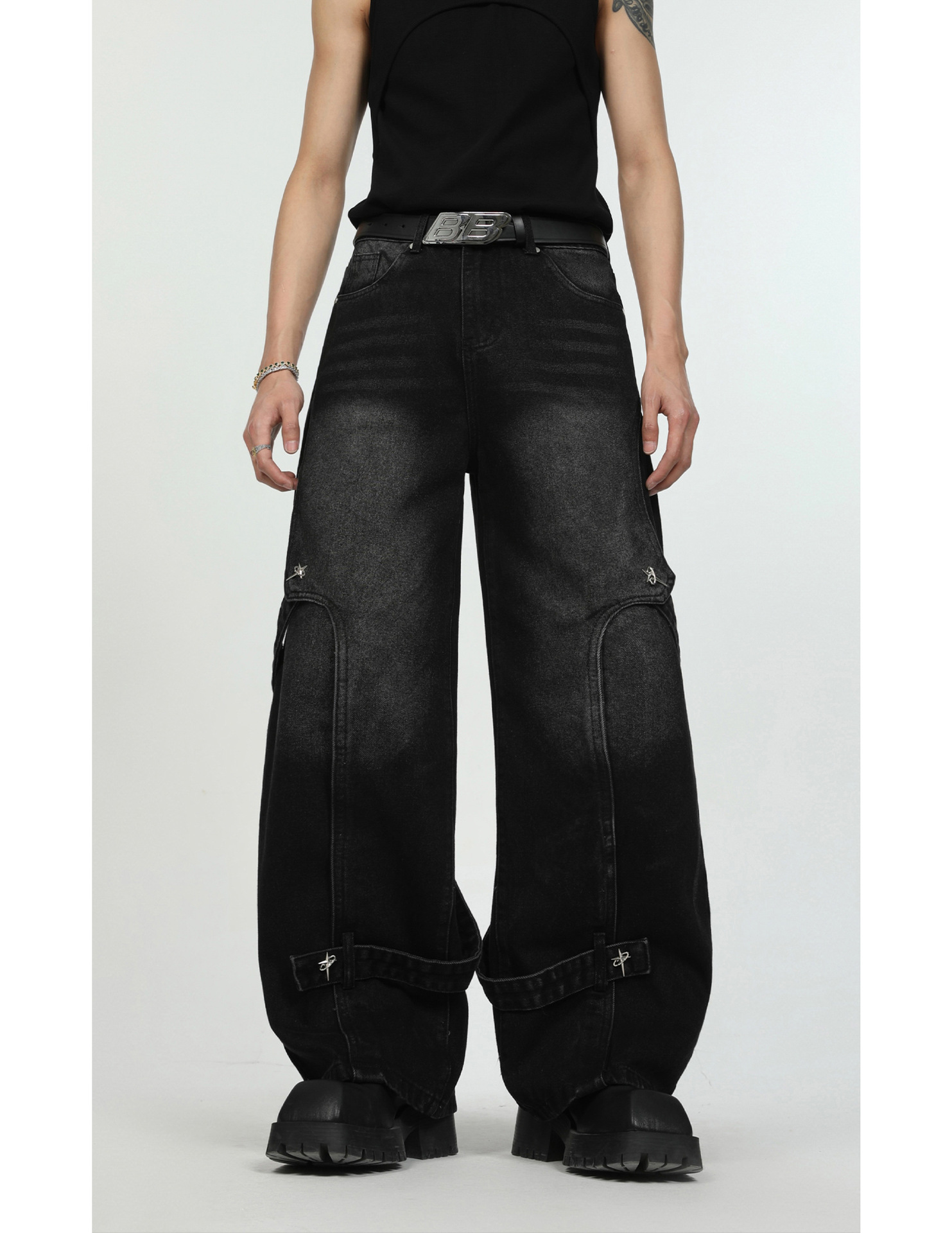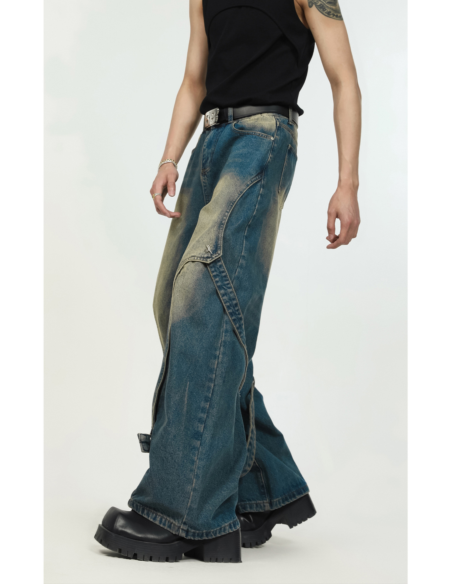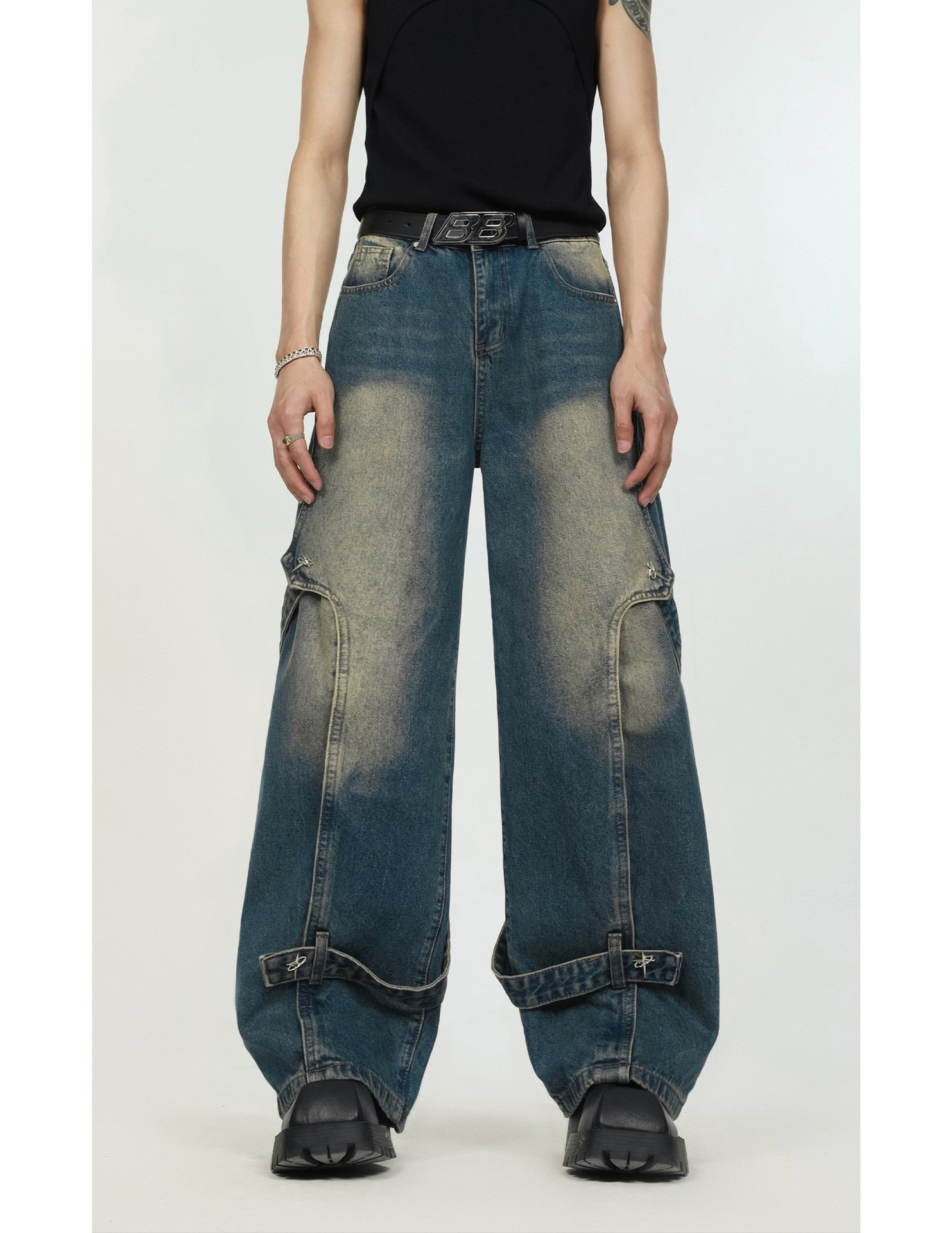 미국식 바이브 마이크로 스트랩 앤티크 청바지 남성과 여성의 느슨한 스트레이트 레트로 틈새 할란 바지