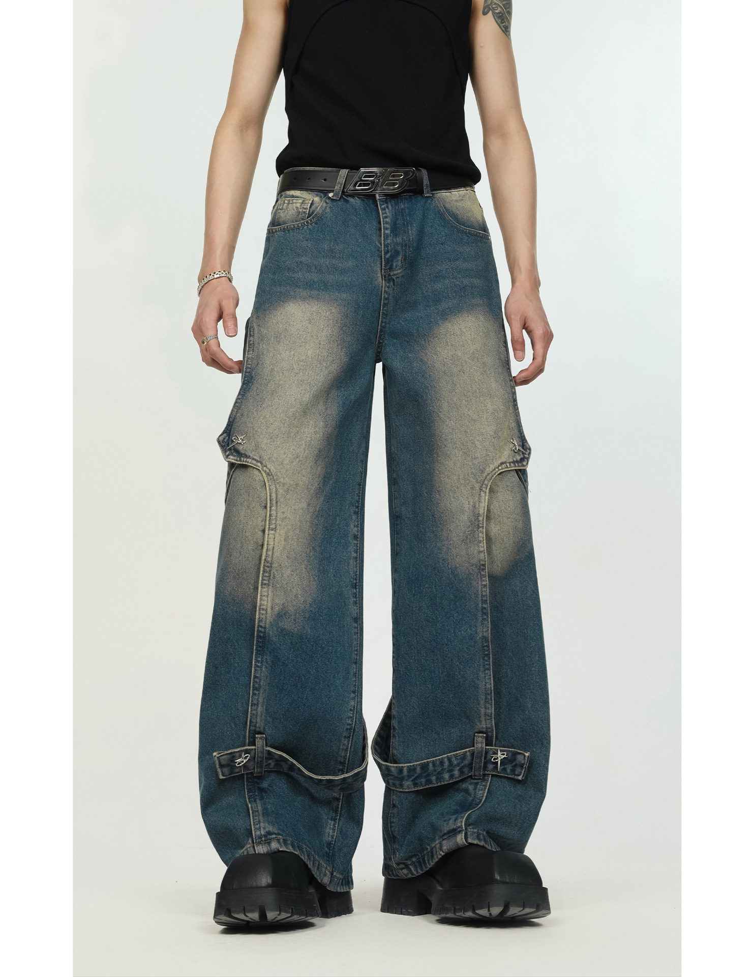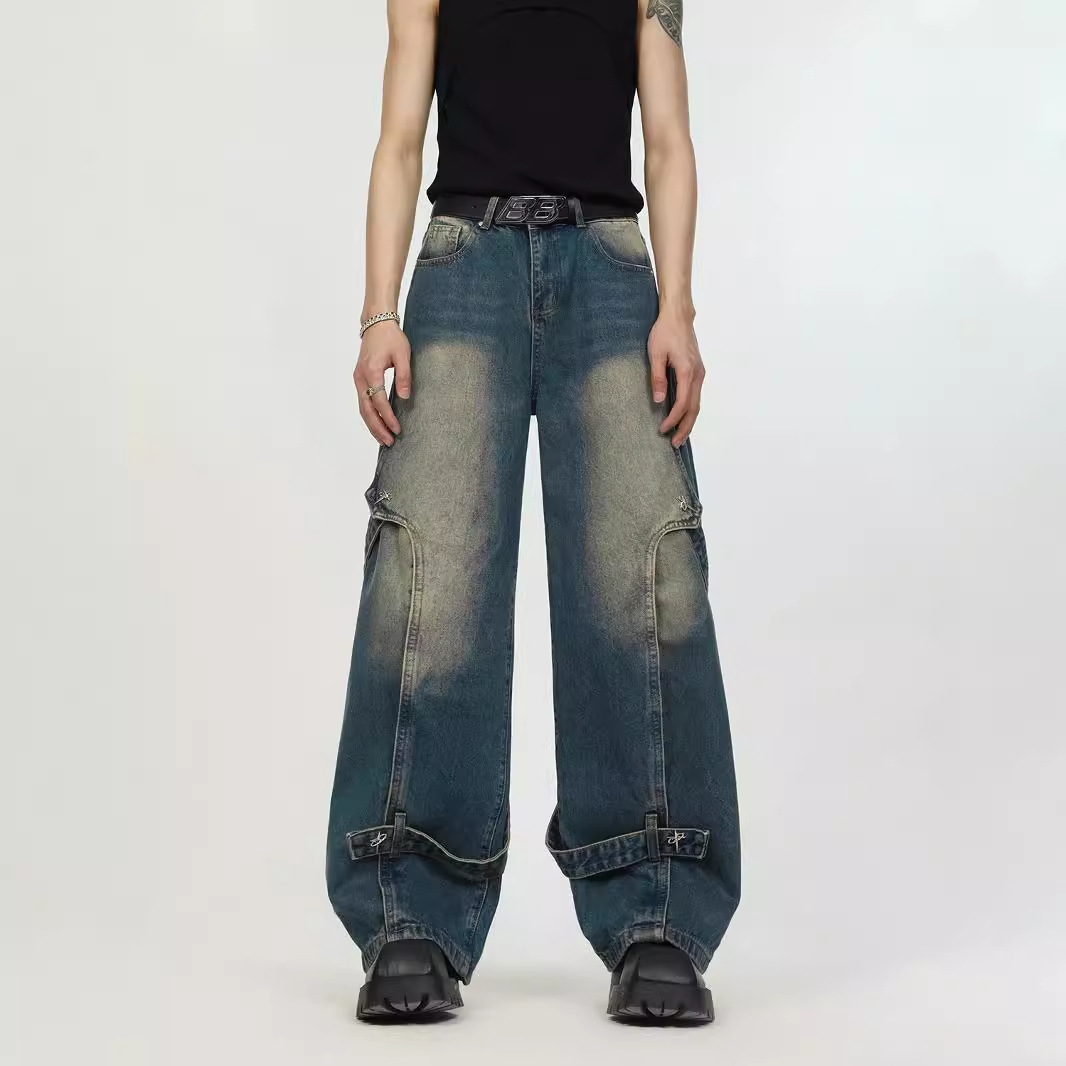 미국식 바이브 마이크로 스트랩 앤티크 청바지 남성과 여성의 느슨한 스트레이트 레트로 틈새 할란 바지스토어 가기