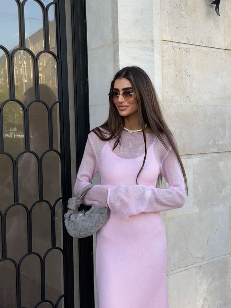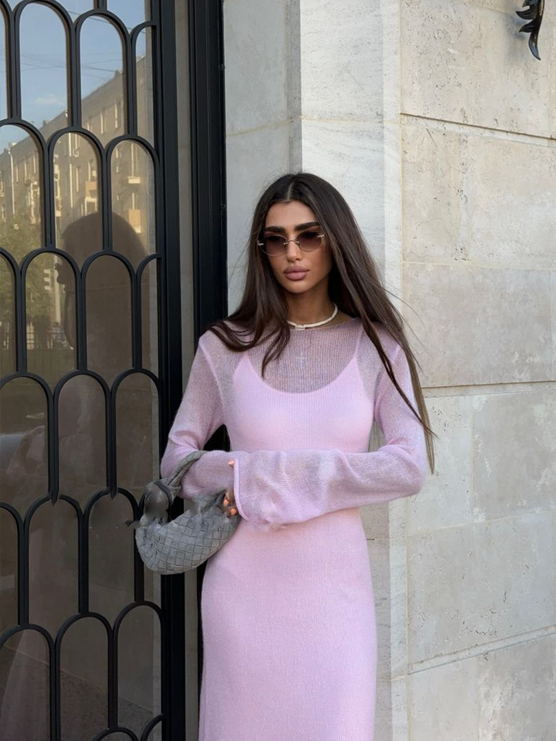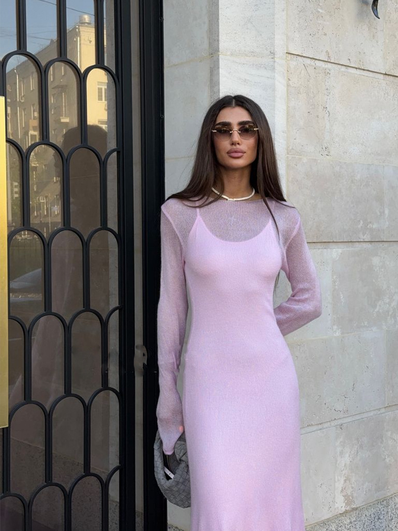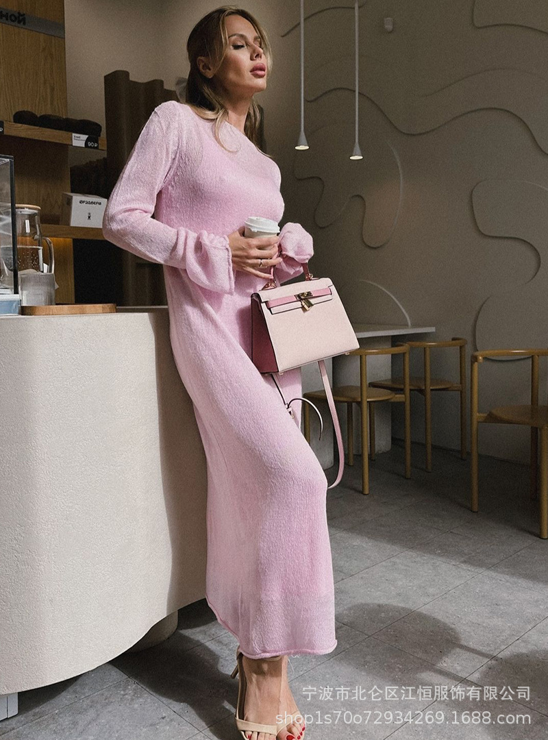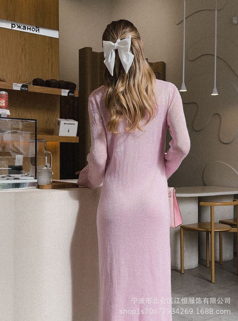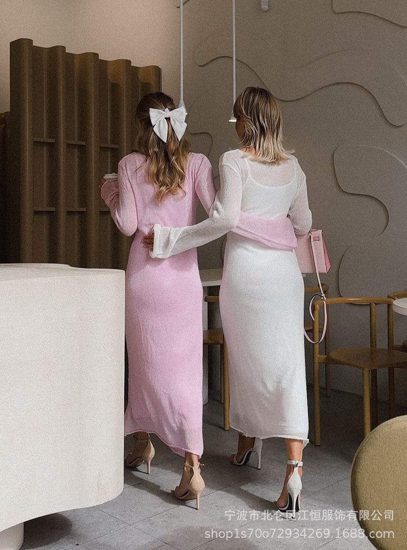 2025 중공 핑크 힙 커버 니트 롱 스커트 유럽과 미국의 시스루 슬림 드레스 + 베스트 드레스 투피스 세트스토어 가기